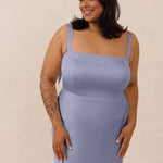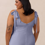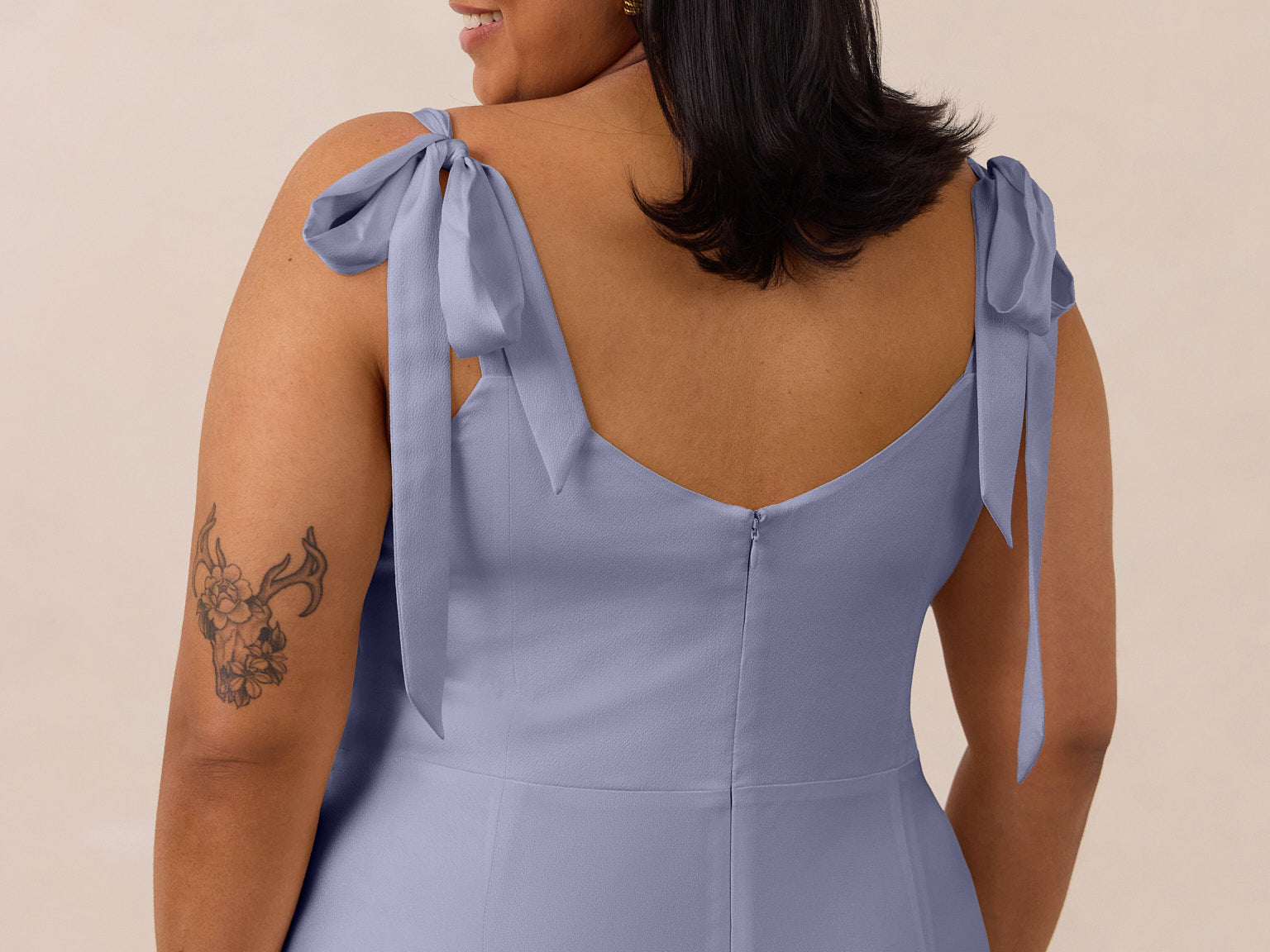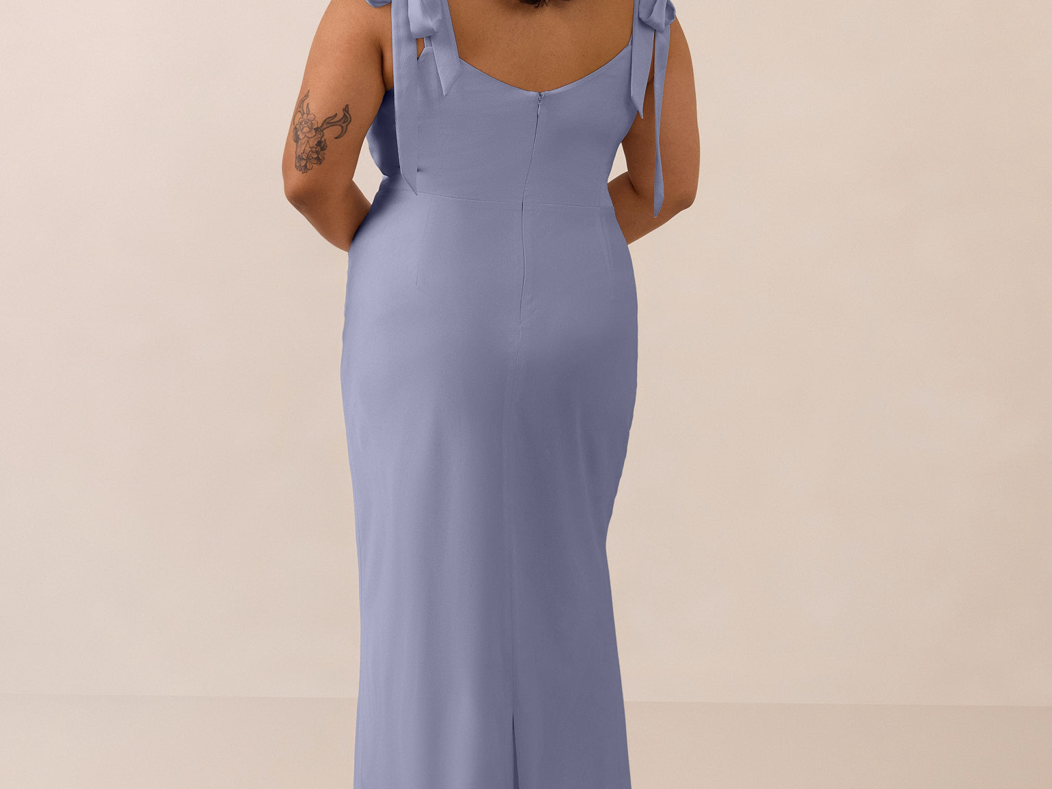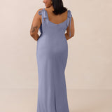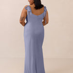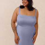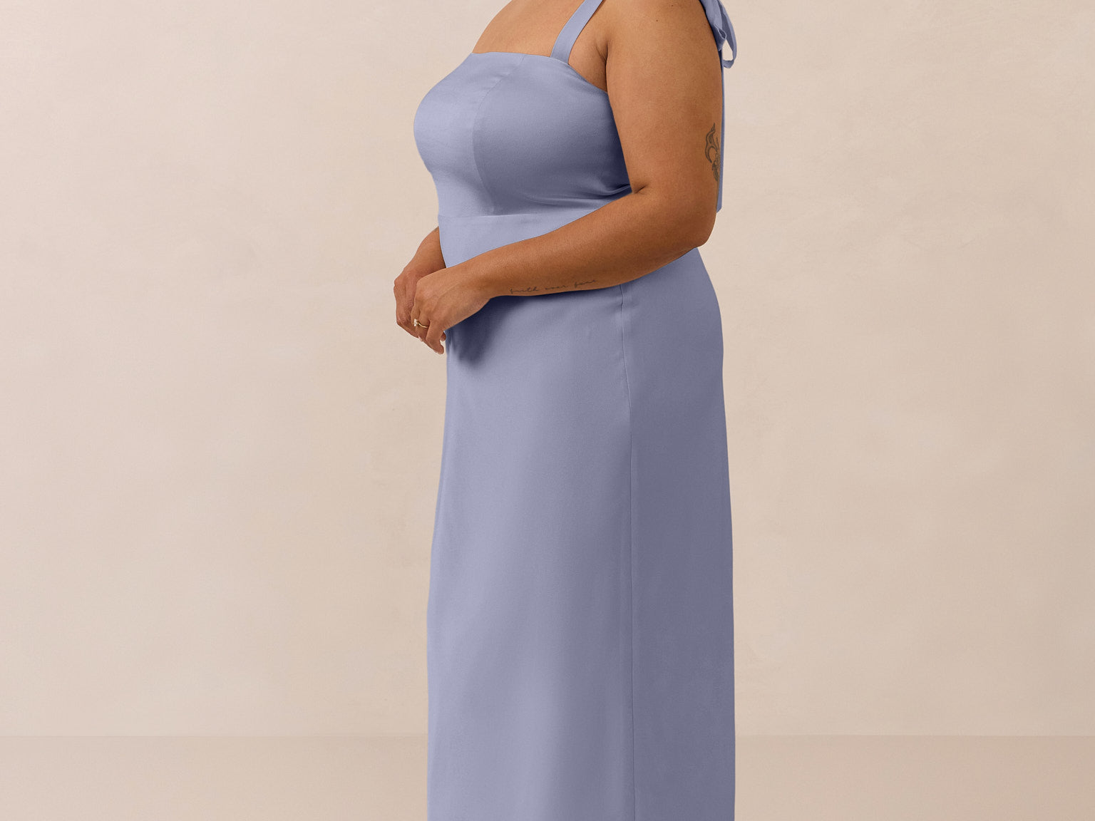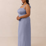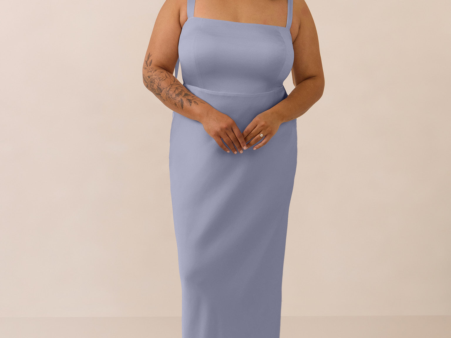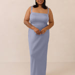 This full-length dress, made from luxurious satin, features a sleek square neckline and thick tie straps, offering a structured yet effortless aesthetic. The slim-fit skirt gently embraces the body, creating a smooth and elongated silhouette. An invisible back zipper ensures a seamless finish, making this dress ideal for sophisticated evening events.