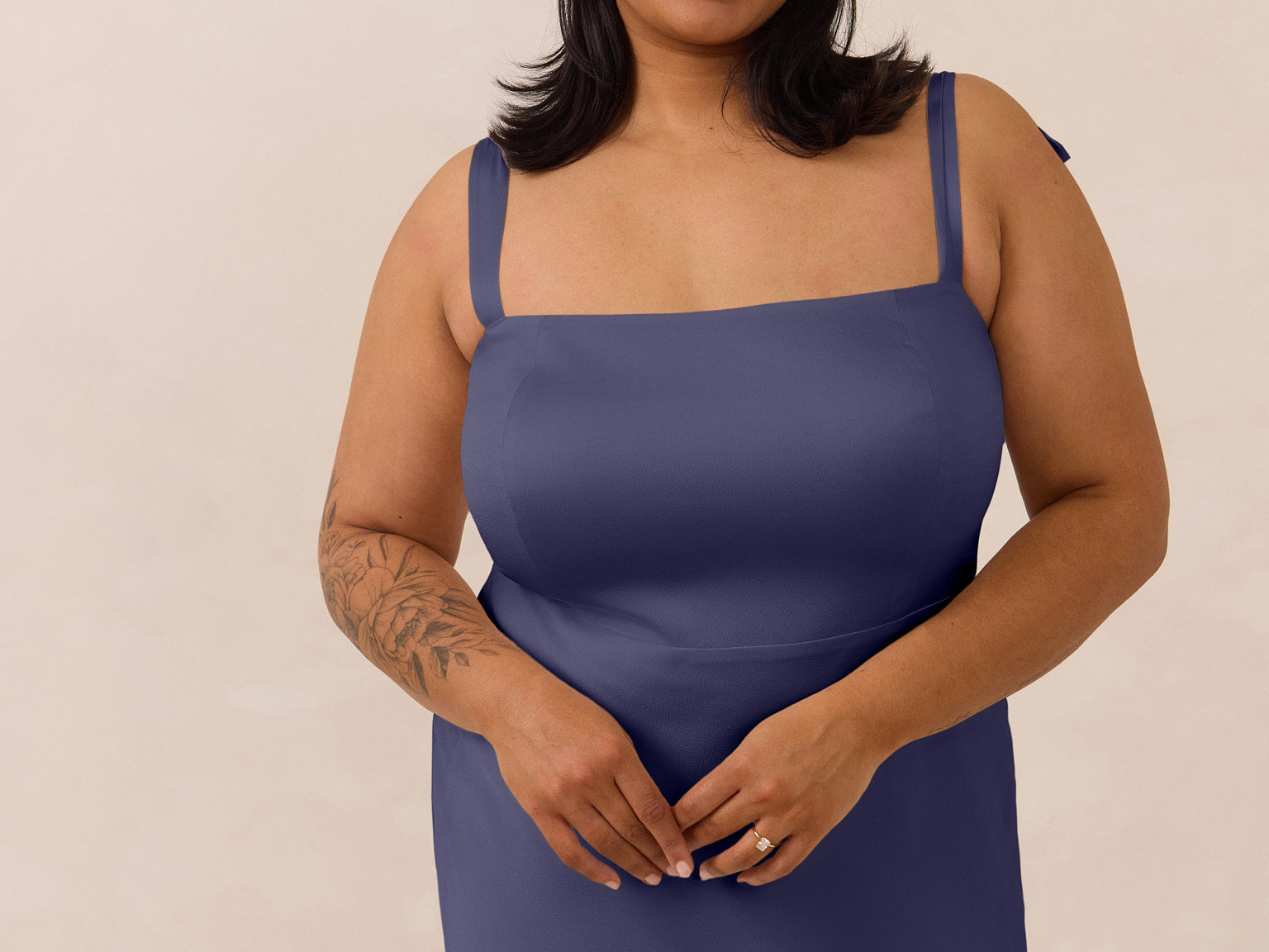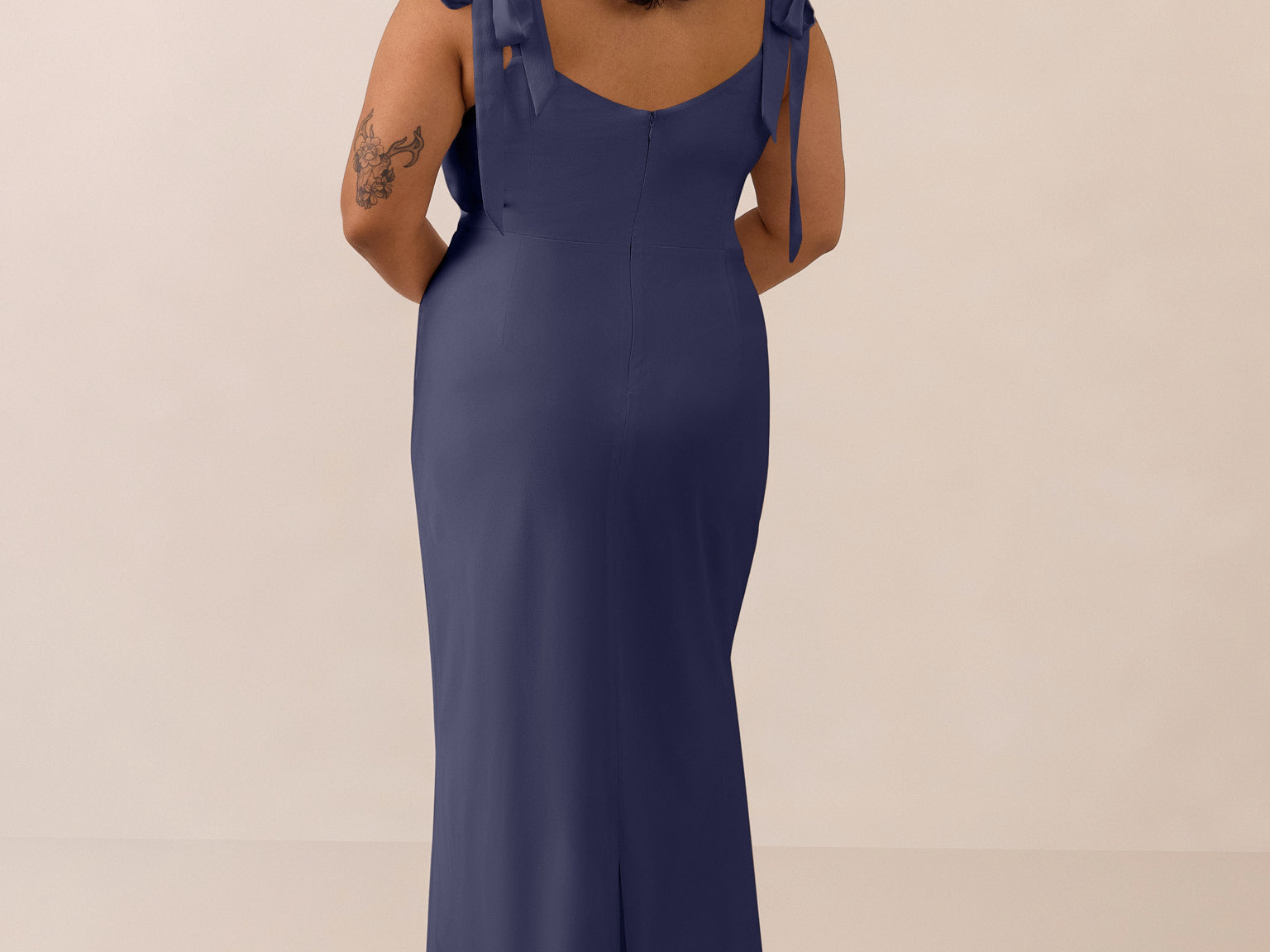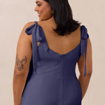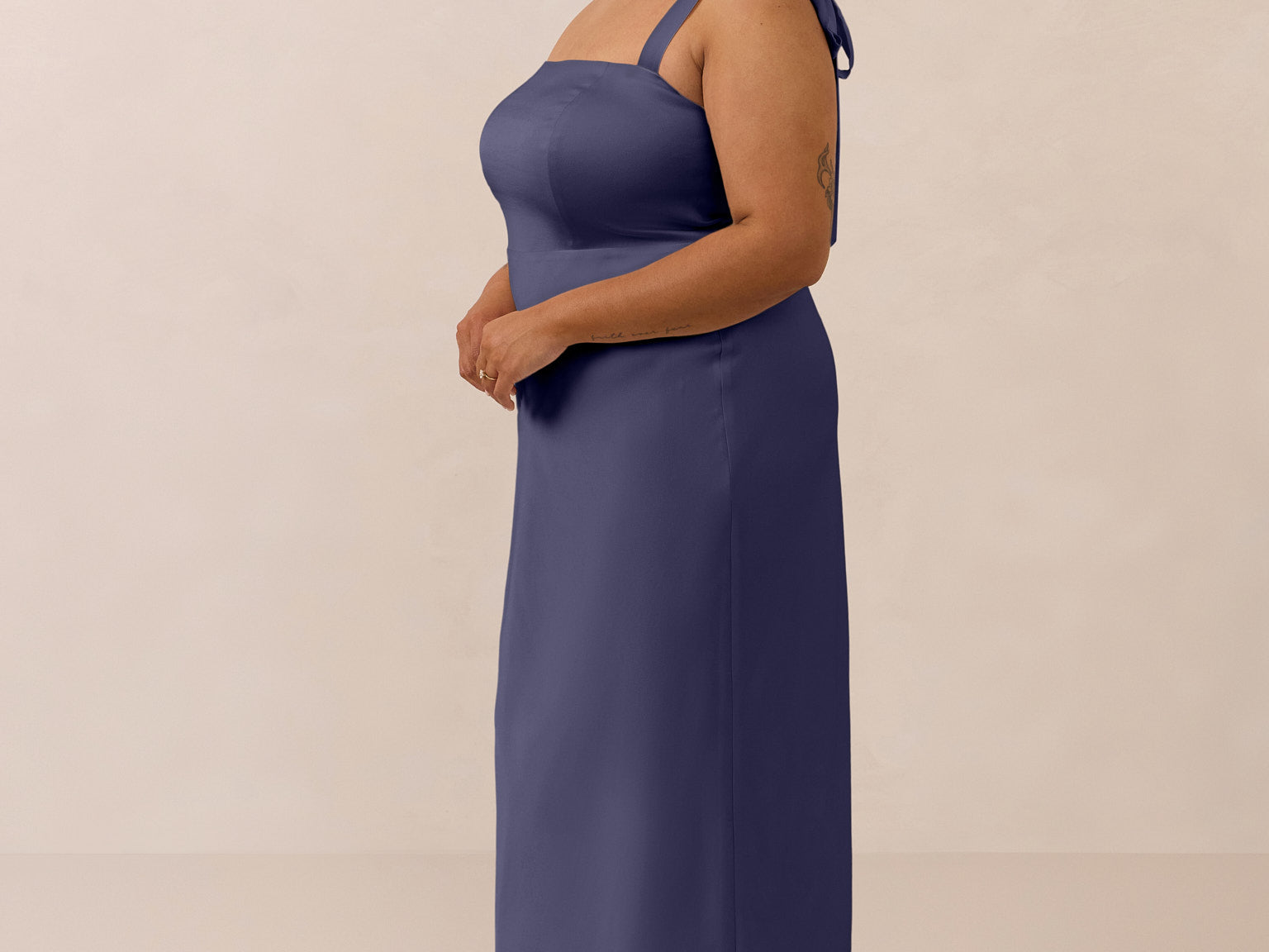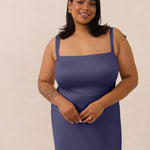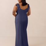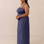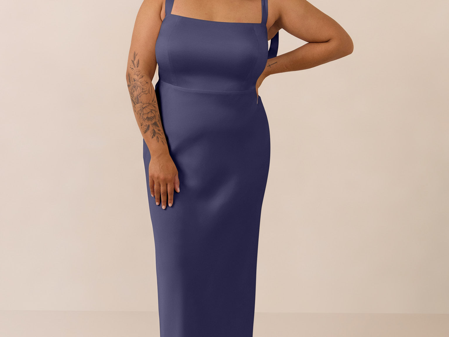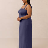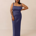 This full-length dress, made from luxurious satin, features a sleek square neckline and thick tie straps, offering a structured yet effortless aesthetic. The slim-fit skirt gently embraces the body, creating a smooth and elongated silhouette. An invisible back zipper ensures a seamless finish, making this dress ideal for sophisticated evening events.