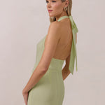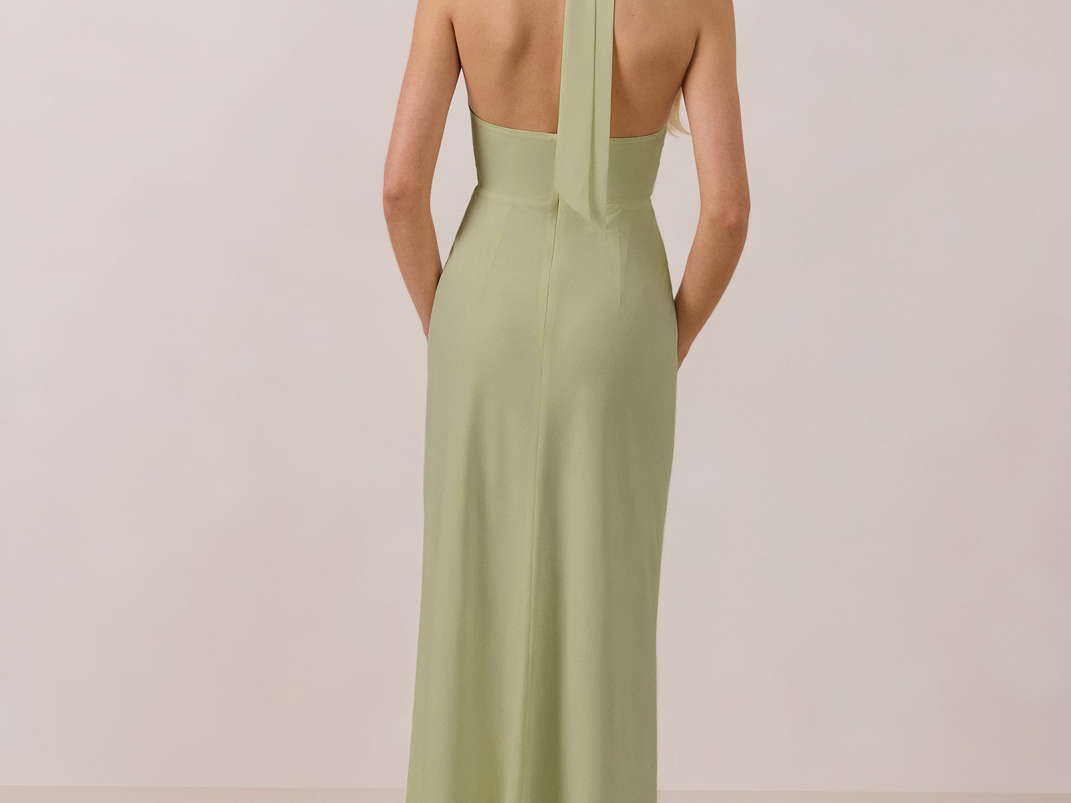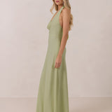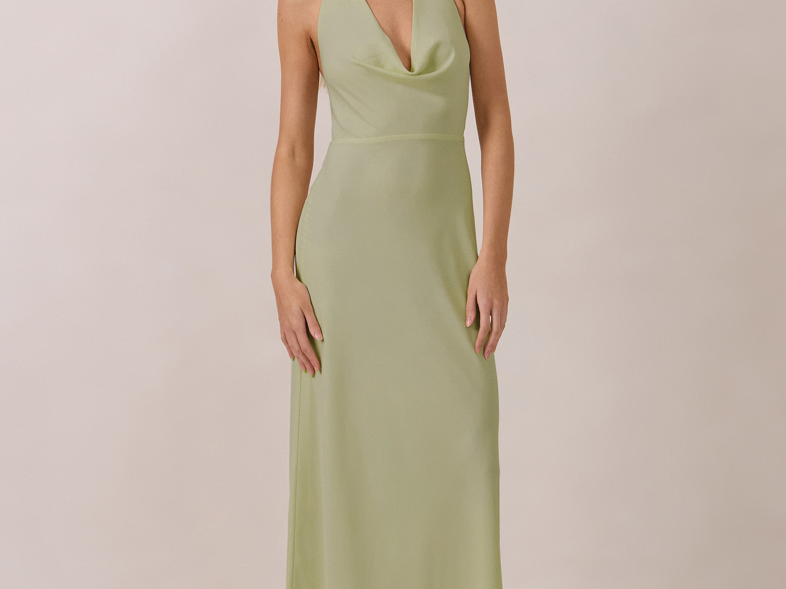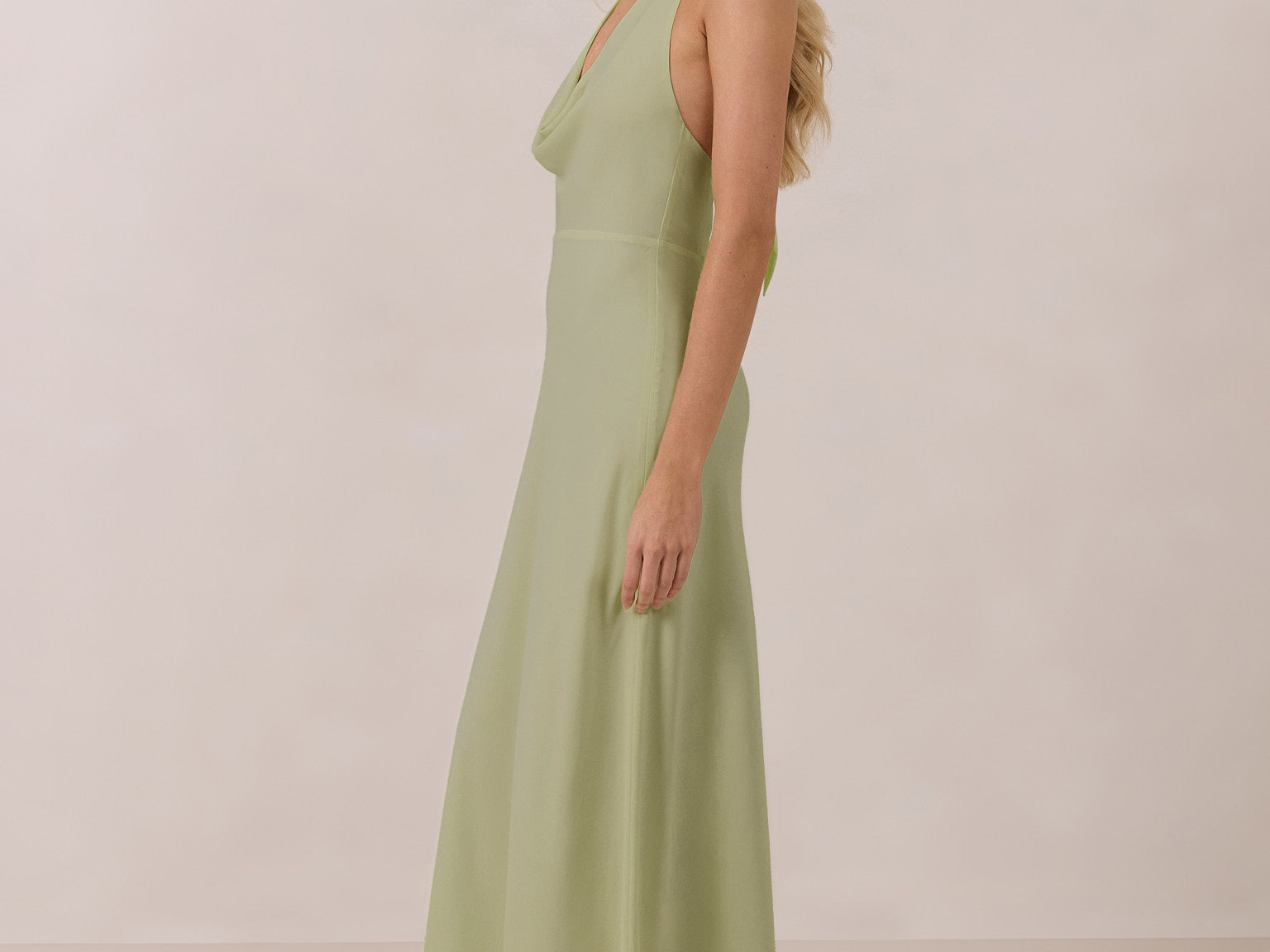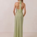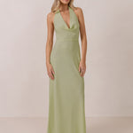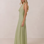 This elegant, full-length chiffon dress is designed to move gracefully, with a lustrous finish that highlights the delicate halter back and the softly draped cowl neckline. An unforgettable, timeless piece perfect for any special occasion.