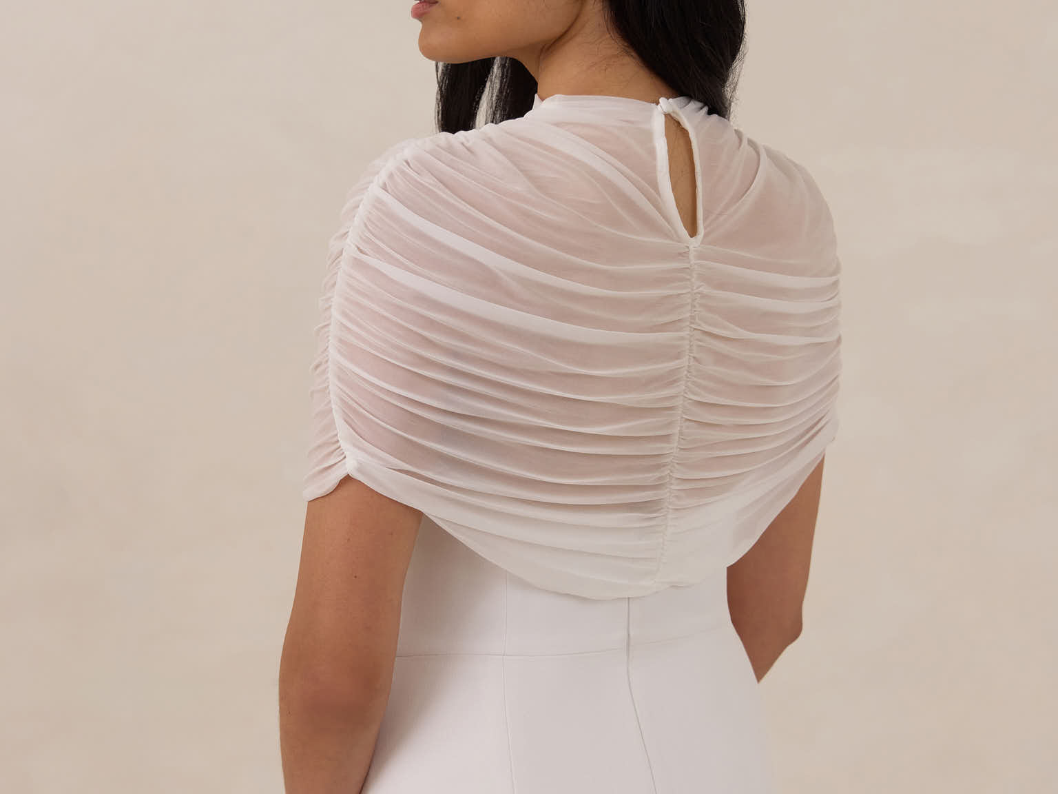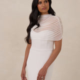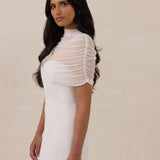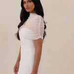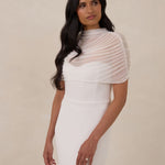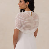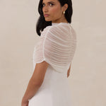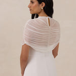 Add an ethereal layer of elegance and modern sophistication to your wedding gown with this exquisite bridal cape. Crafted from delicate, sheer mesh, it features a graceful mock-neckline, perfect for elevating your bridal look.