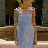 Featuring a sleek square neckline and thick tie straps, this style provides an effortless yet structured fit. The slim-fit skirt skims the body for a smooth, elongated silhouette, while an invisible back zipper ensures a seamless finish. Perfect for elevated evenings.