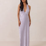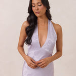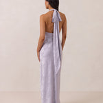 A sleek and versatile silhouette crafted in luxurious Jacquard for a touch of texture and sophistication. Designed for effortless elegance, it features a halter neckline with a dramatic open back and long ties that can be styled as a scarf or knotted for a custom halter look. The bias-cut skirt flows beautifully into a flattering maxi length, creating graceful movement with every step.