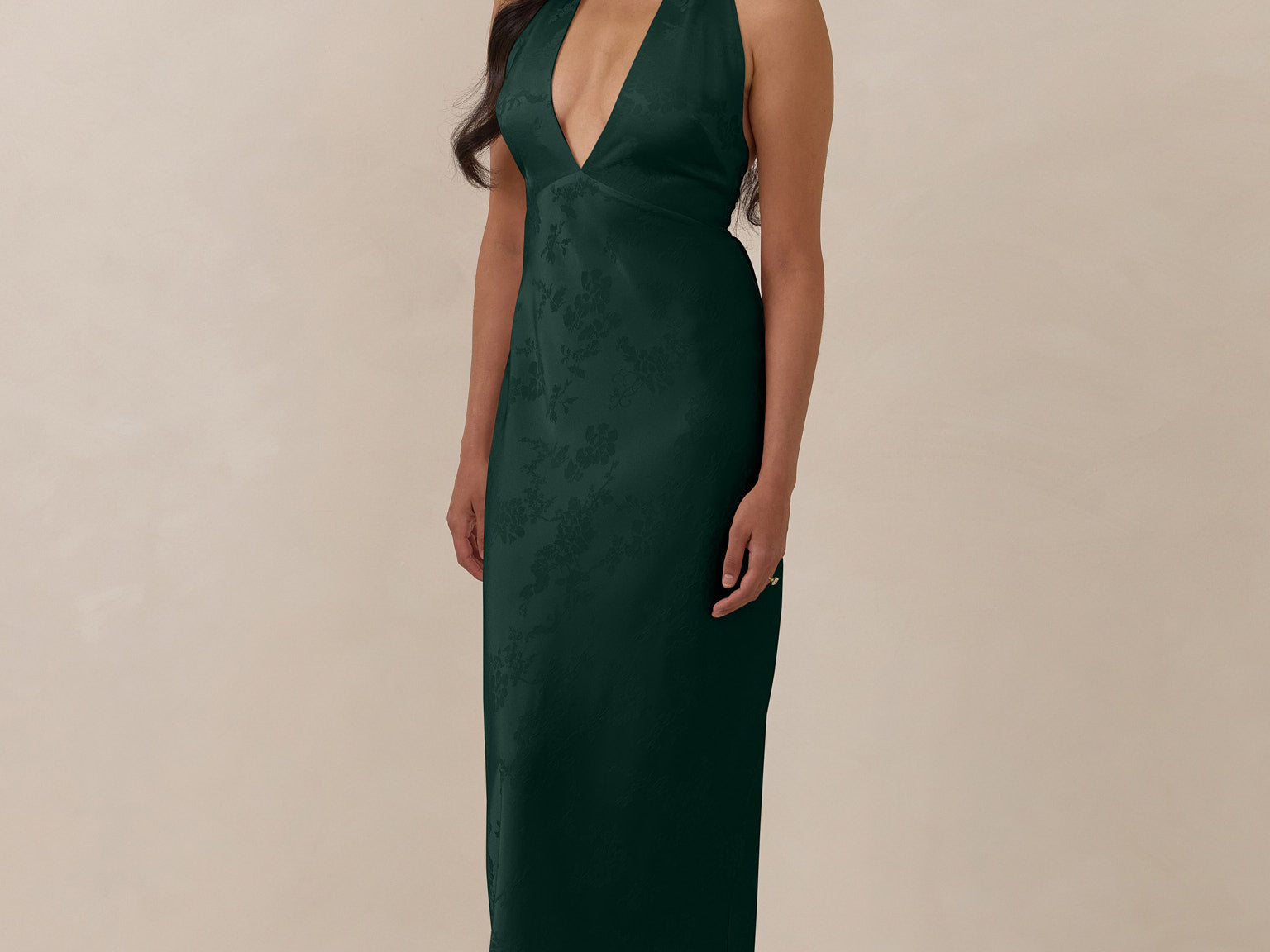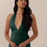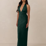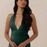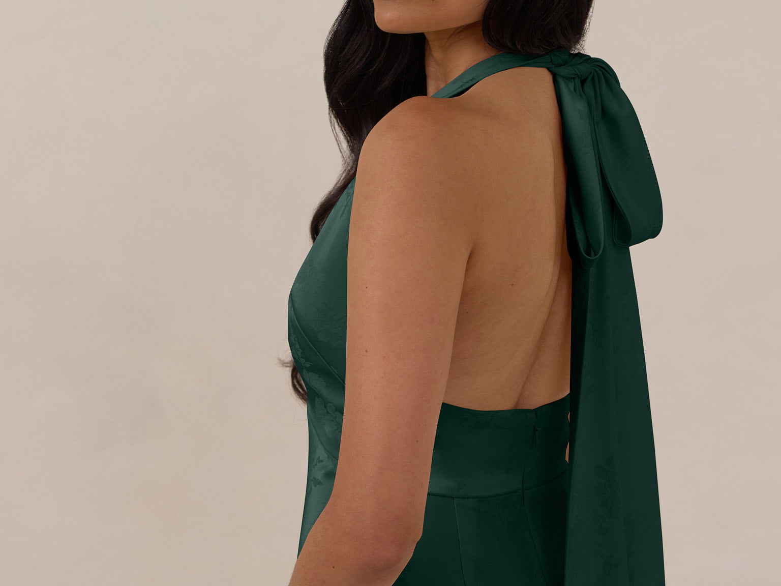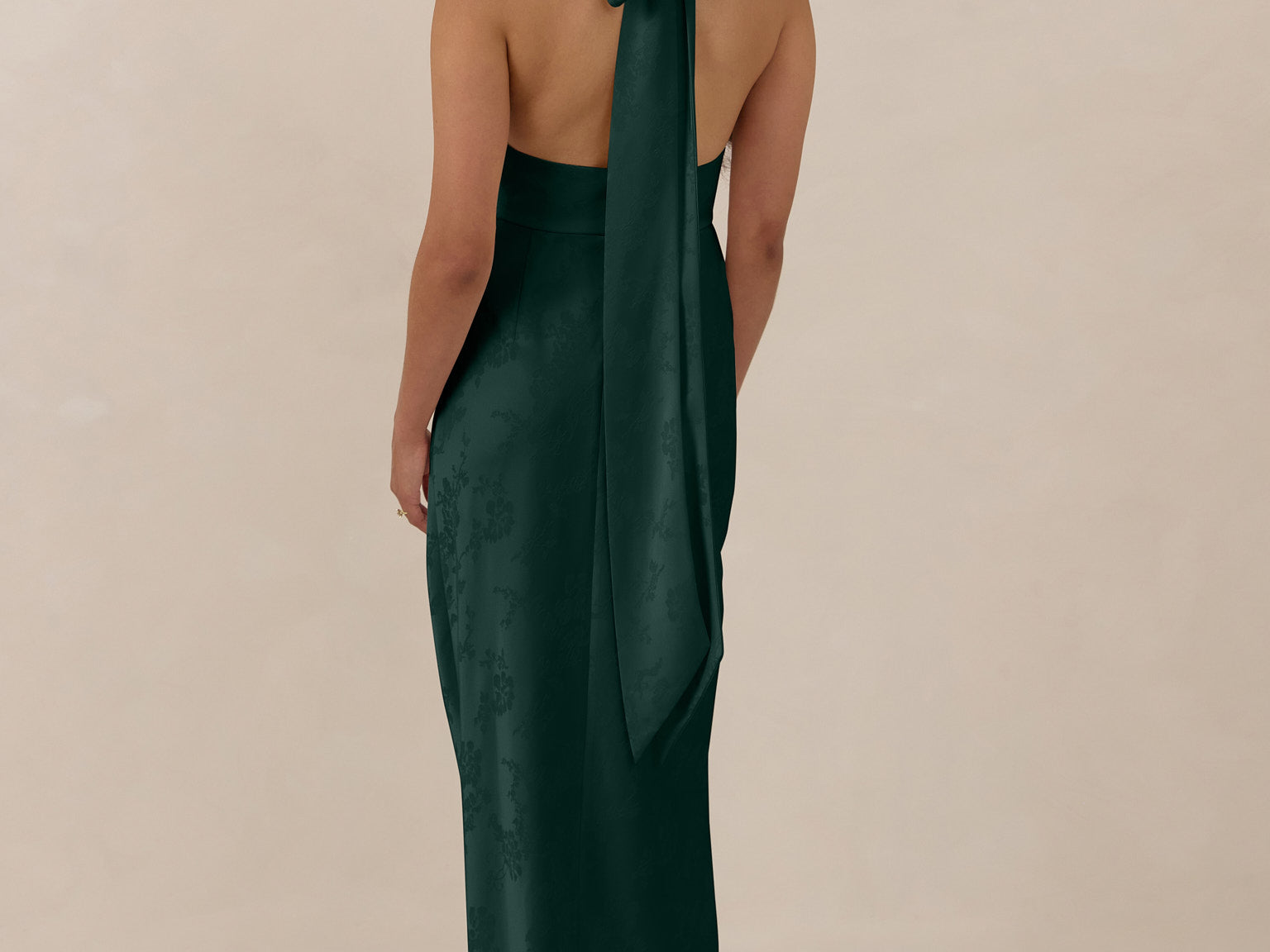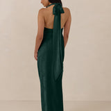 A sleek and versatile silhouette crafted in luxurious Jacquard for a touch of texture and sophistication. Designed for effortless elegance, it features a halter neckline with a dramatic open back and long ties that can be styled as a scarf or knotted for a custom halter look. The bias-cut skirt flows beautifully into a flattering maxi length, creating graceful movement with every step.