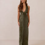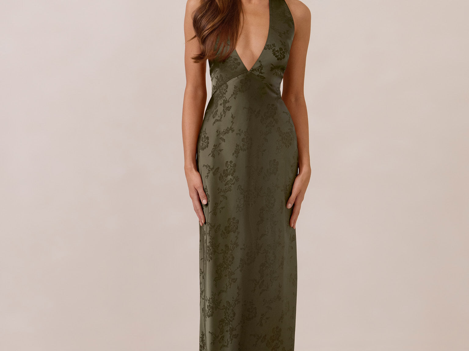 A sleek and versatile silhouette crafted in luxurious Jacquard for a touch of texture and sophistication. Designed for effortless elegance, it features a halter neckline with a dramatic open back and long ties that can be styled as a scarf or knotted for a custom halter look. The bias-cut skirt flows beautifully into a flattering maxi length, creating graceful movement with every step.