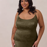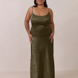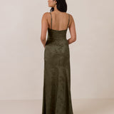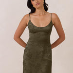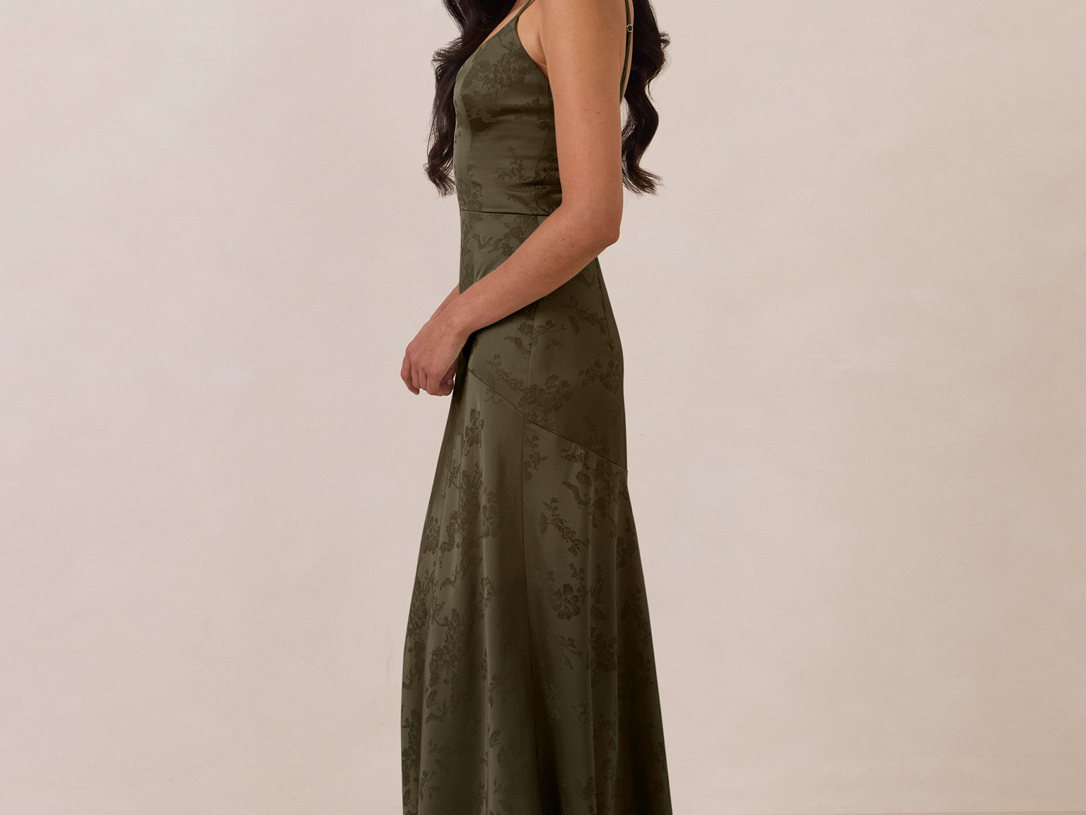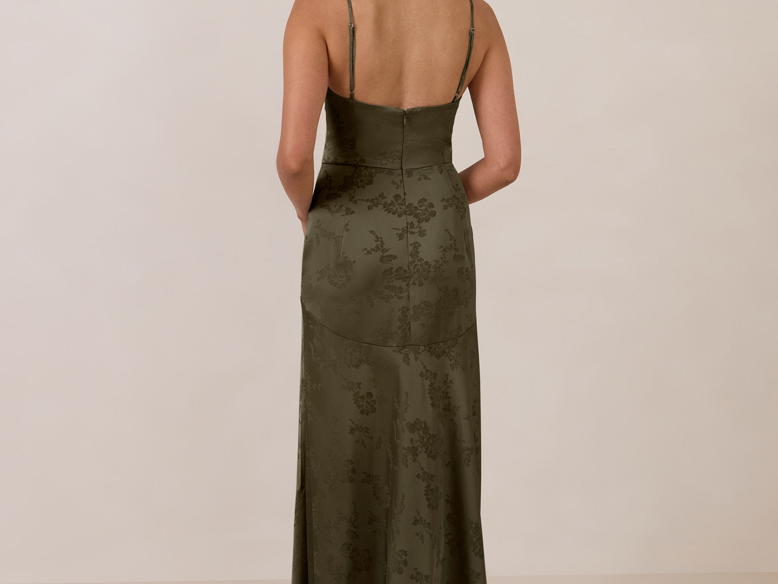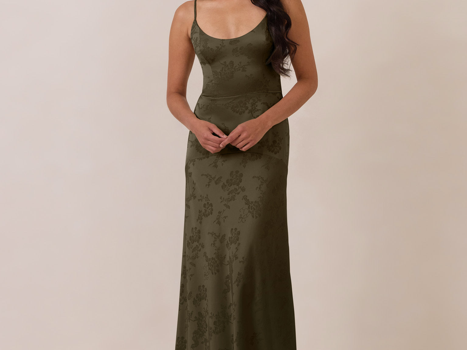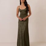 Crafted from luxurious Jacquard satin, this full-length dress features adjustable straps and a flattering drop waist, creating an elegant silhouette with timeless appeal. The scoop neckline and back add a delicate, feminine touch, while the bias-cut skirt flows gracefully to the floor, combining sophistication and comfort for a truly captivating look.