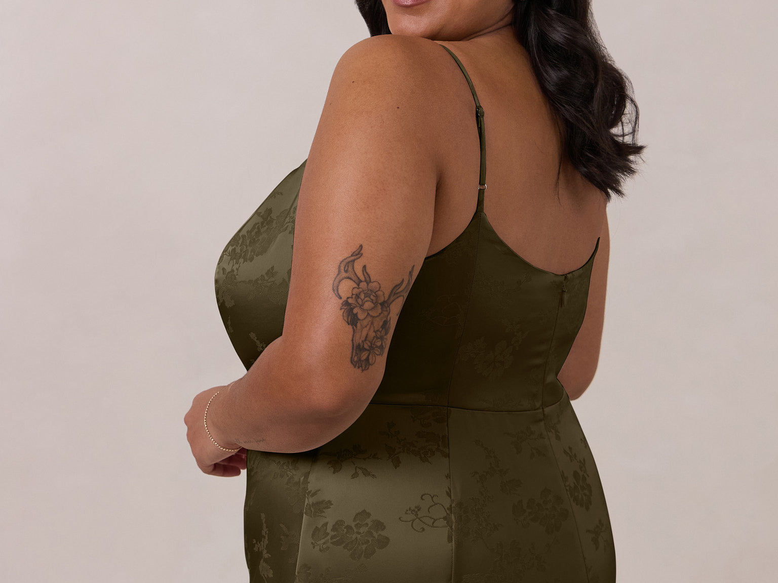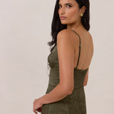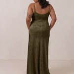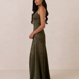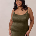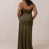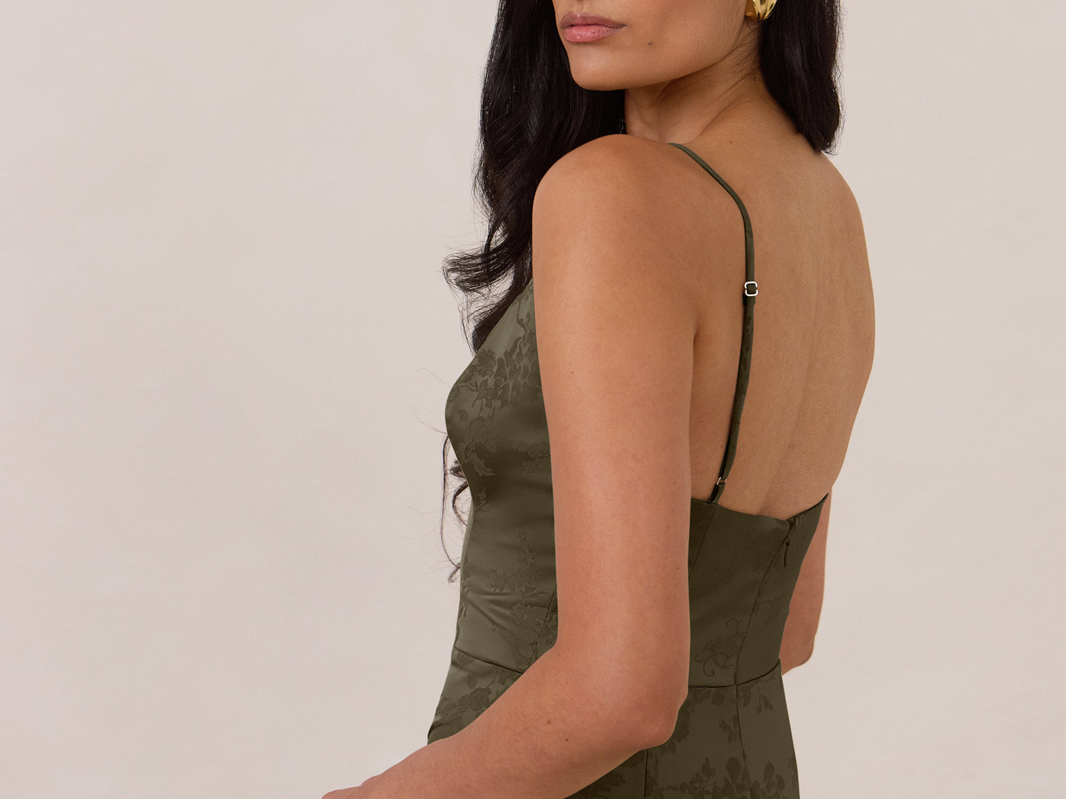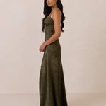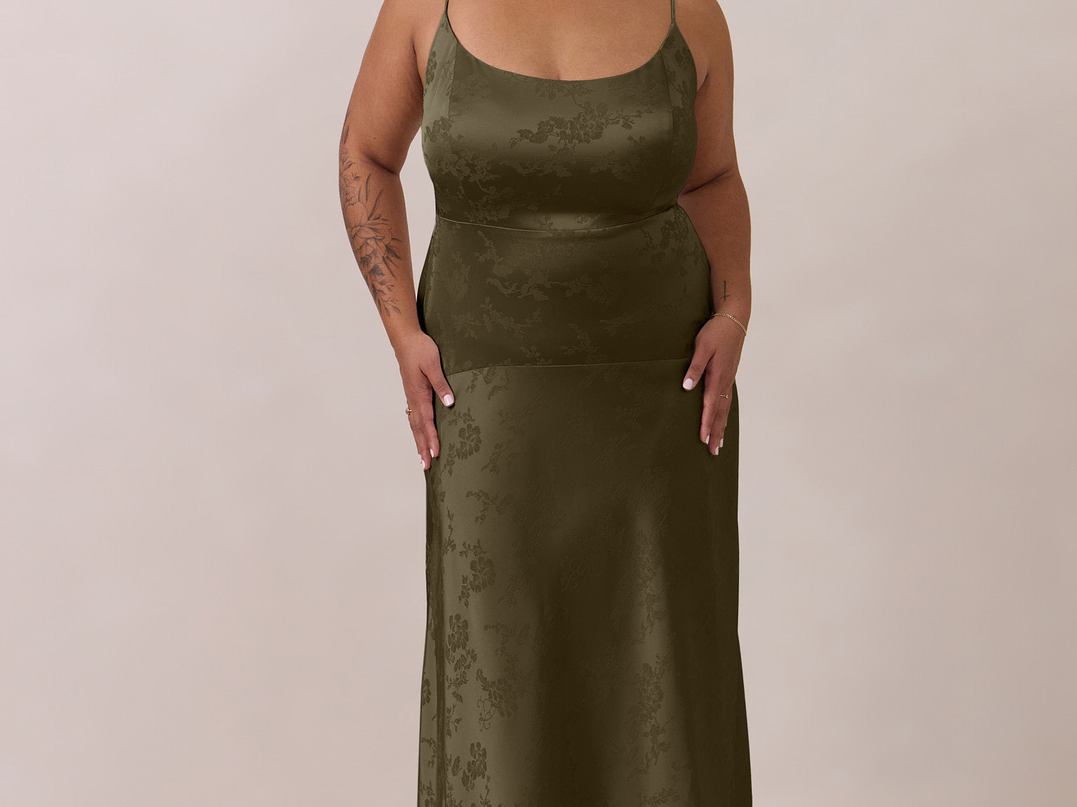 Crafted from luxurious Jacquard satin, this full-length dress features adjustable straps and a flattering drop waist, creating an elegant silhouette with timeless appeal. The scoop neckline and back add a delicate, feminine touch, while the bias-cut skirt flows gracefully to the floor, combining sophistication and comfort for a truly captivating look.