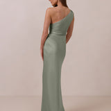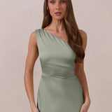 The Hartley dress offers modern minimalism and effortless charm. Made from soft, silky satin, this full-length silhouette drapes beautifully. Delicate ruching on the one-shoulder strap and right side seam adds subtle texture and enhances the figure-hugging fit. A sleek side slit completes the look, offering just the right amount of movement and allure.