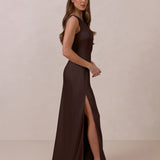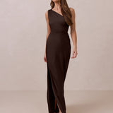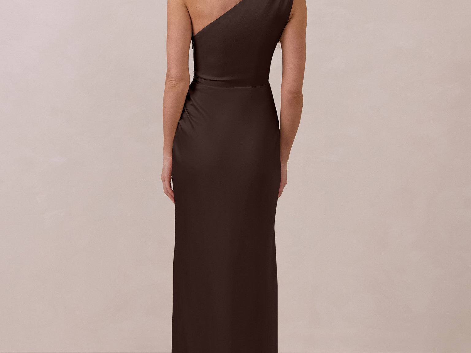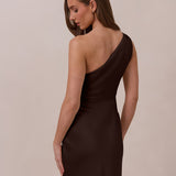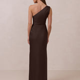 The Hartley dress offers modern minimalism and effortless charm. Made from soft, silky satin, this full-length silhouette drapes beautifully. Delicate ruching on the one-shoulder strap and right side seam adds subtle texture and enhances the figure-hugging fit. A sleek side slit completes the look, offering just the right amount of movement and allure.