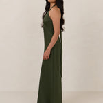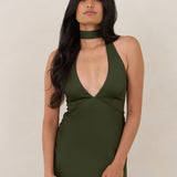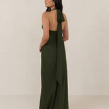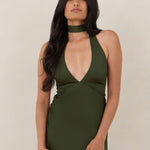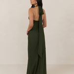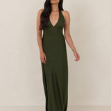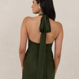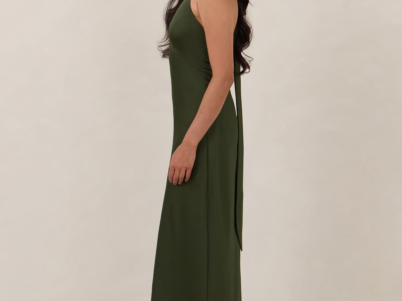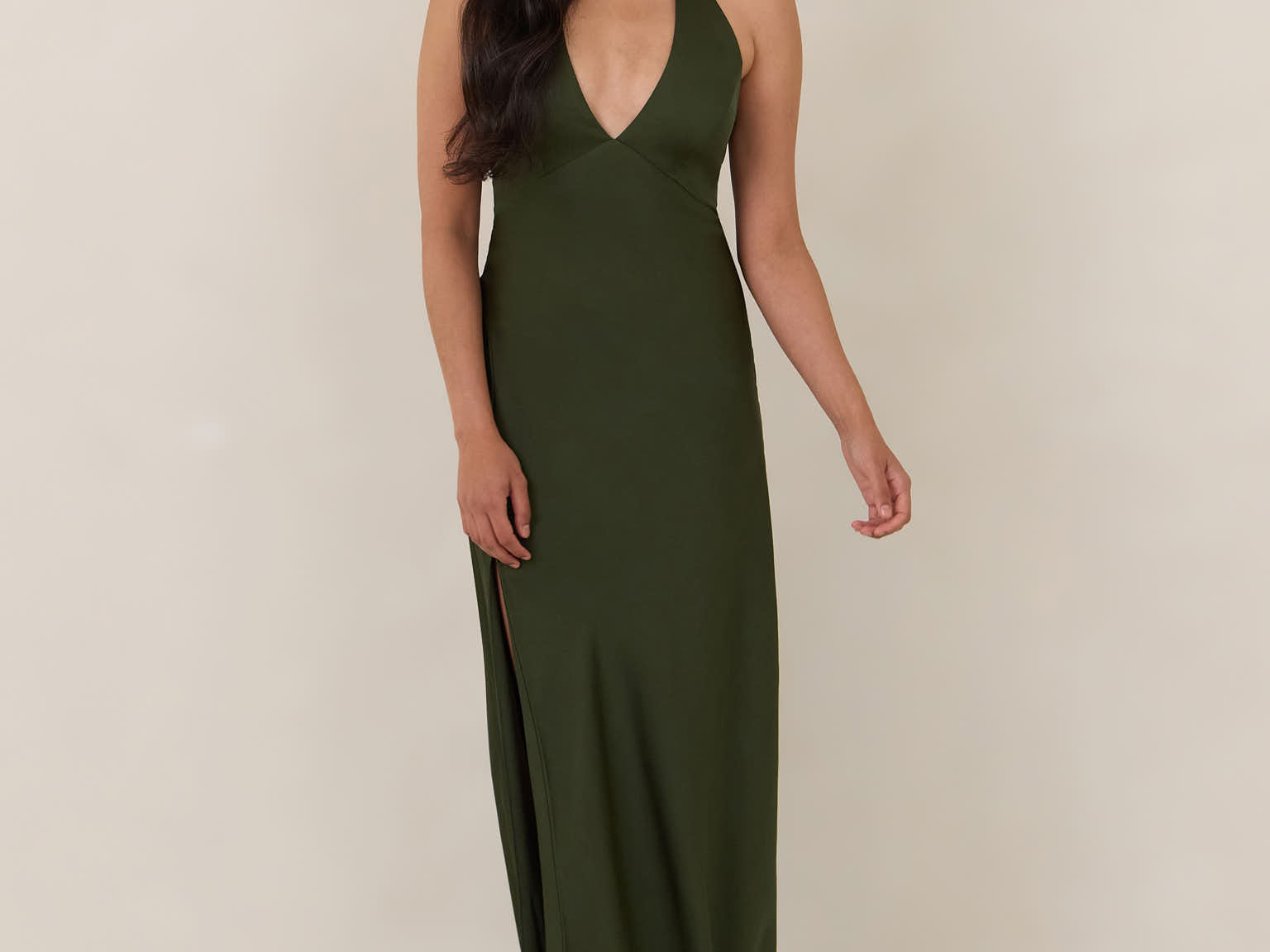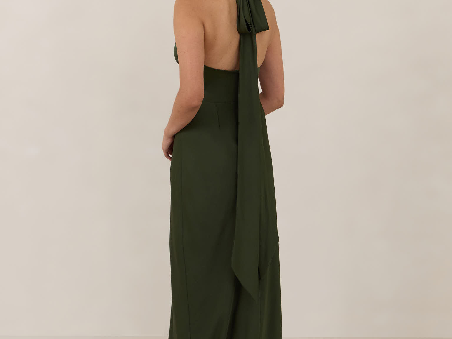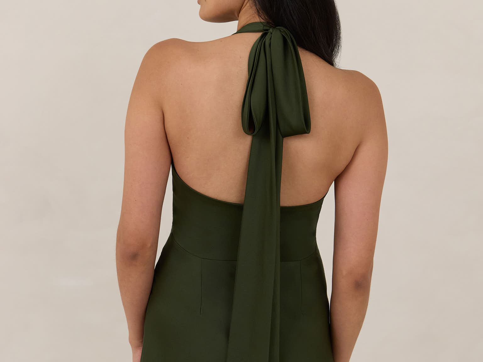 Designed to turn heads. Crafted from our smooth satin, this bust-friendly halter style features long, versatile ties that can be styled in a bow or worn as a neck scarf for a modern touch. Finished with a bias-cut skirt and a subtle slit, this dress effortlessly balances elegance with a bold edge.