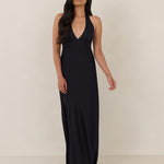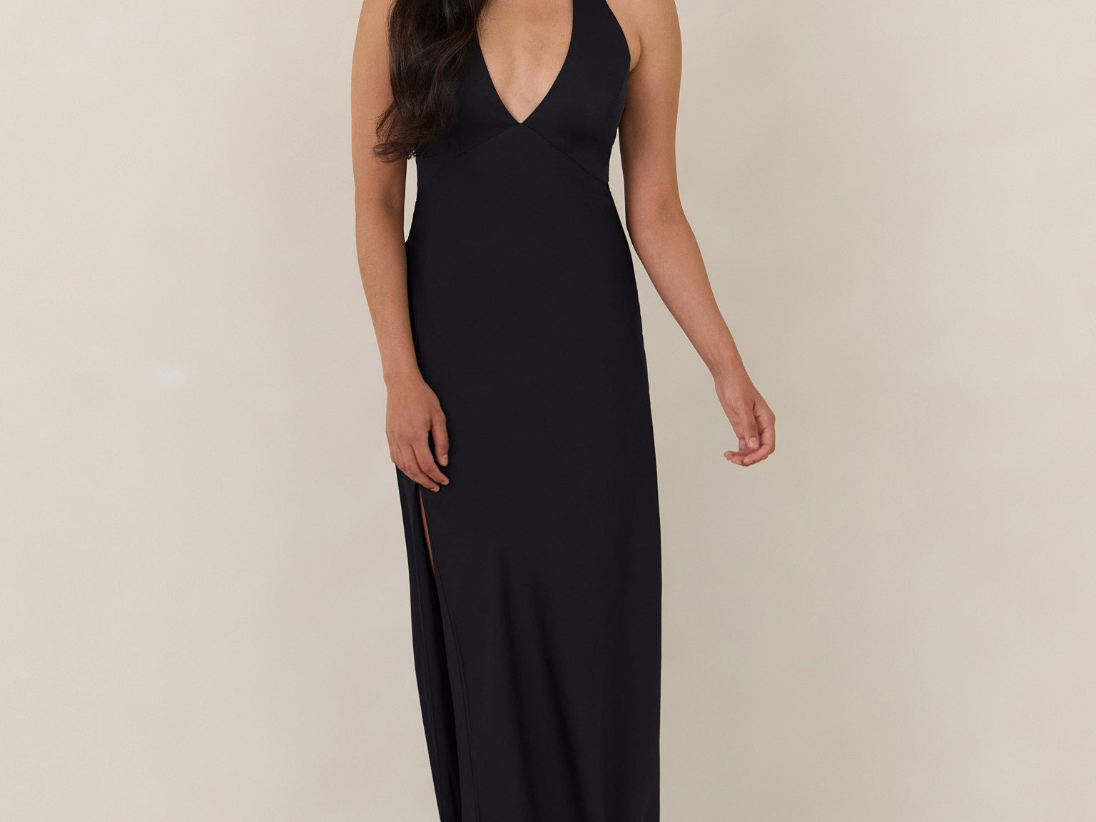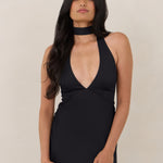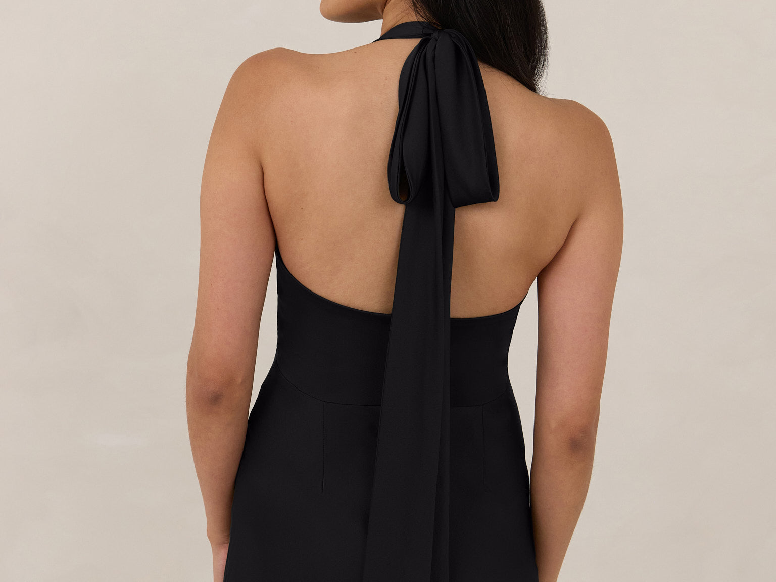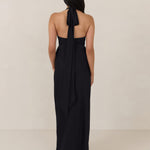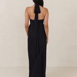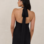 Designed to turn heads. Crafted from our smooth satin, this bust-friendly halter style features long, versatile ties that can be styled in a bow or worn as a neck scarf for a modern touch. Finished with a bias-cut skirt and a subtle slit, this dress effortlessly balances elegance with a bold edge.