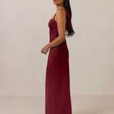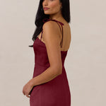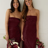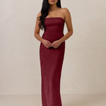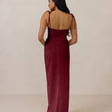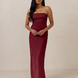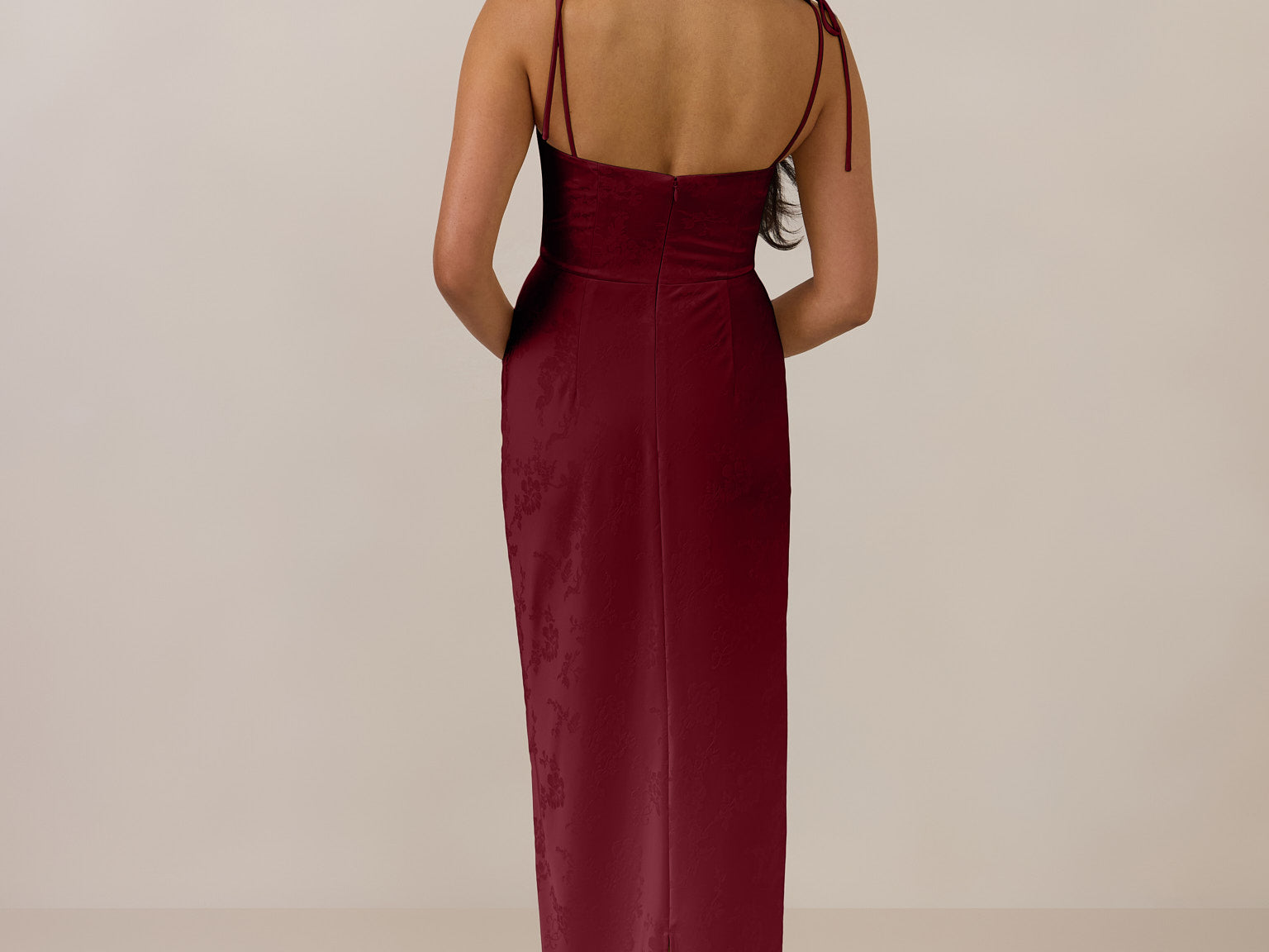 The convertible Meridian dress offers understated sophistication with a floor-grazing silhouette and a back slit for graceful movement. Featuring a structured bodice for a sculpted fit, the design includes interchangeable straps that can be styled thin, thick, or strapless. This versatile and elegant piece is designed to provide quiet confidence for any occasion.