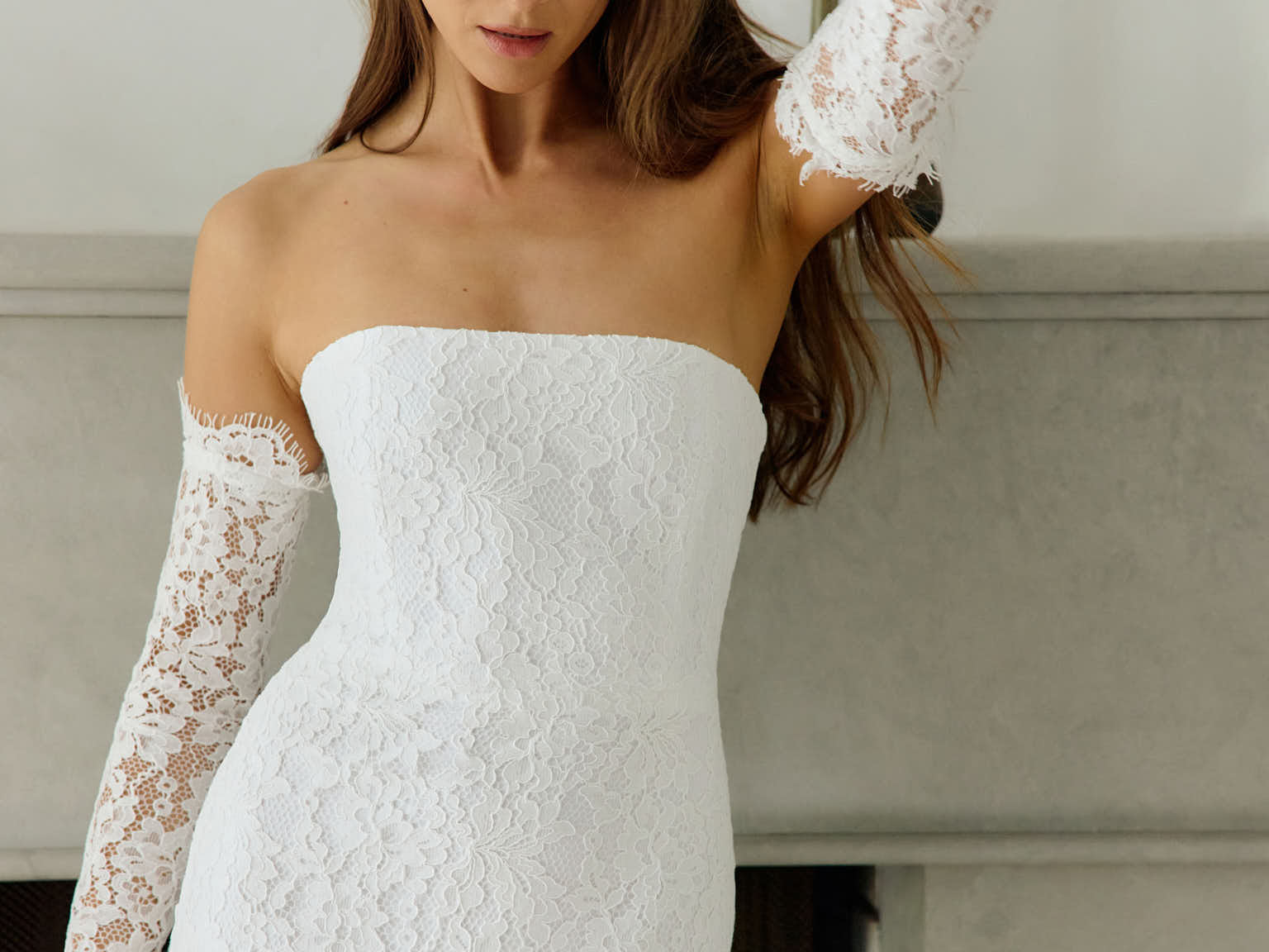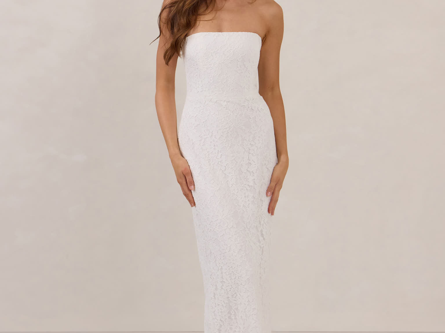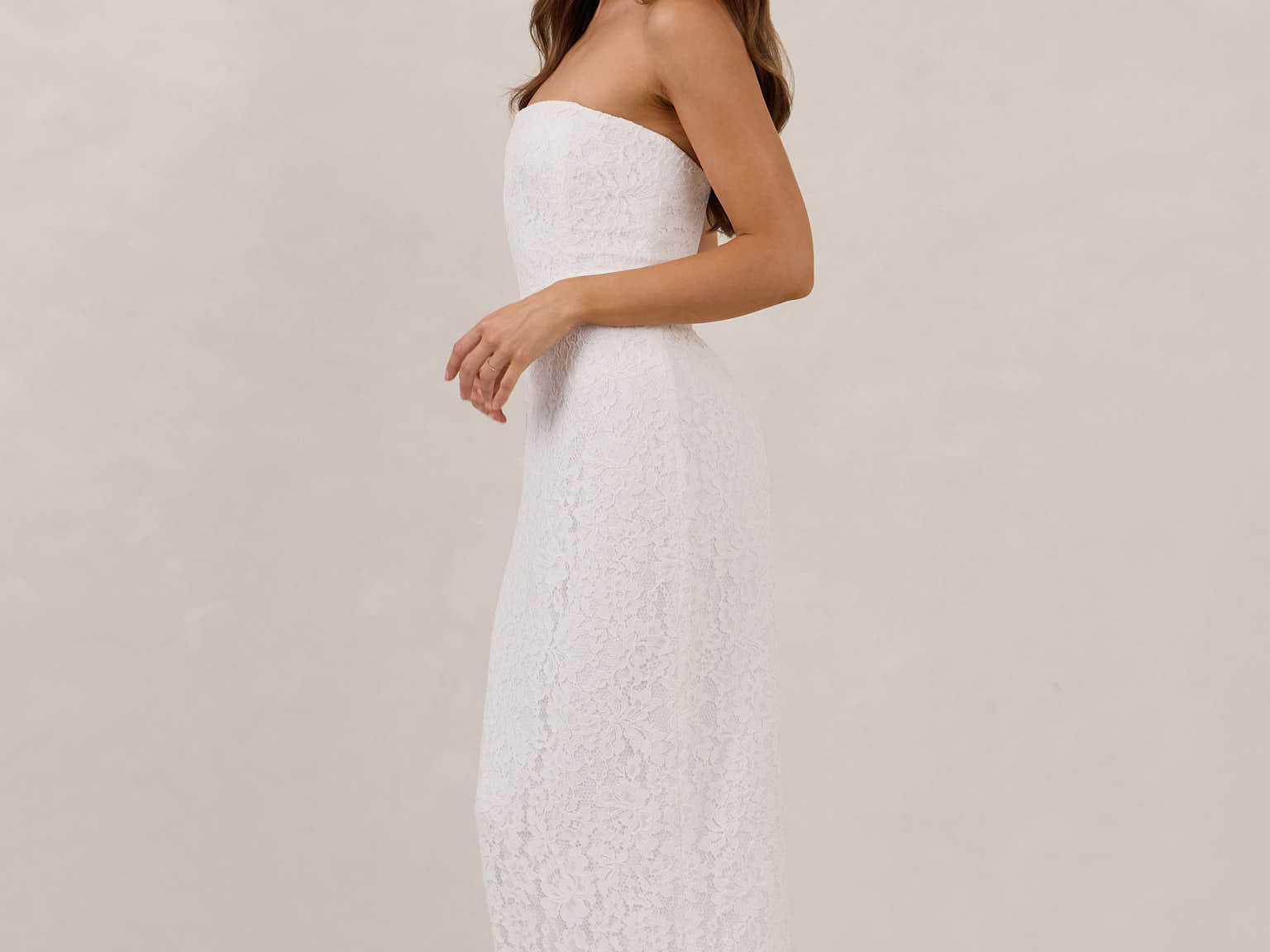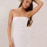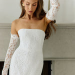 The Neve Dress is a refined take on lace—elegant, minimal, and made for modern bridal moments. Designed with a structured, boned bodice and slim-fitting midi skirt, it offers a flattering silhouette with just the right amount of detail.