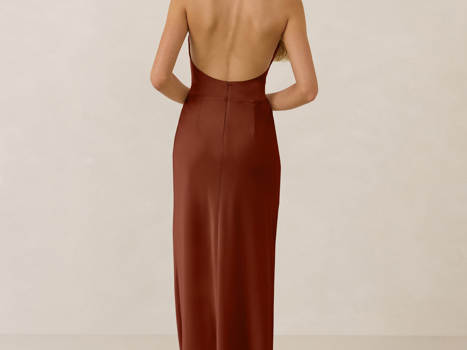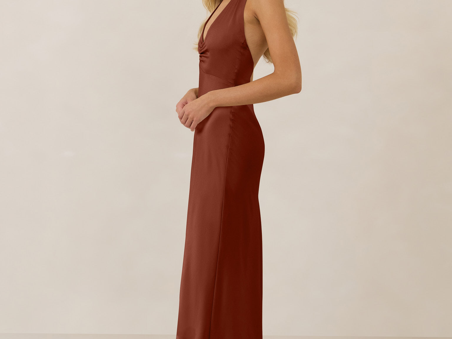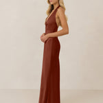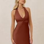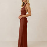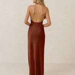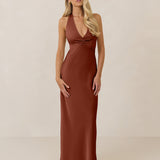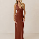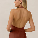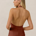 The perfect balance between bold and refined, this satin halter dress is designed to turn heads with quiet confidence. Featuring a plunging halter neckline that highlights the neck and collarbone, it's finished with a cinched detail at the bust to enhance shape and create a beautifully flattering silhouette.