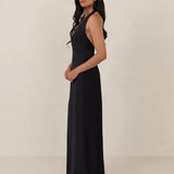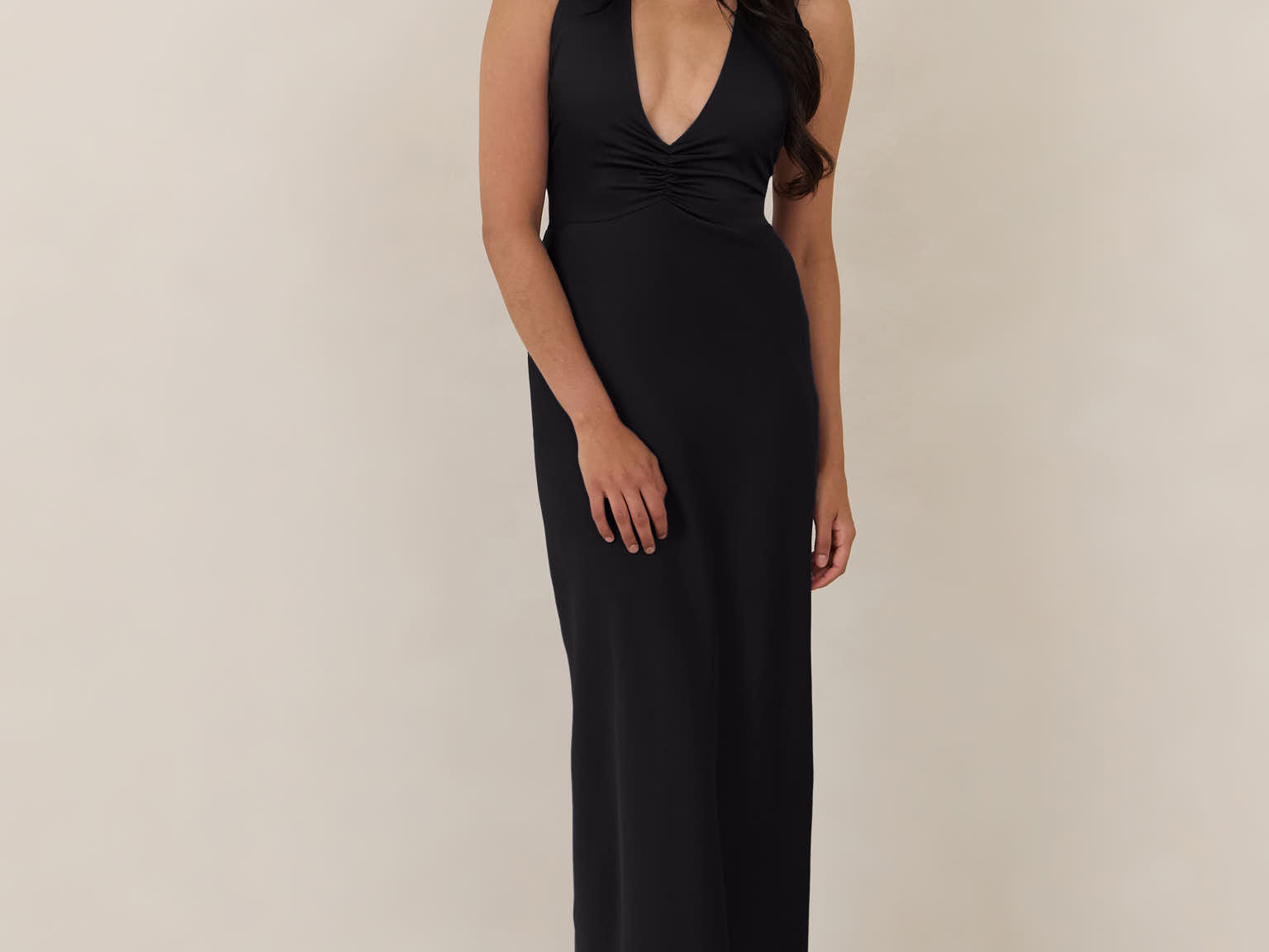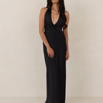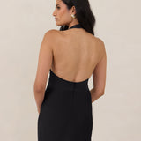The perfect balance between bold and refined, this satin halter dress is designed to turn heads with quiet confidence. Featuring a plunging halter neckline that highlights the neck and collarbone, it's finished with a cinched detail at the bust to enhance shape and create a beautifully flattering silhouette.