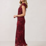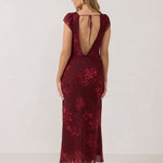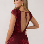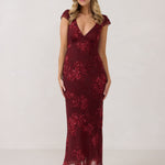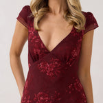 This tea-length style features a plunging V-neck bodice and flutter sleeves for an effortlessly feminine silhouette. The semi-sheer fabric is fully lined for a delicate yet comfortable fit. It’s perfect for any special occasion, blending elegance with ease.