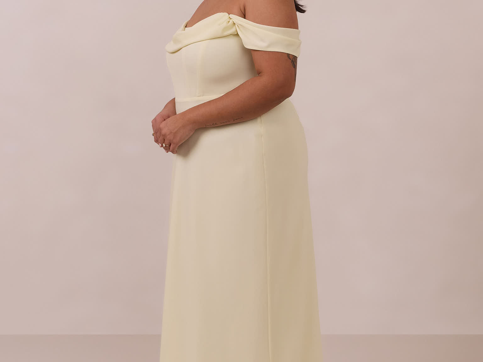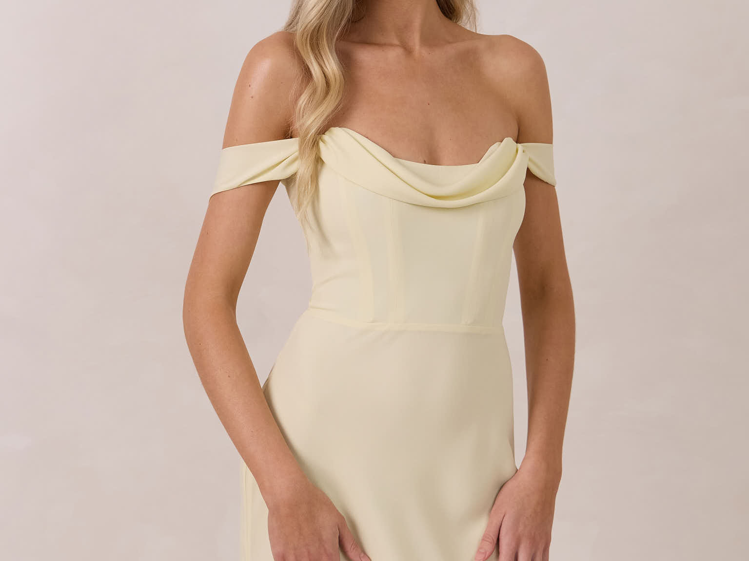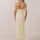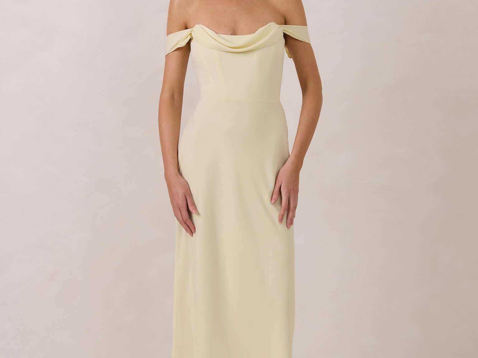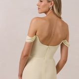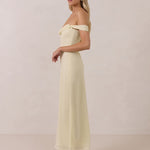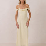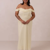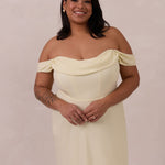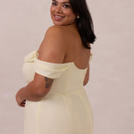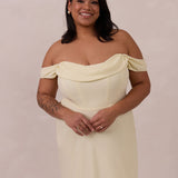The Sutton Dress is the definition of effortless elegance. Designed with a soft draped chiffon neckline and delicate off-the-shoulder sleeves, it strikes the perfect balance between romance and refinement.