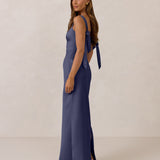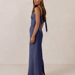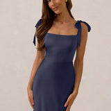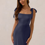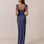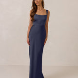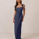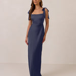 This full-length dress, made from luxurious satin, features a sleek square neckline and thick tie straps, offering a structured yet effortless aesthetic. The slim-fit skirt gently embraces the body, creating a smooth and elongated silhouette. An invisible back zipper ensures a seamless finish, making this dress ideal for sophisticated evening events.