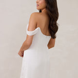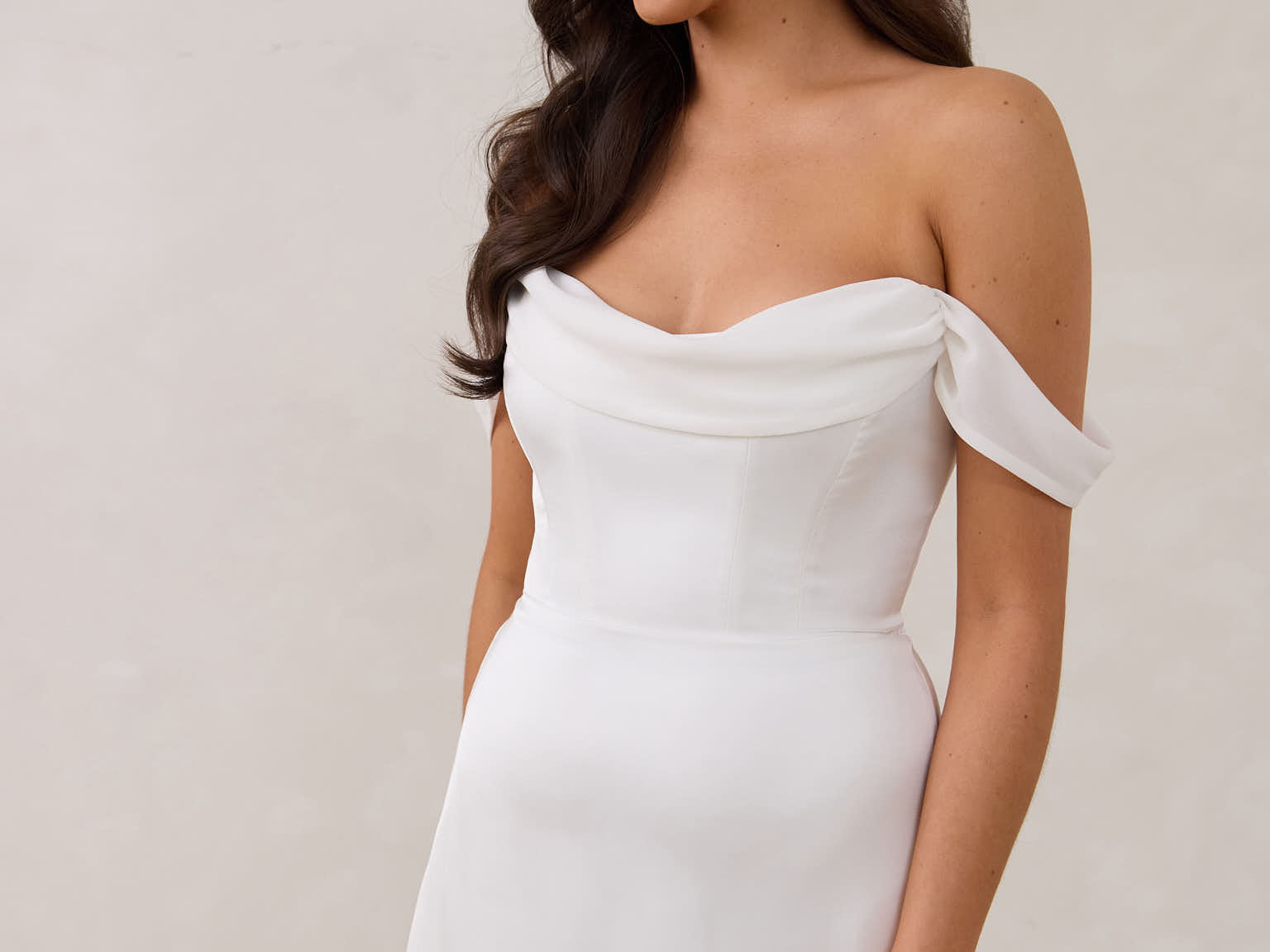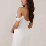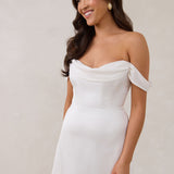 Crafted from sleek satin, this mini dress features a soft draped chiffon neckline and delicate off-the-shoulder sleeves for an understated yet striking look. Whether for a rehearsal dinner, bridal shower, or after-party, it’s the perfect piece for any wedding moment.