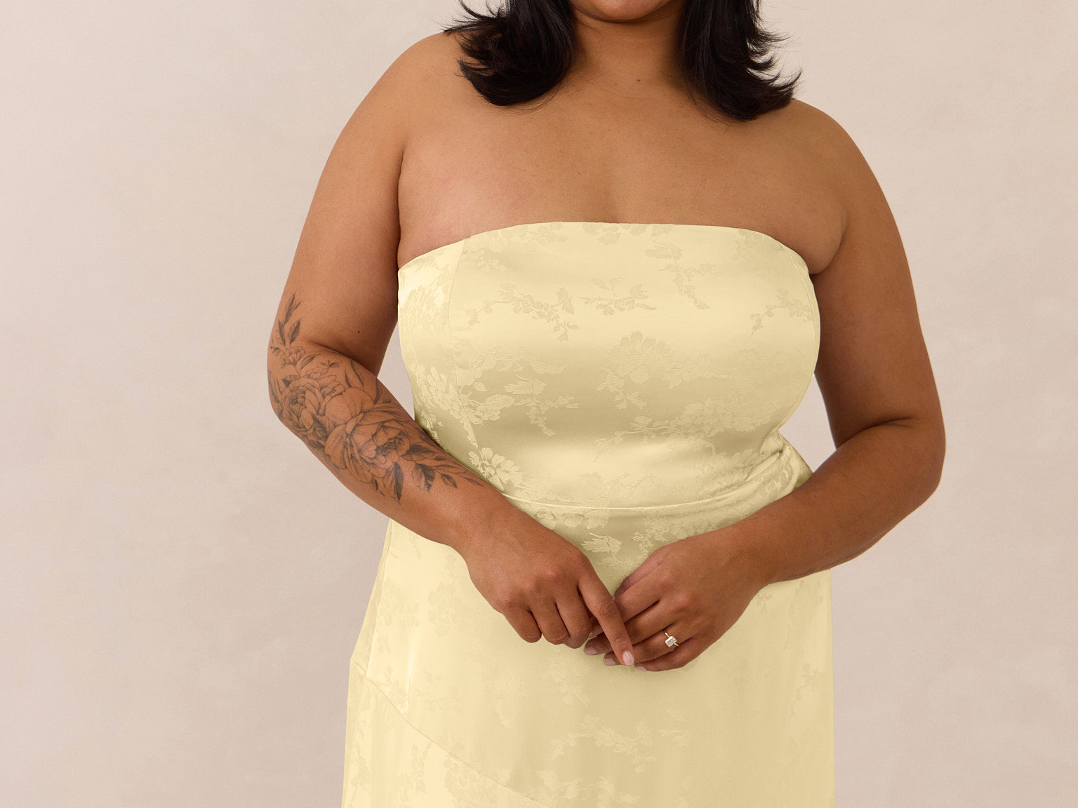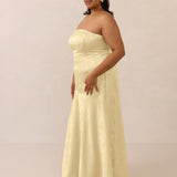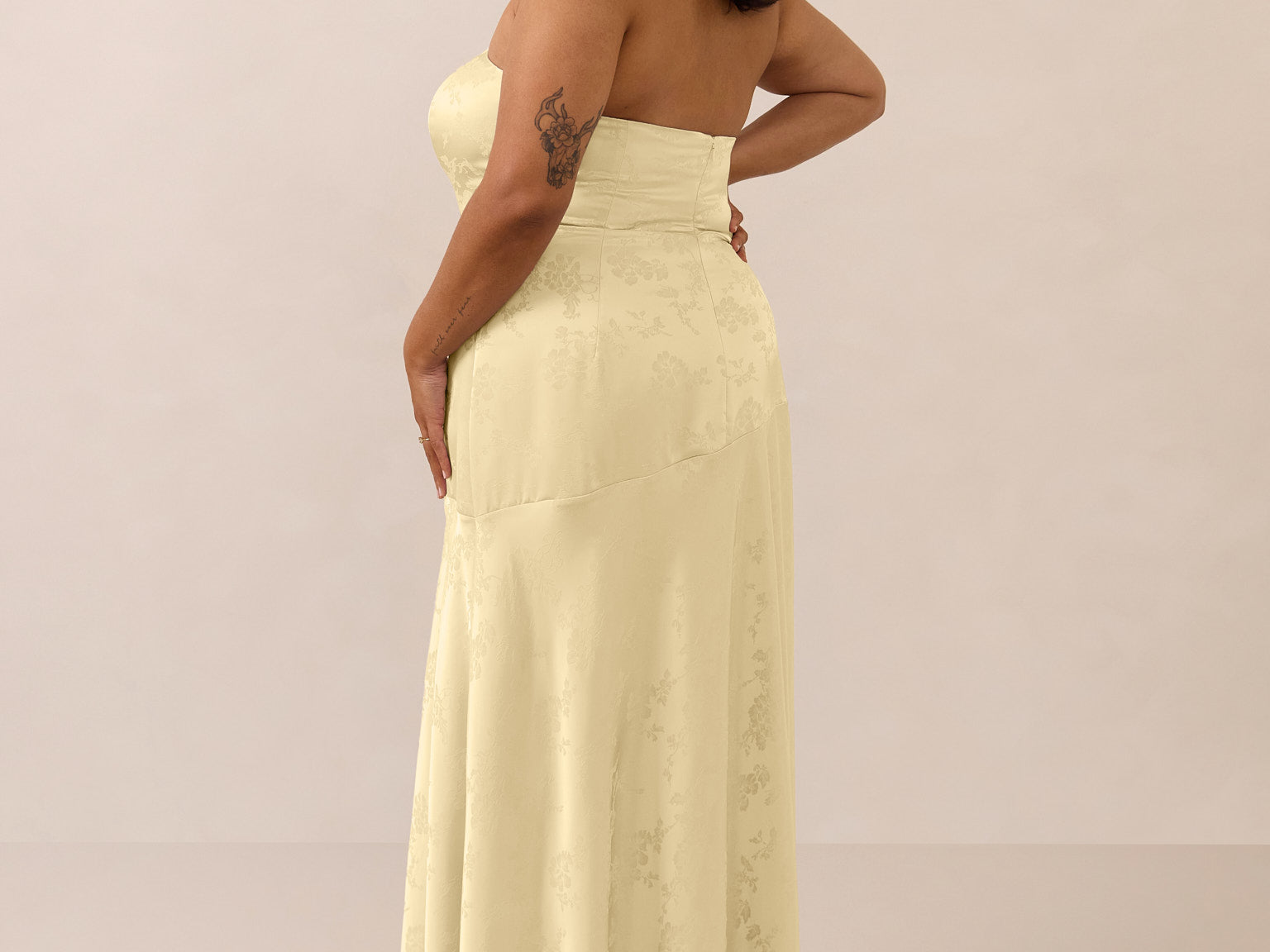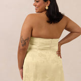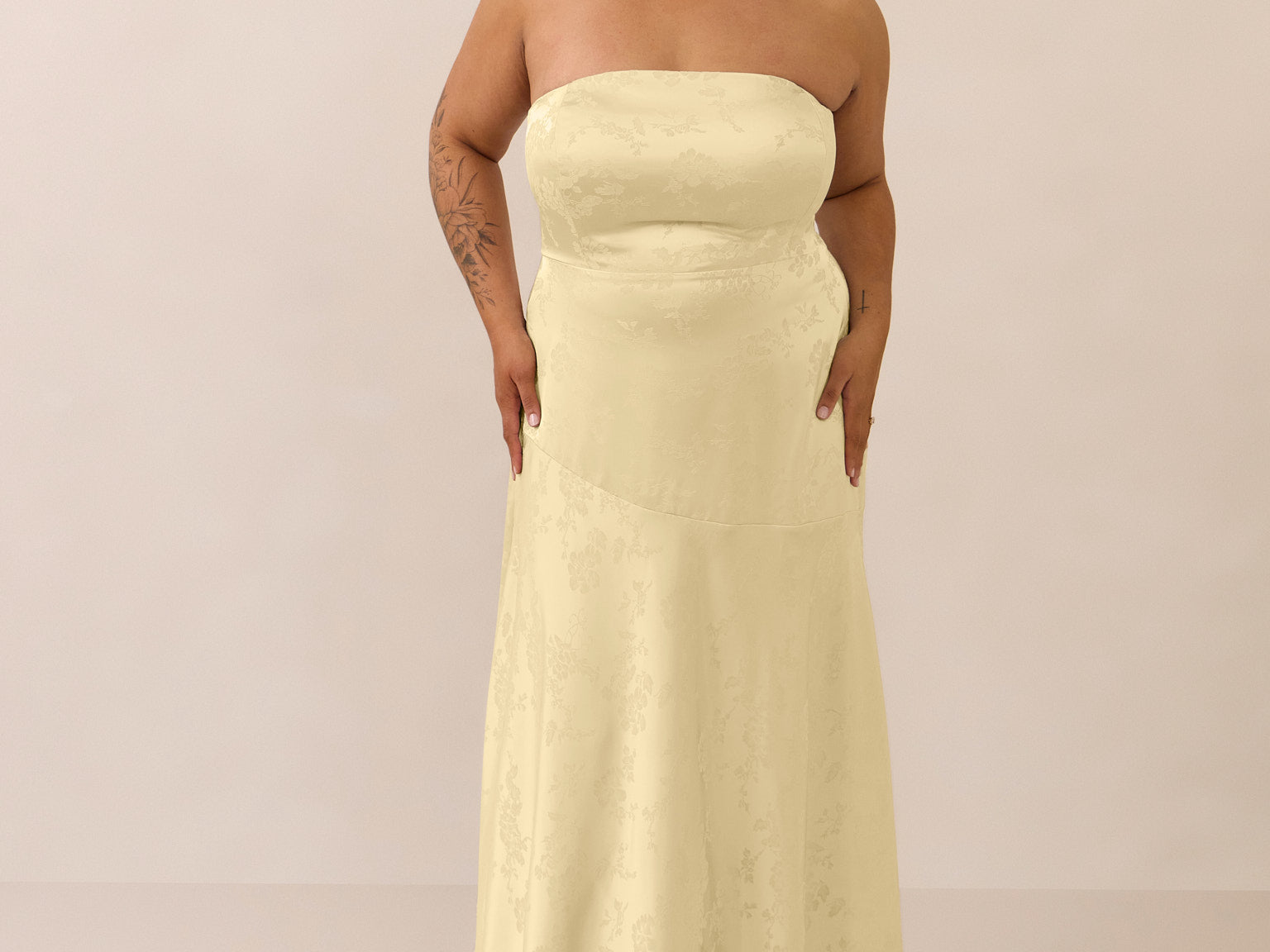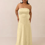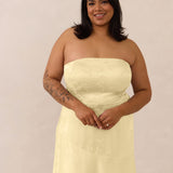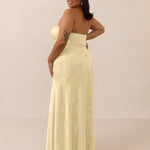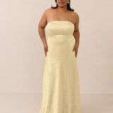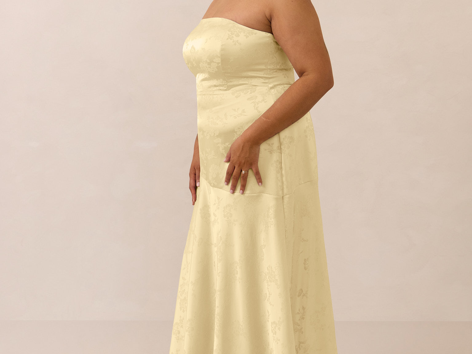 The Delaney is a full-length, strapless silhouette crafted from luxurious Jacquard satin. Clean lines and a smooth, sculpted bodice create a timeless look, while the sleek finish makes it an elevated choice for any bridal party.