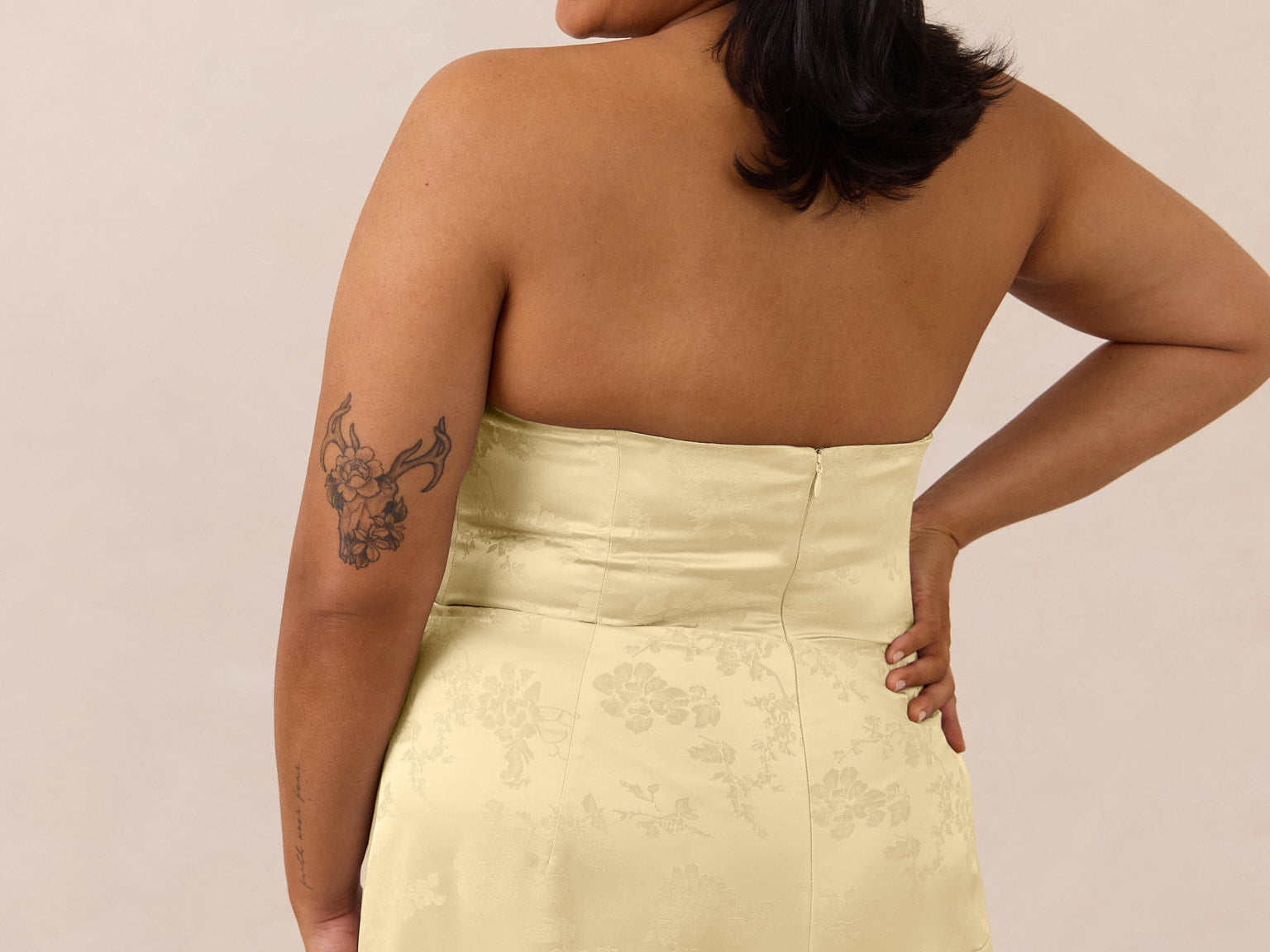 - Fitted strapless bodice with boning