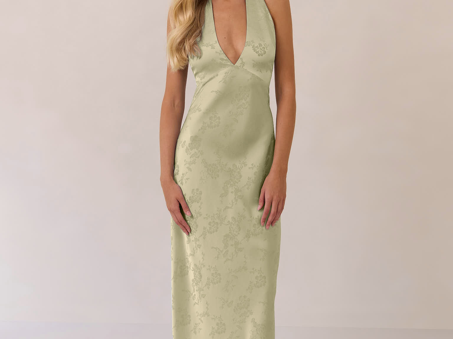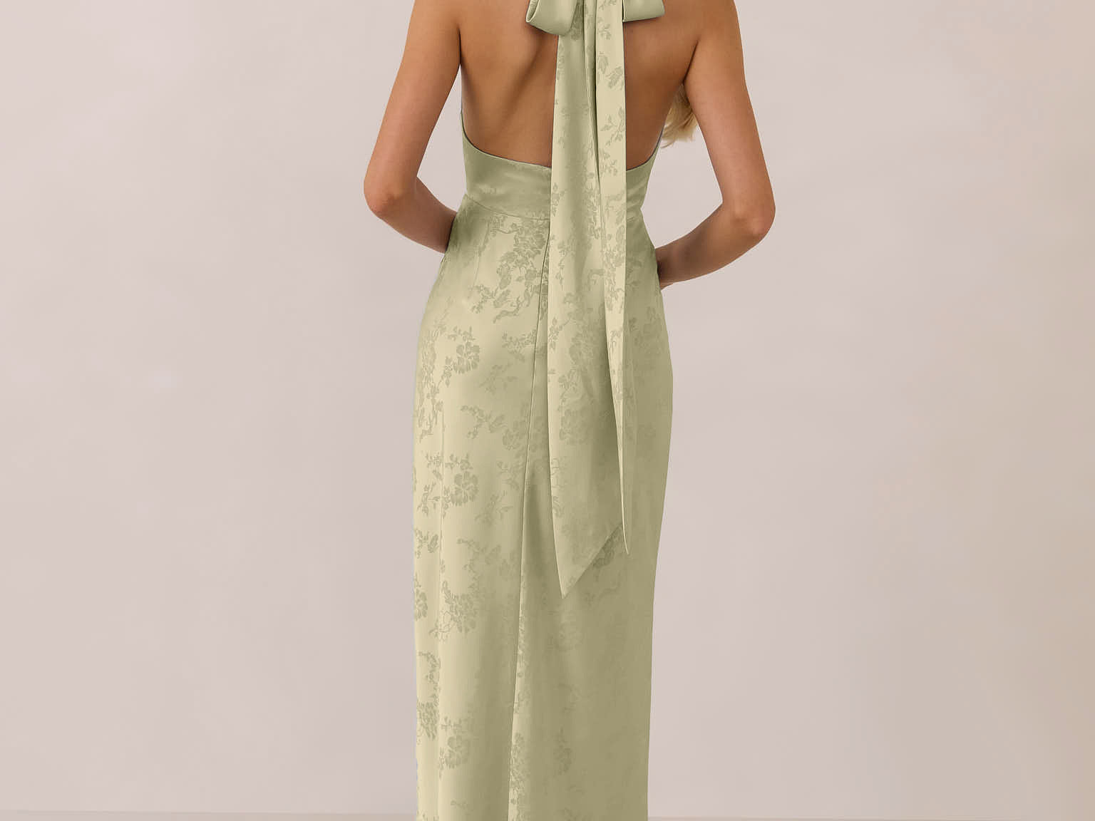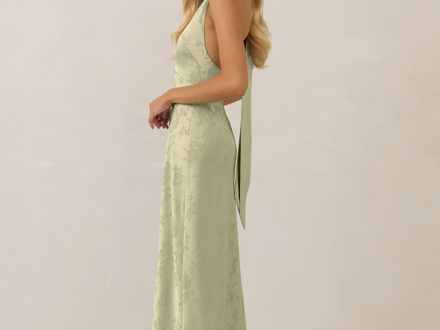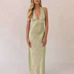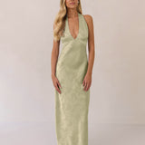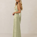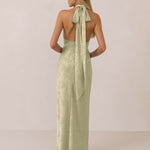 A sleek and versatile silhouette crafted in luxurious Jacquard for a touch of texture and sophistication. Designed for effortless elegance, it features a halter neckline with a dramatic open back and long ties that can be styled as a scarf or knotted for a custom halter look. The bias-cut skirt flows beautifully into a flattering maxi length, creating graceful movement with every step.