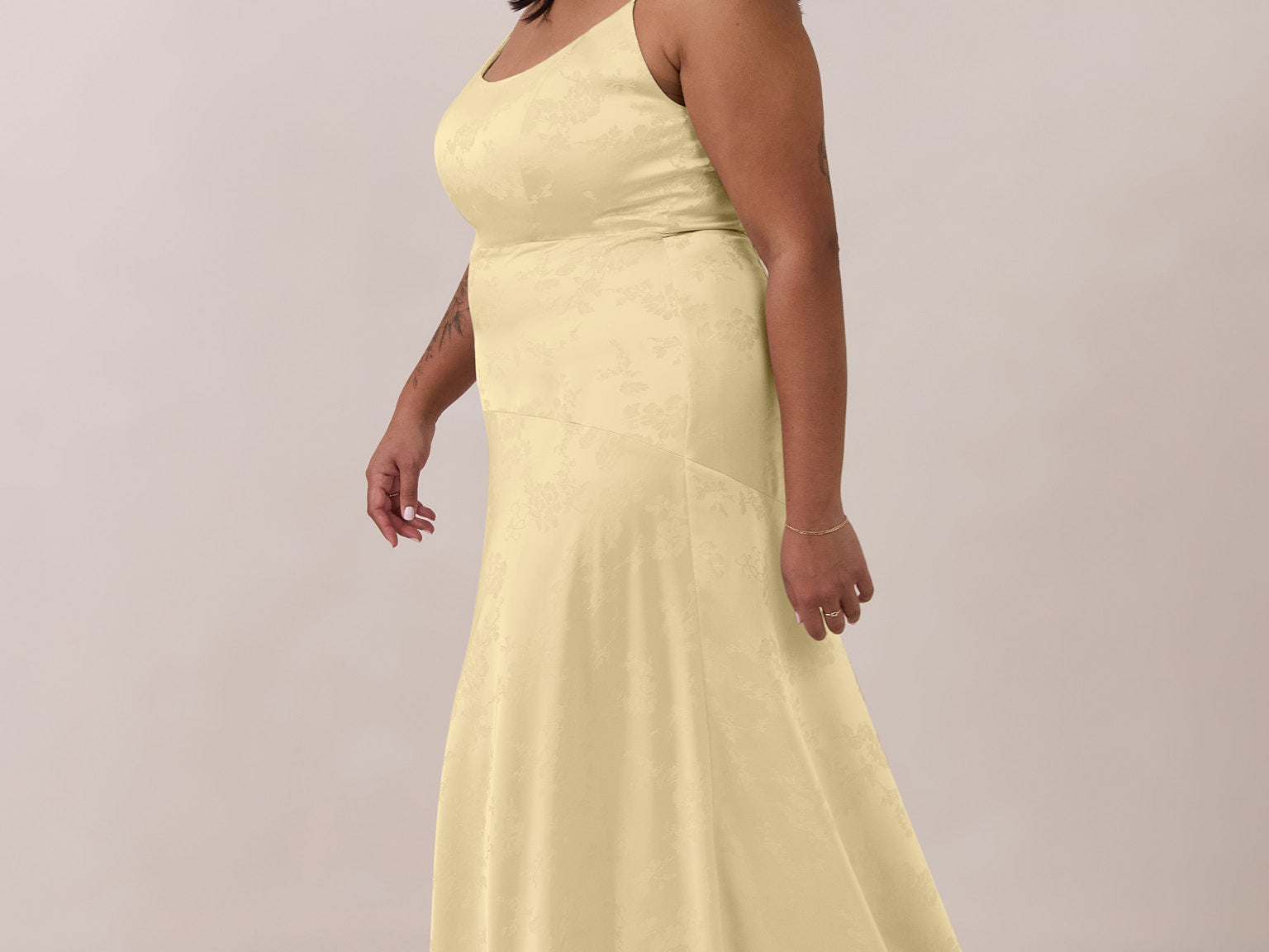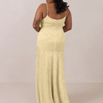 Crafted from luxurious Jacquard satin, this full-length dress features adjustable straps and a flattering drop waist, creating an elegant silhouette with timeless appeal. The scoop neckline and back add a delicate, feminine touch, while the bias-cut skirt flows gracefully to the floor, combining sophistication and comfort for a truly captivating look.