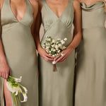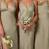 Featuring a flattering V-neckline, gathering at the bust, and an open back, this bias-cut dress offers a sleek, elongating silhouette. The clean lines and minimalist design make it the perfect choice for any special occasion.