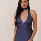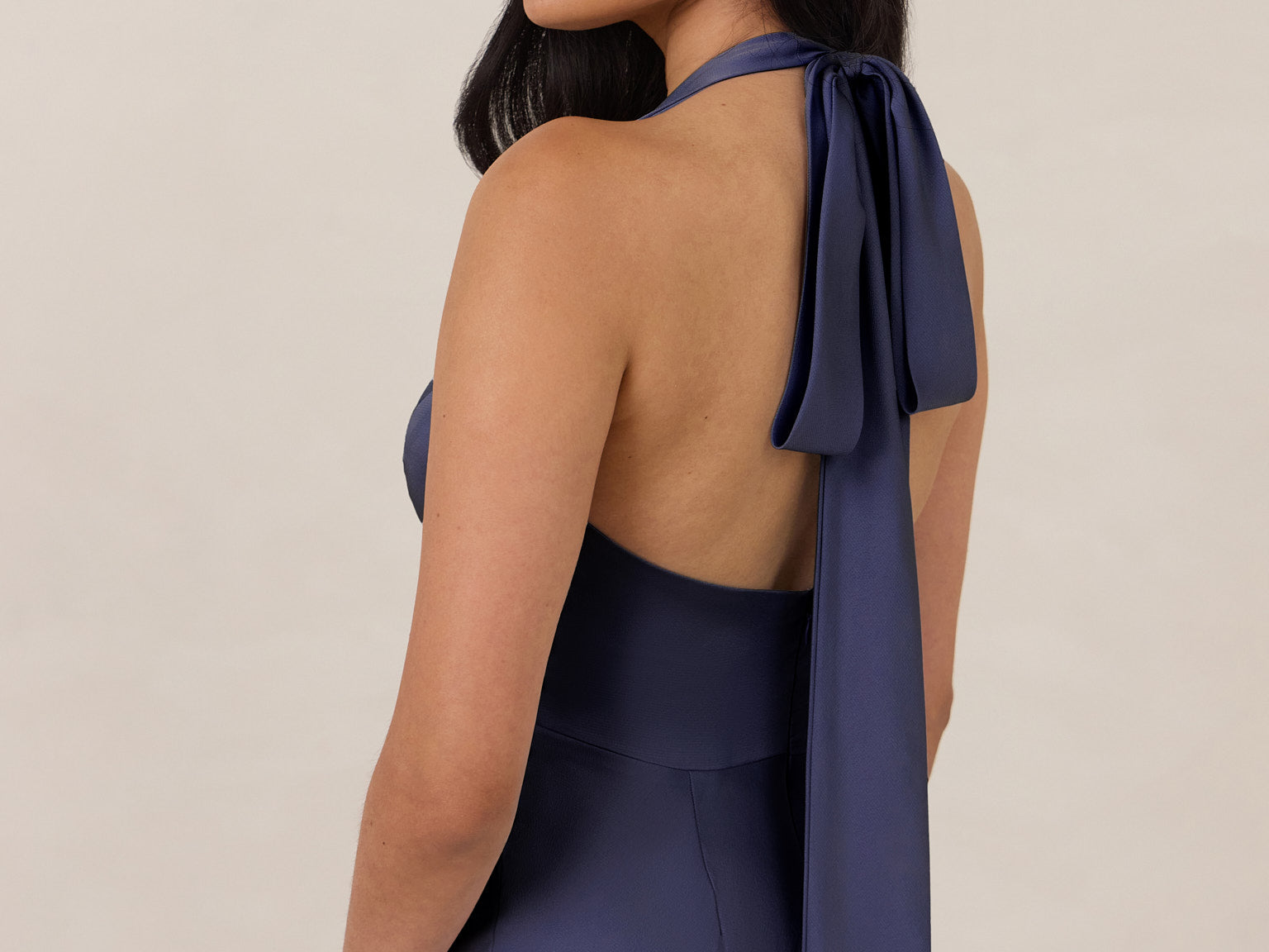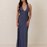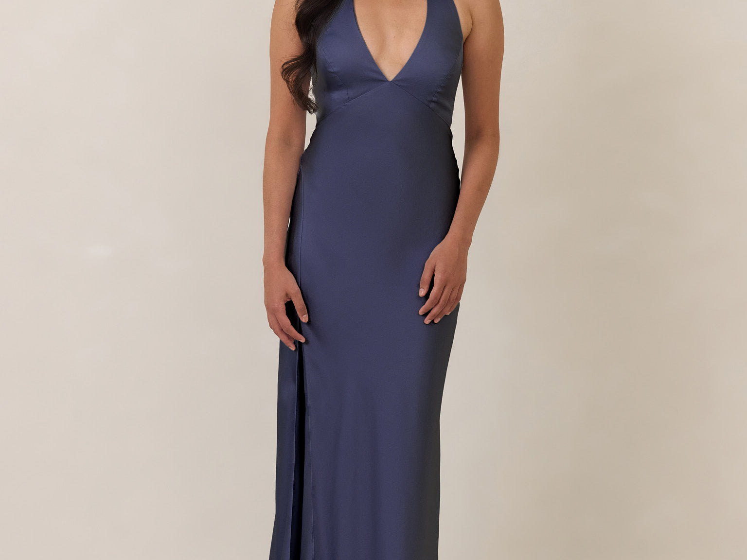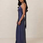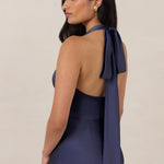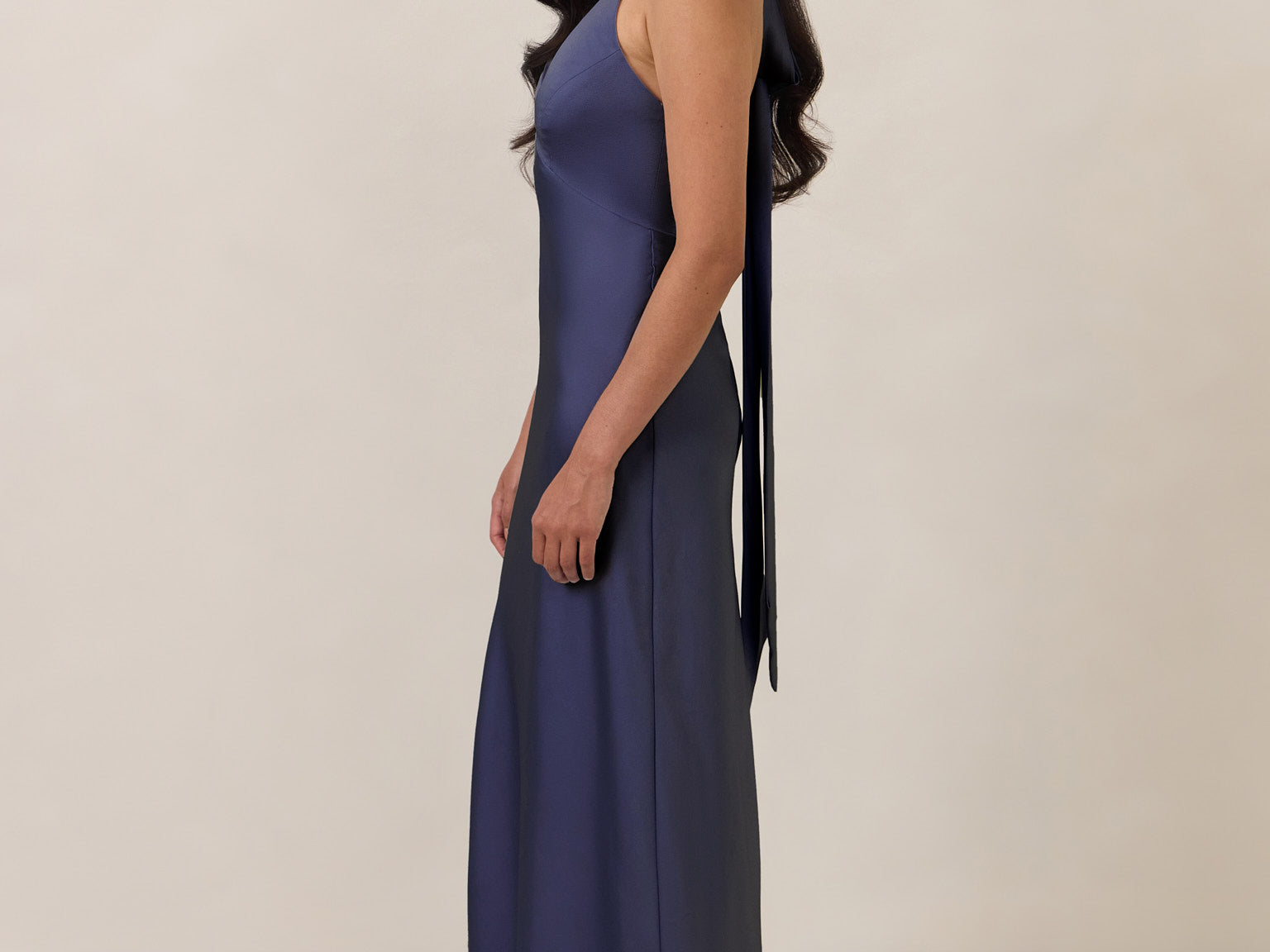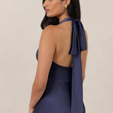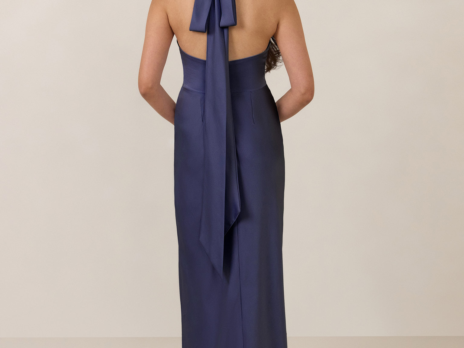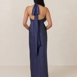 Designed to turn heads. Crafted from our smooth satin, this bust-friendly halter style features long, versatile ties that can be styled in a bow or worn as a neck scarf for a modern touch. Finished with a bias-cut skirt and a subtle slit, this dress effortlessly balances elegance with a bold edge.