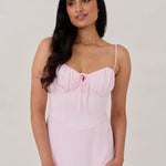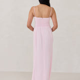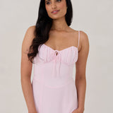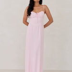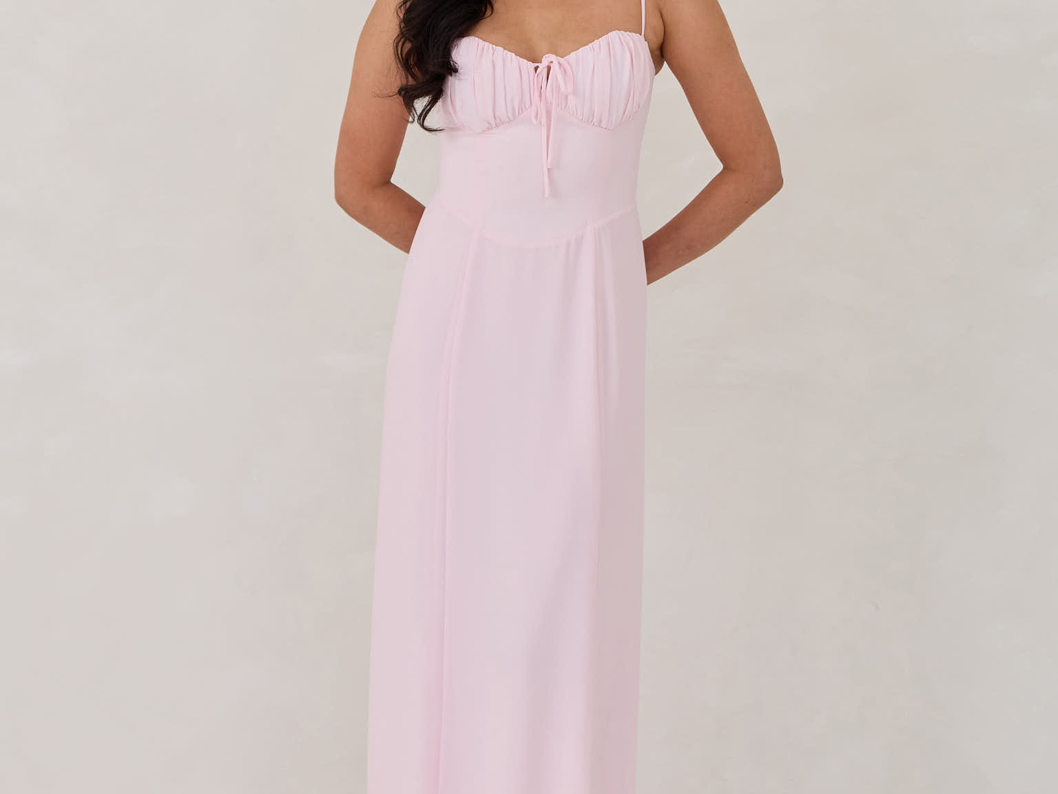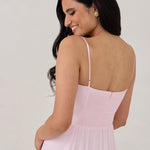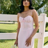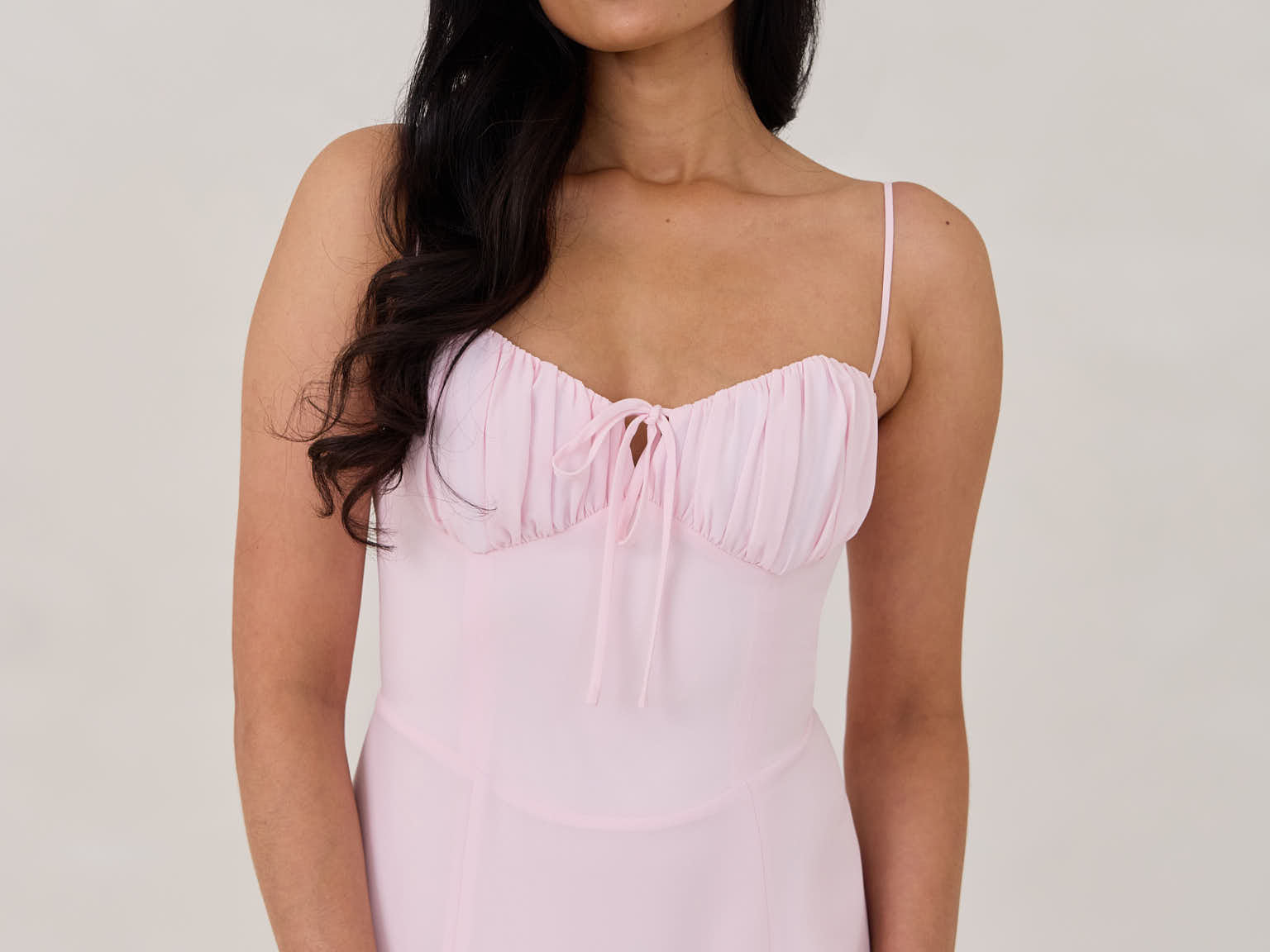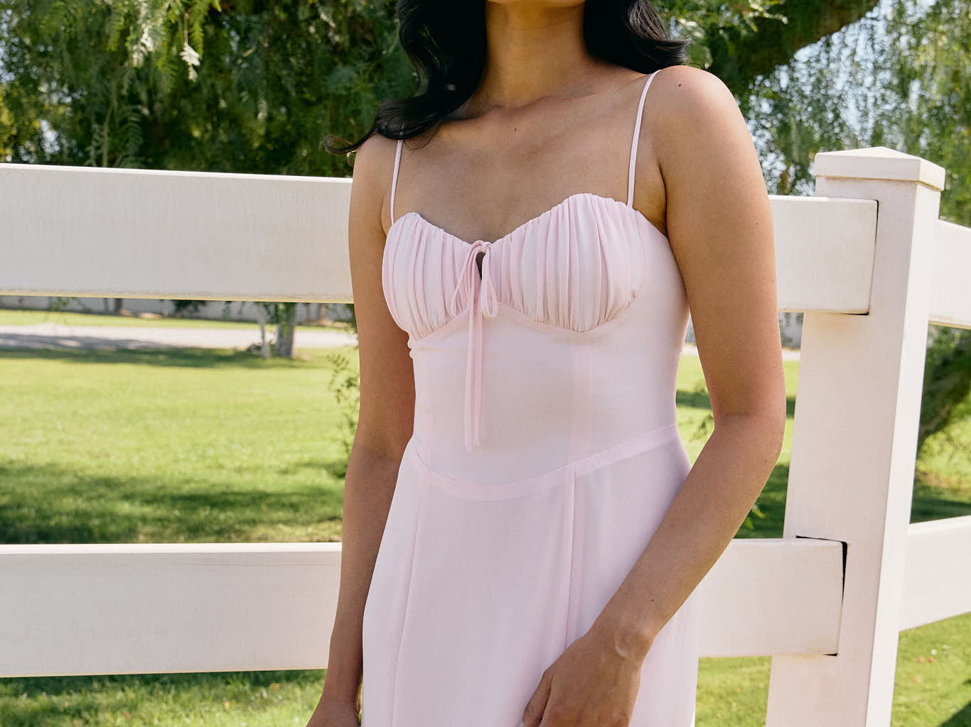 Designed with a basque waist and structured paneling, this dress offers a flattering, sculpted silhouette. The ruched bodice and shirred back give it a comfortable, flexible fit.