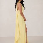 Perfect for turning heads at any event. Featuring a trend-forward scarf detail and a striking asymmetrical neckline, this design makes a bold statement. The slit skirt completes the look, creating a graceful silhouette.