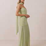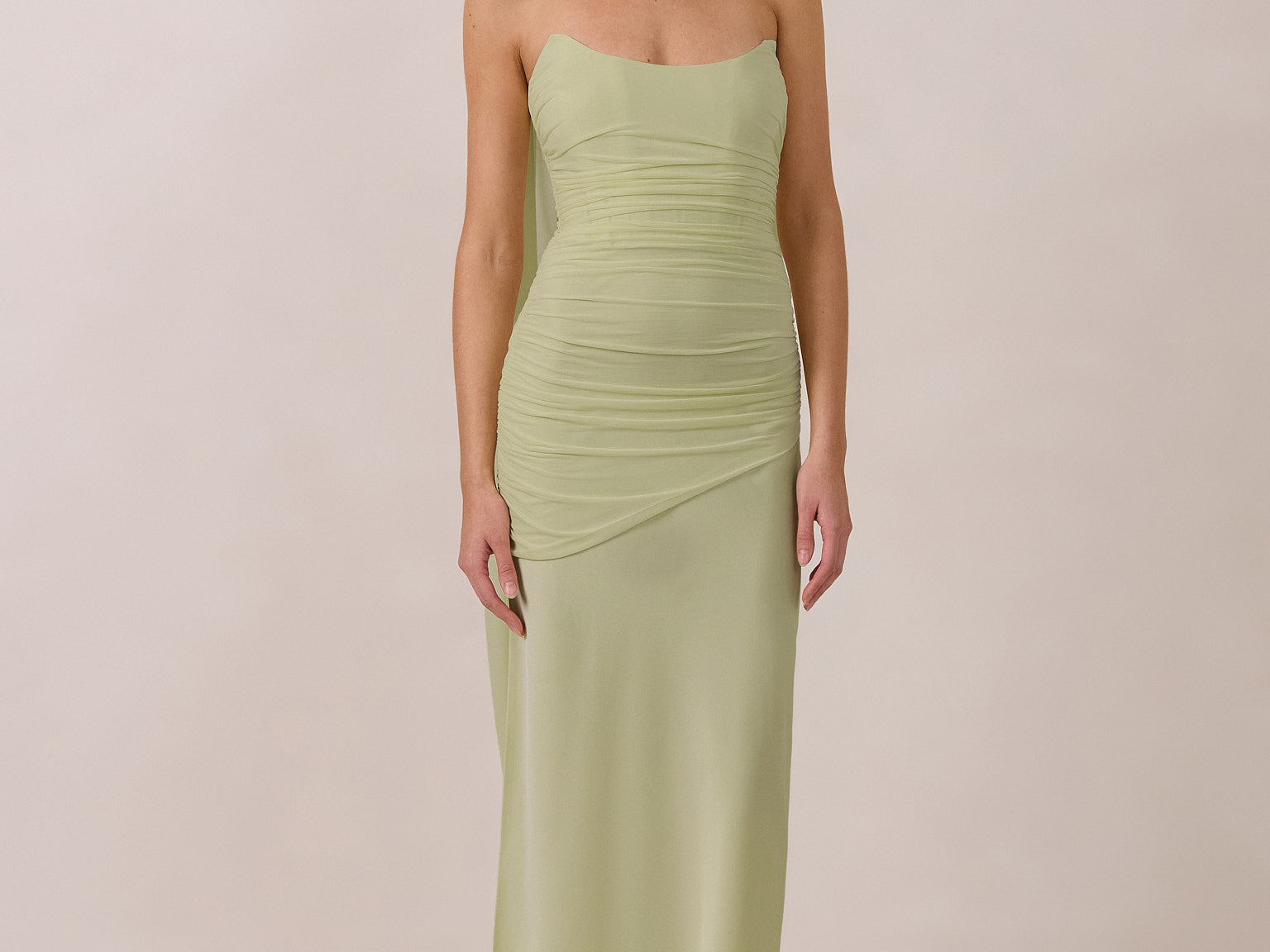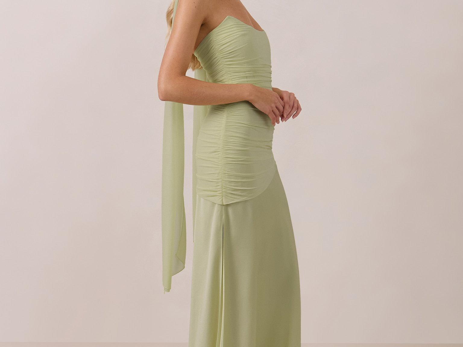 This full-length strapless dress, designed from stretch mesh and satin, offers effortless glamour. It features a boned bodice with a pointed neckline, flattering gathered detailing, and a high side slit, making it a captivating statement piece for any black-tie event.