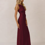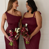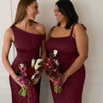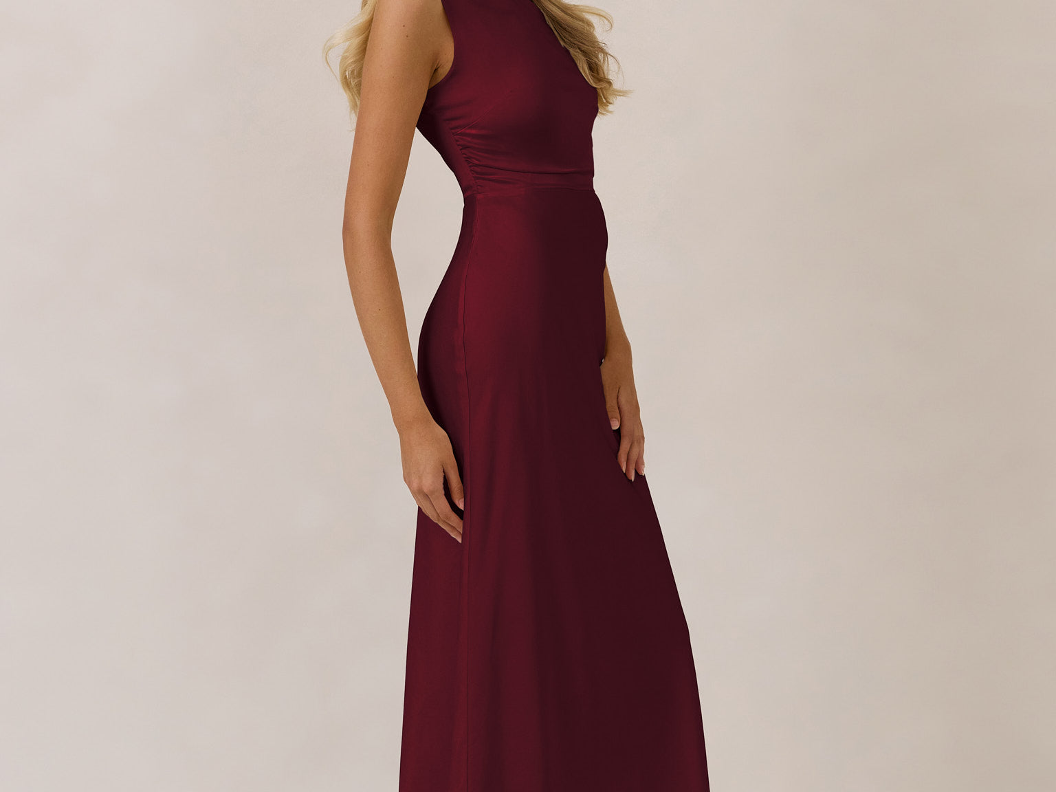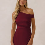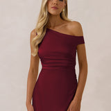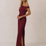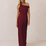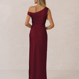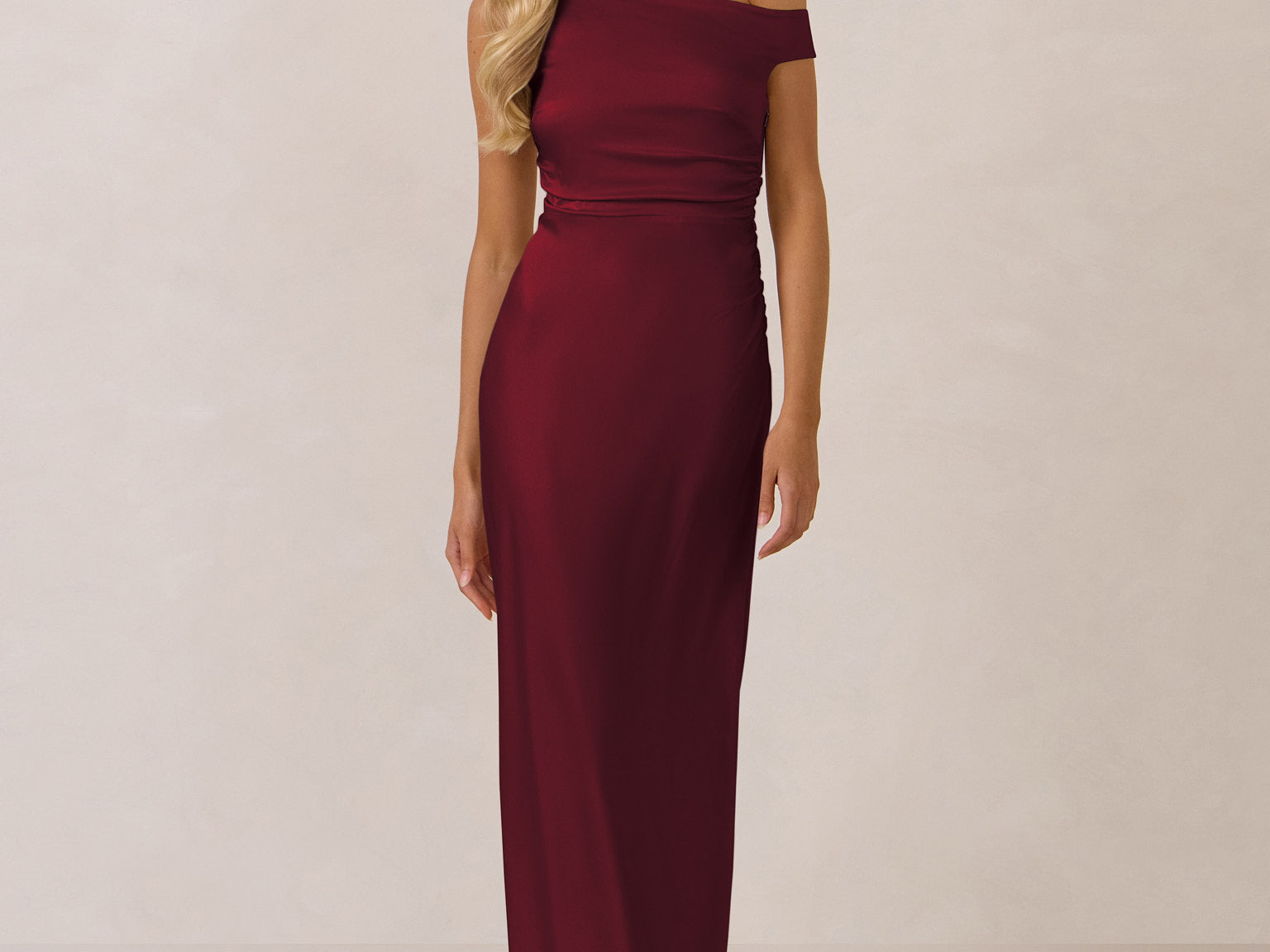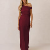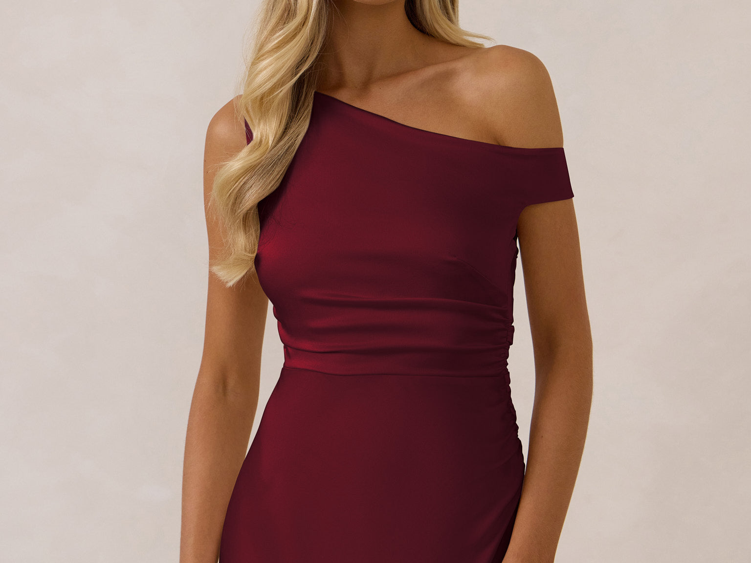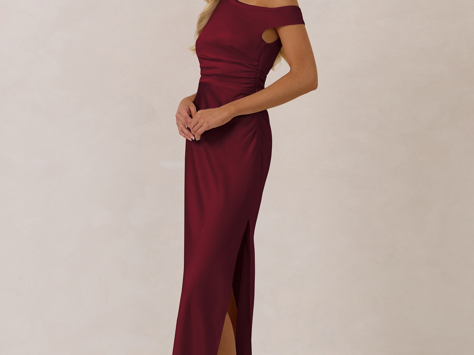 We love an asymmetrical neckline. This full-length dress strikes the perfect balance between modern sophistication and a flattering fit with its elegant silhouette, slightly gathered bodice, and a stylish side slit for a touch of effortless elegance.