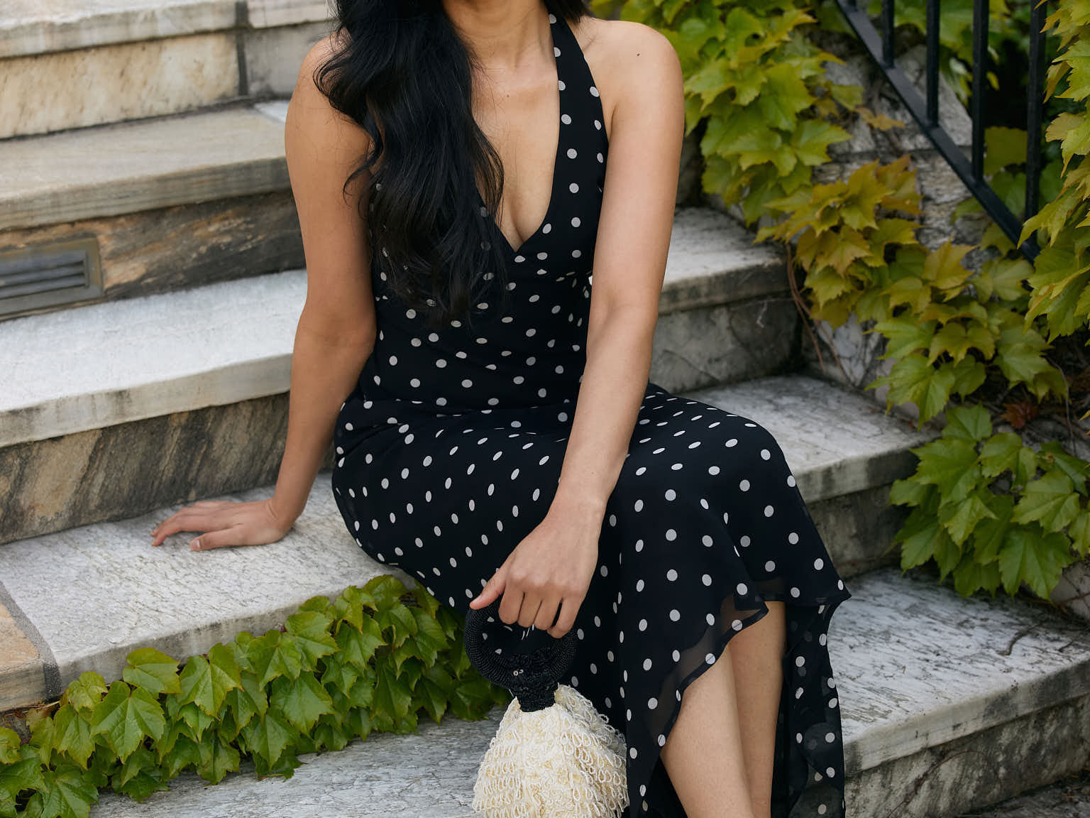 Effortlessly chic halter neck design crafted from soft chiffon that can be worn either as a halter or with a scarf detail. Featuring a bias-cut tea length skirt, this dress offers a flattering, flowing silhouette that moves with ease. Perfect for any occasion, this dress combines sophistication with practicality.