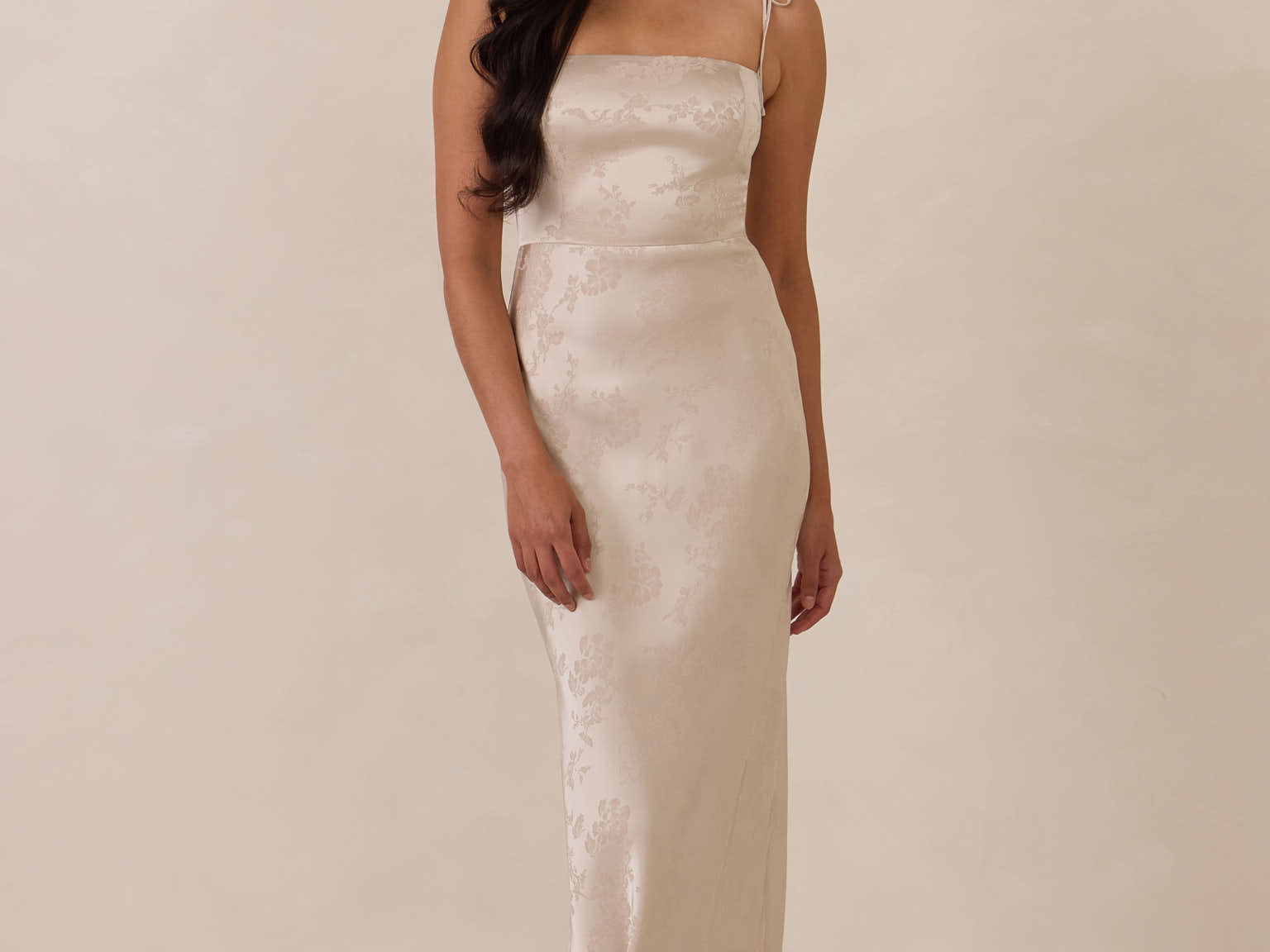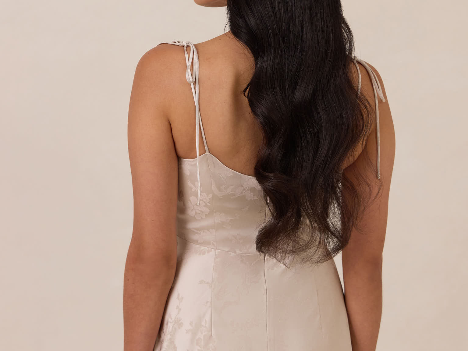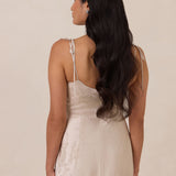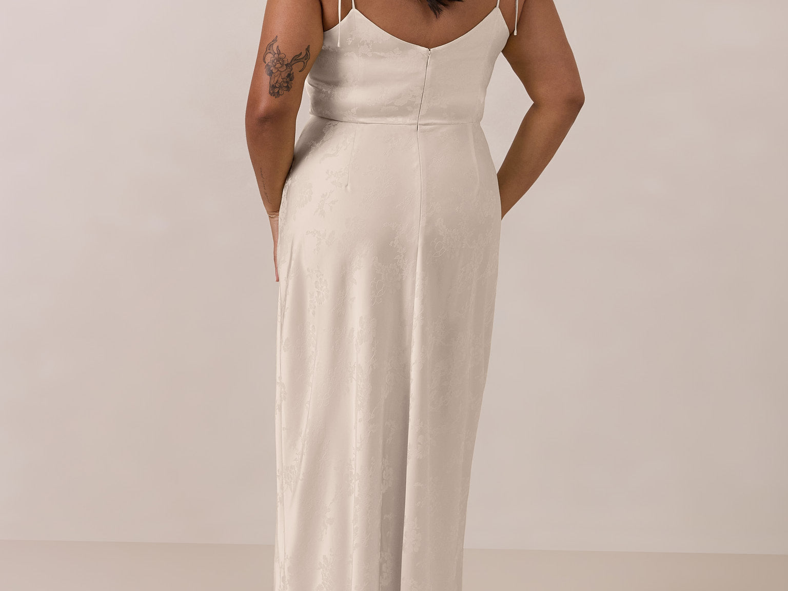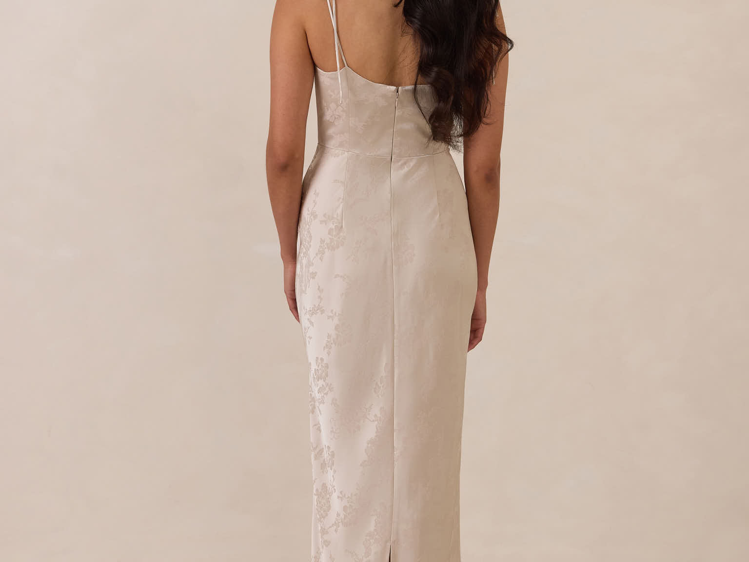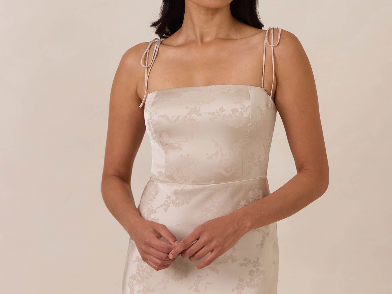 The Beckett dress embodies understated sophistication. Its floor-grazing silhouette flows effortlessly, complemented by a subtle back slit for added movement and a modern touch. Featuring a softly structured bodice and adjustable tie straps, it ensures both comfort and a tailored fit, making it perfect for any occasion requiring quiet confidence.