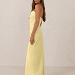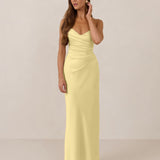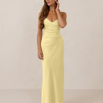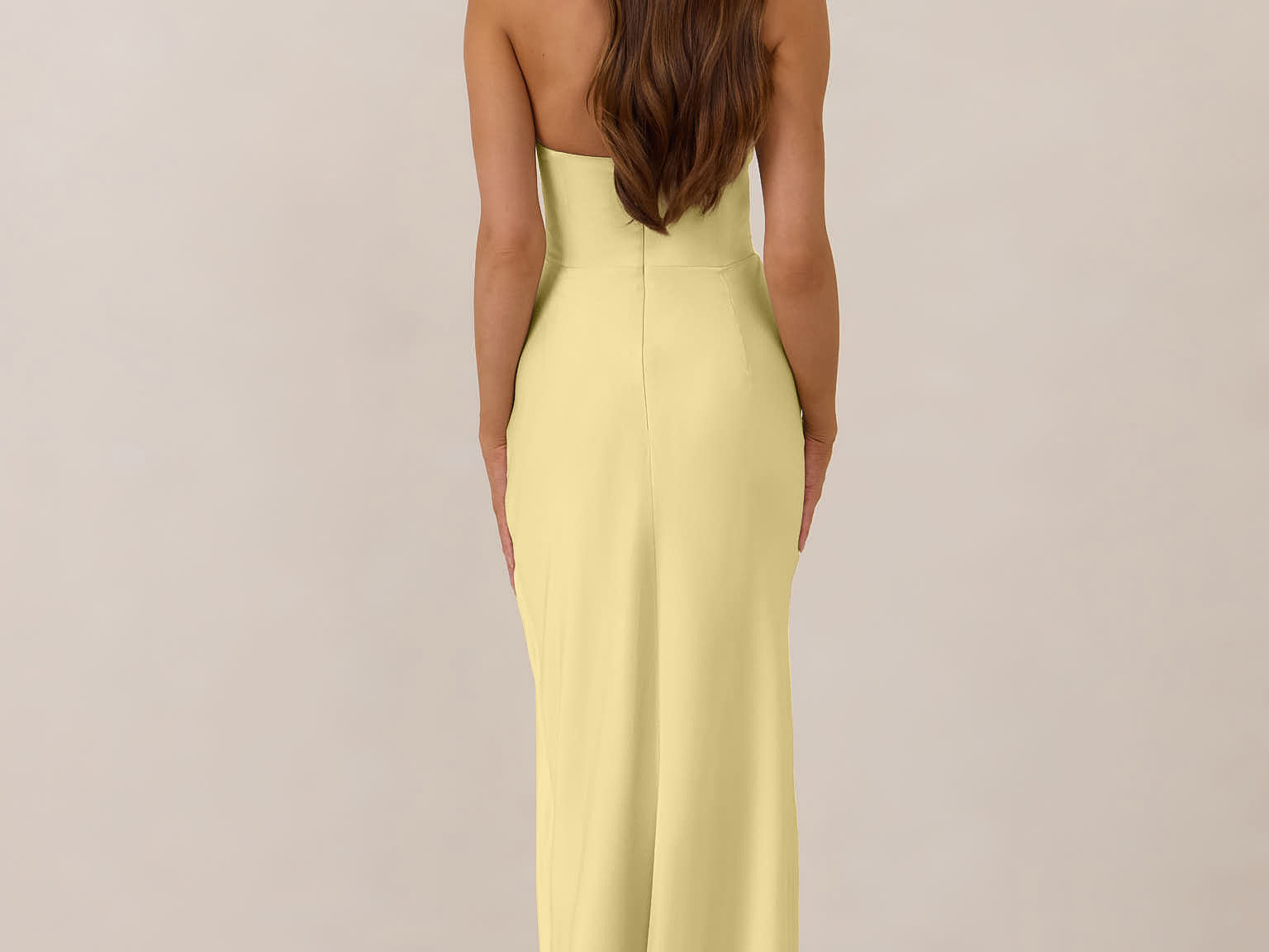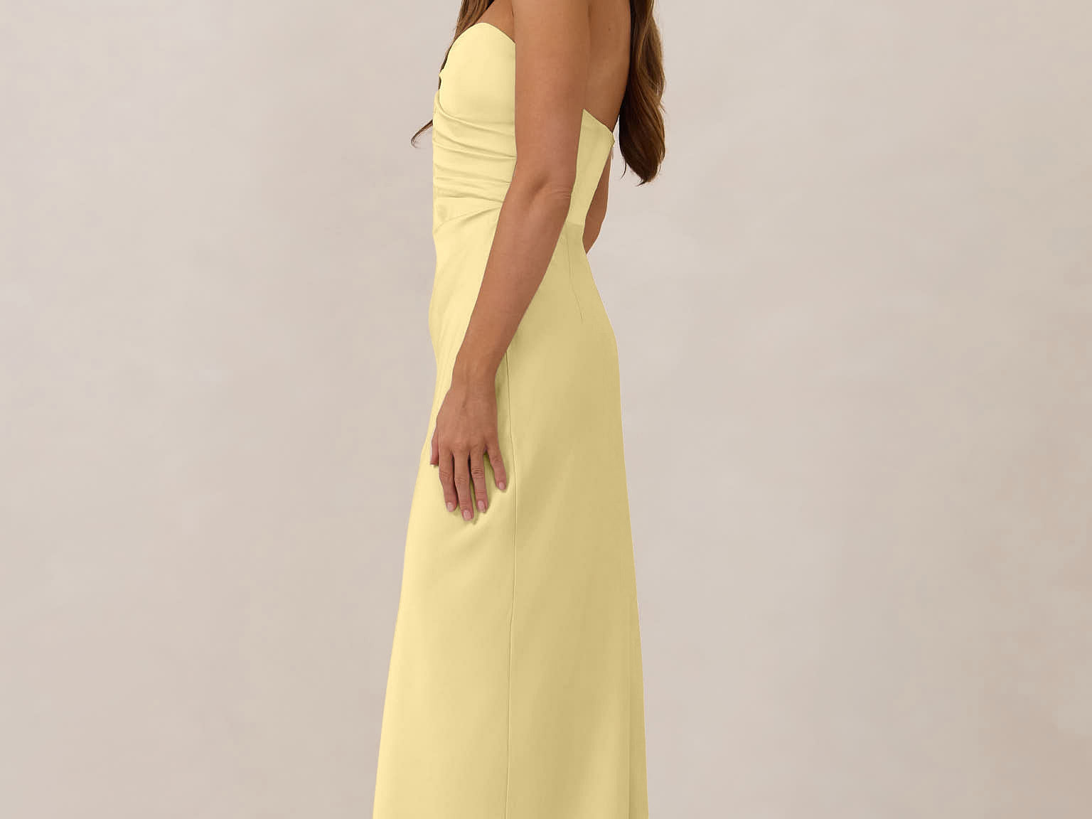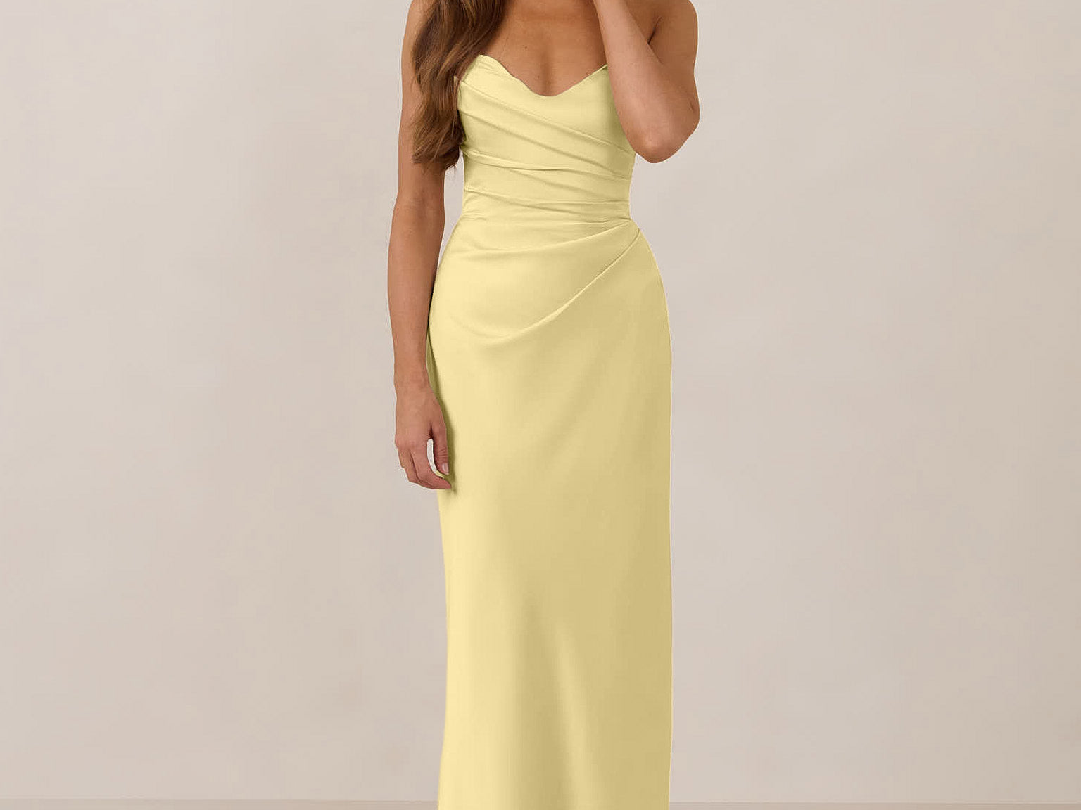 Designed with a scoop sweetheart neckline and soft pleating through the boned bodice and skirt, this dress creates a sleek, feminine silhouette. Elegant and timeless, it’s an ideal choice for weddings, receptions, or any formal occasion.