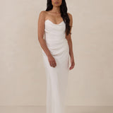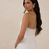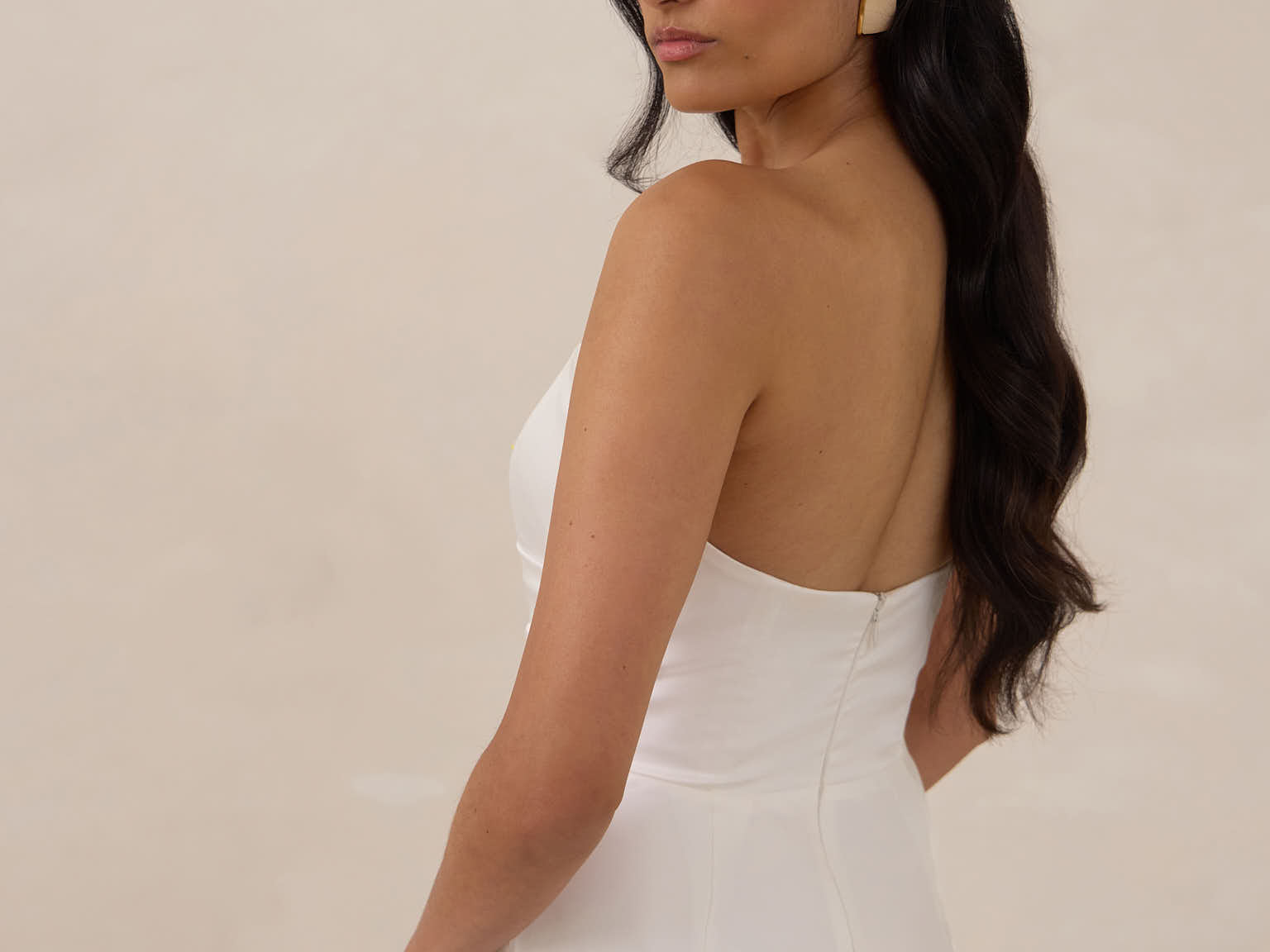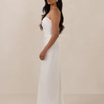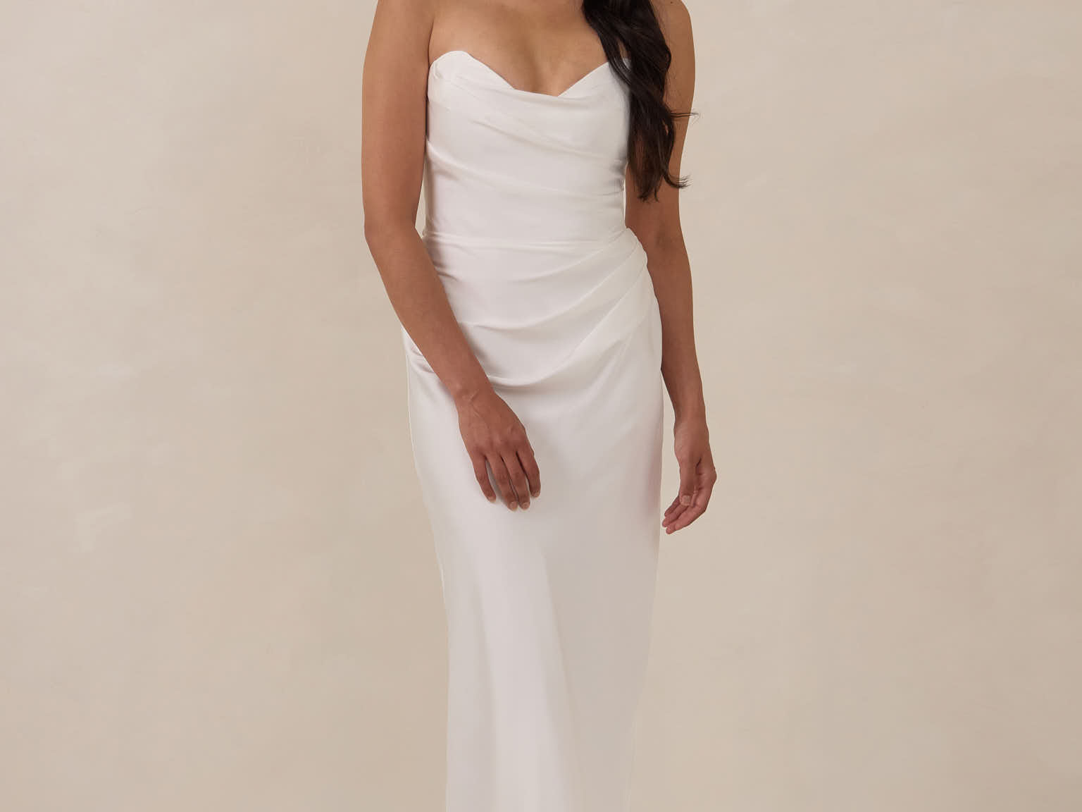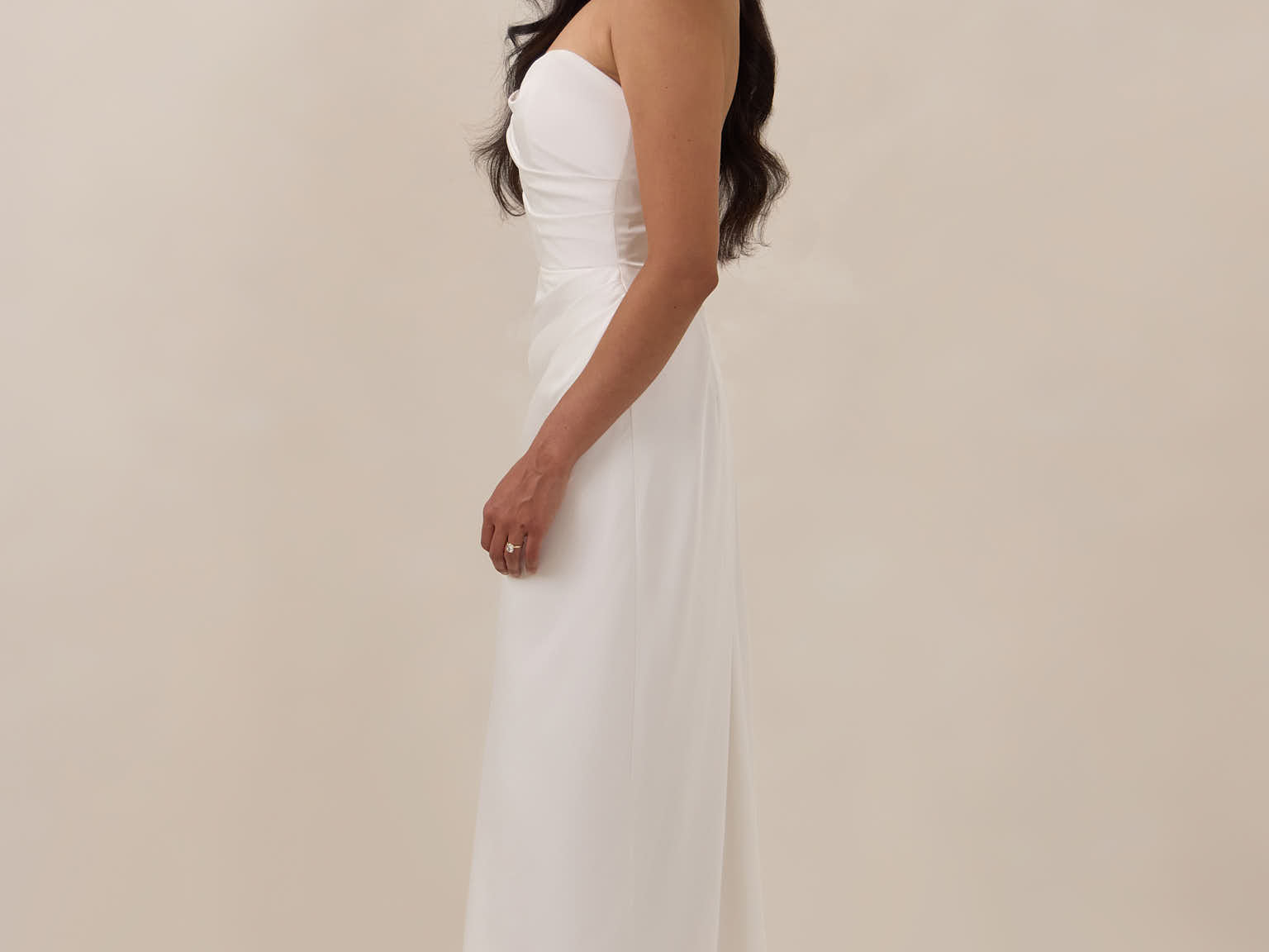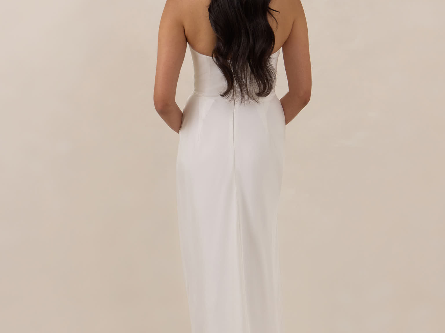 Designed with a scoop sweetheart neckline and soft pleating through the boned bodice and skirt, this dress creates a sleek, feminine silhouette. Elegant and timeless, it’s an ideal choice for your special day.