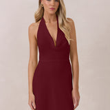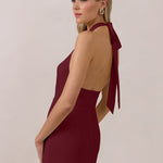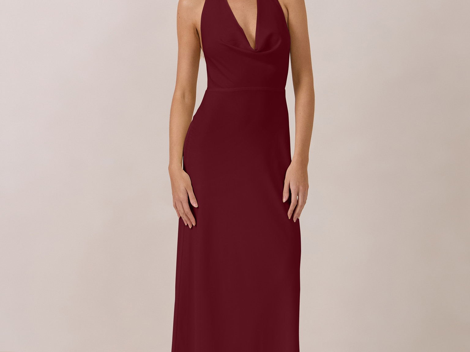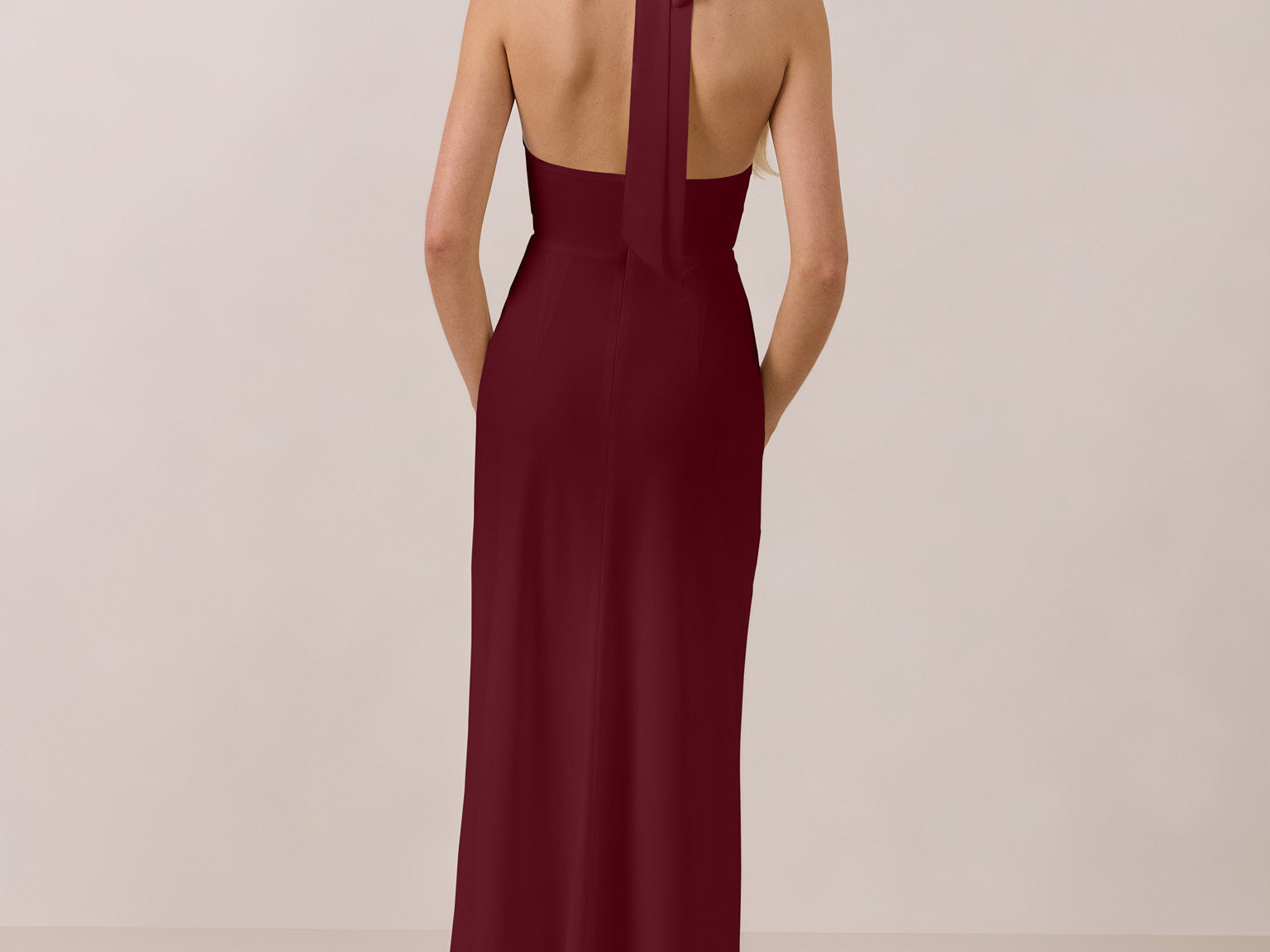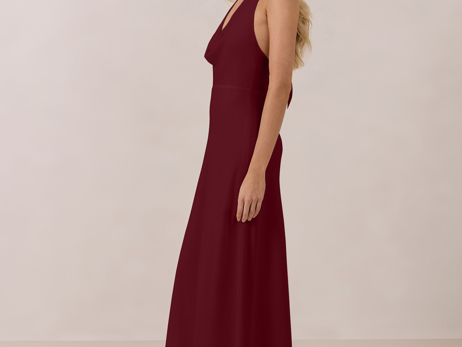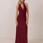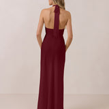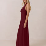 This elegant, full-length chiffon dress is designed to move gracefully, with a lustrous finish that highlights the delicate halter back and the softly draped cowl neckline. An unforgettable, timeless piece perfect for any special occasion.