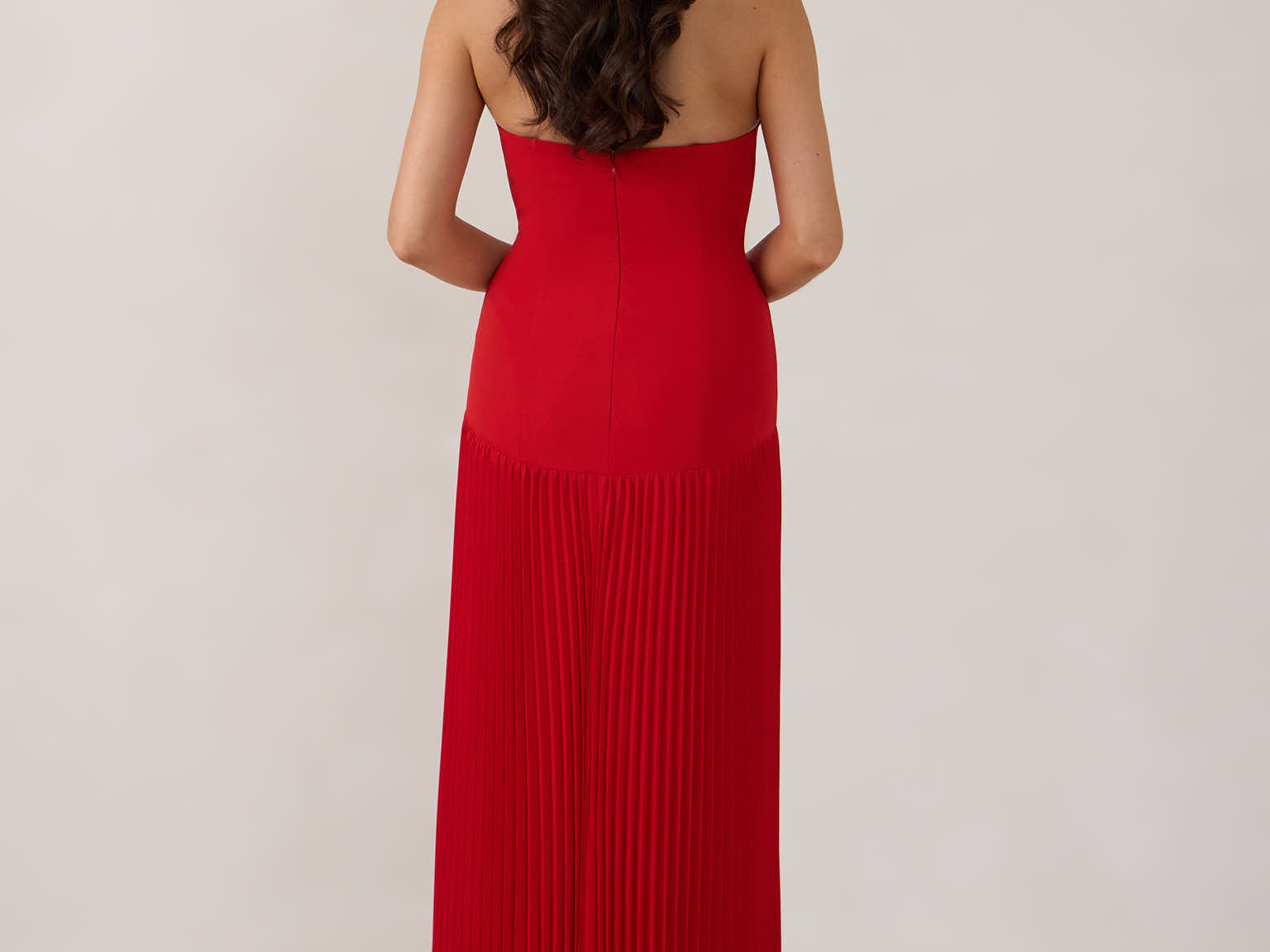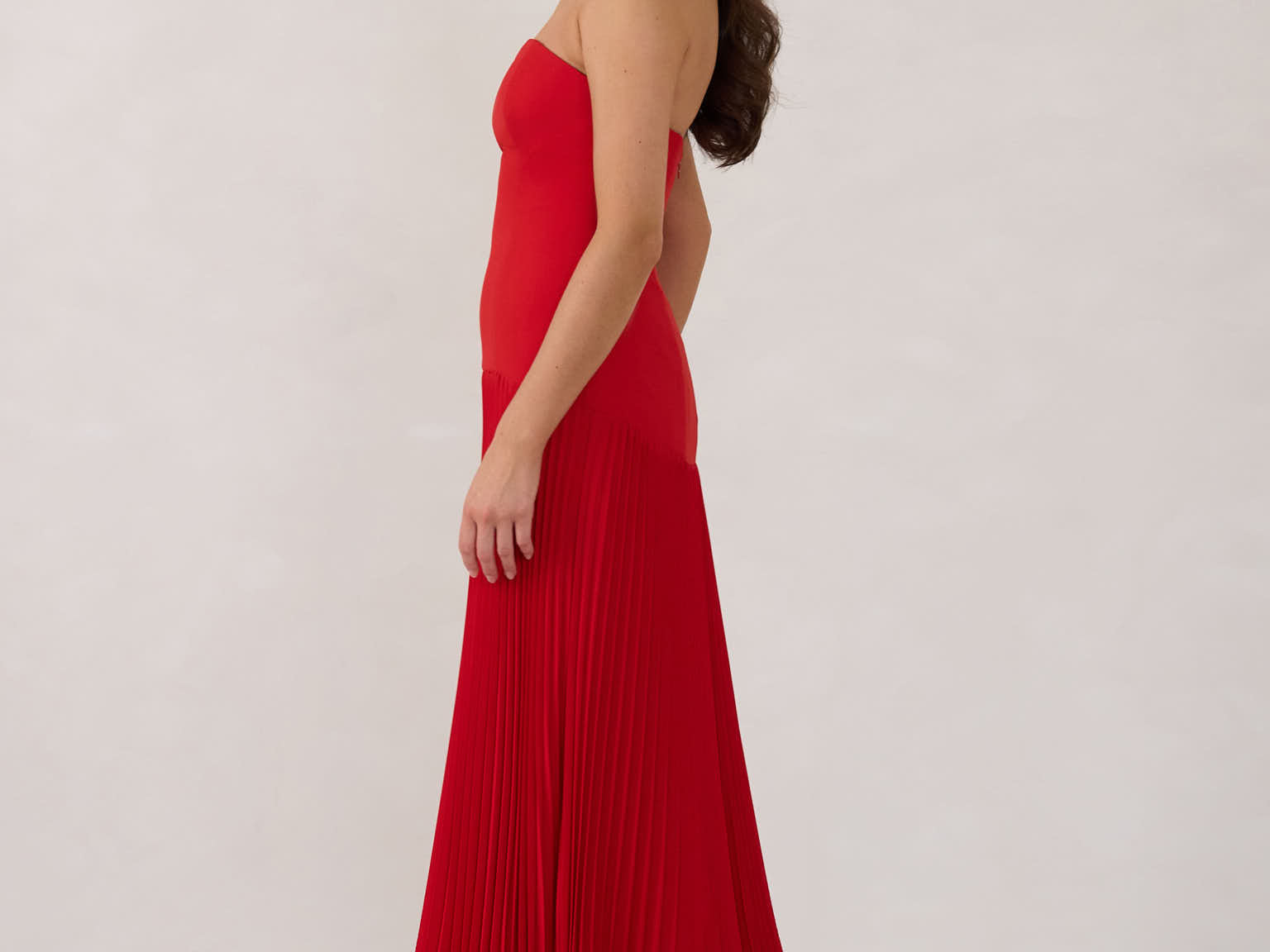 The contrast of the sleek bodice and the pleated skirt make this dress a real stunner. With boning through the bodice and into the dropped waist, and a light flowy skirt, you’ll be all set to dance the night away - twirls included.