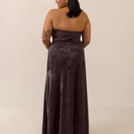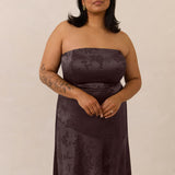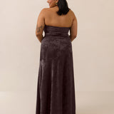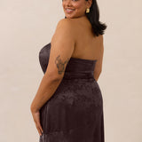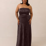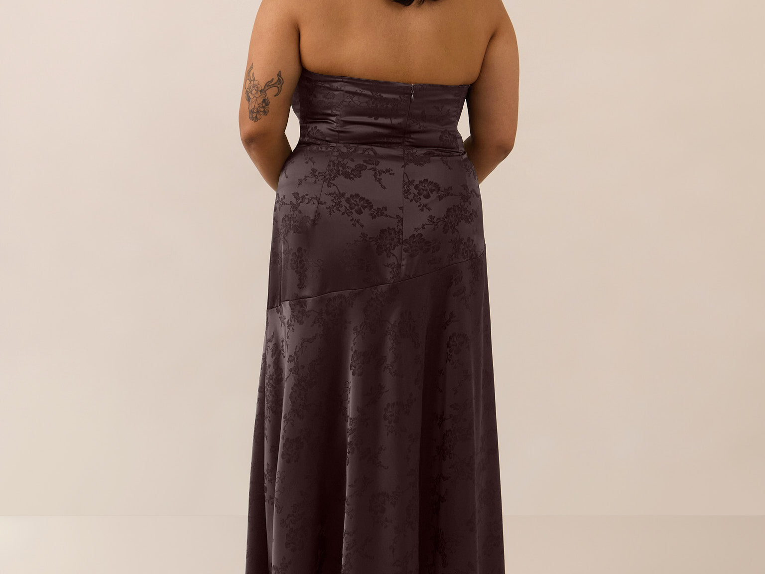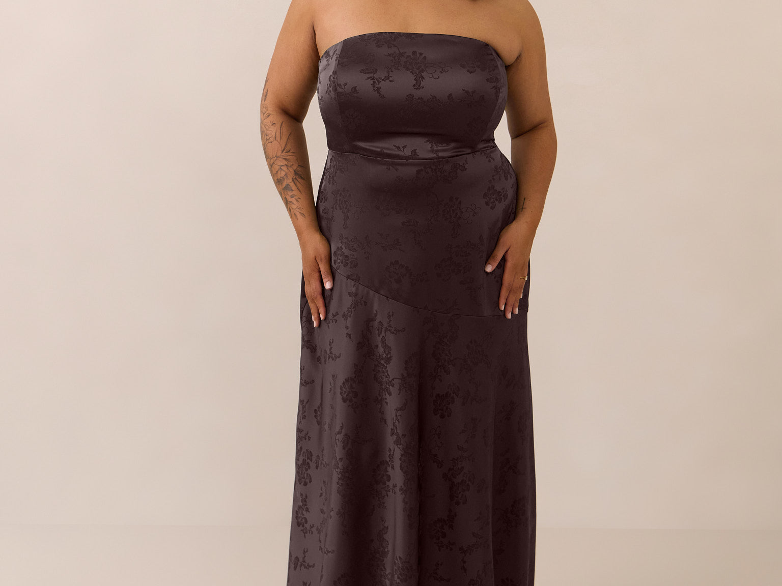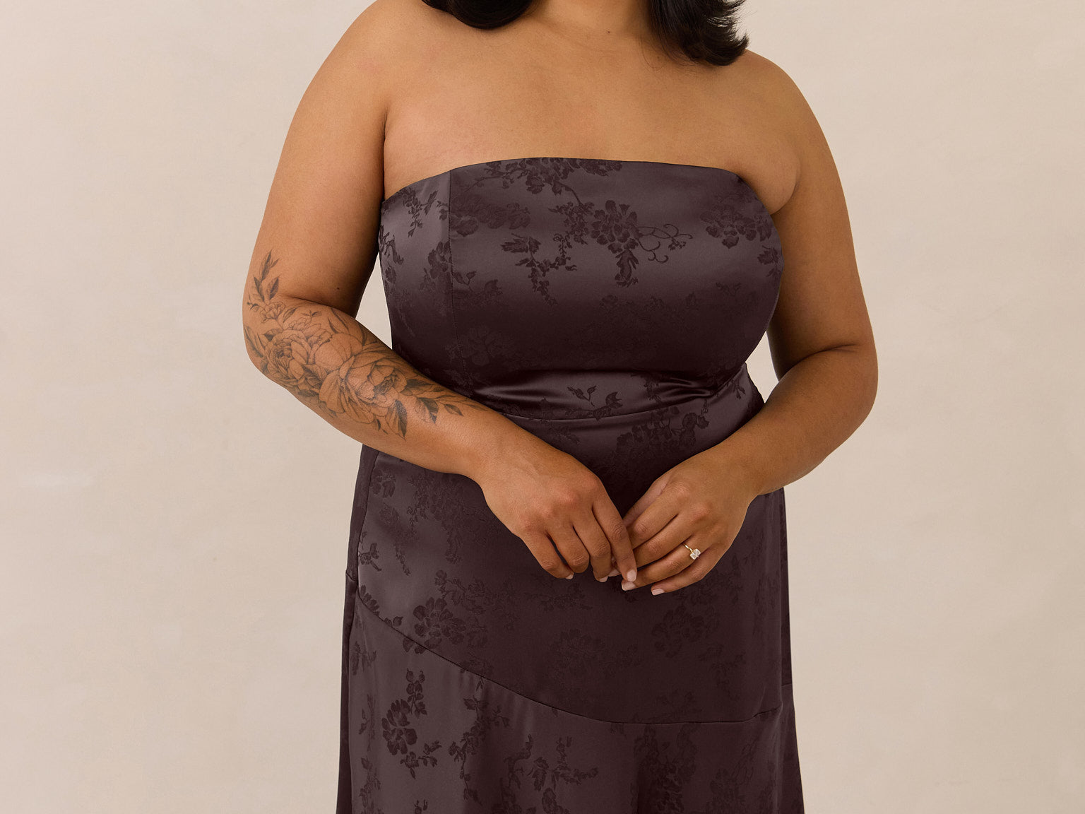 The Delaney is a full-length, strapless silhouette crafted from luxurious Jacquard satin. Clean lines and a smooth, sculpted bodice create a timeless look, while the sleek finish makes it an elevated choice for any bridal party.