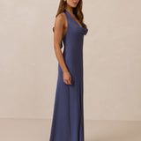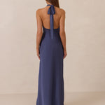 Effortlessly elegant, this bias-cut satin maxi dress features a fluid skirt with a curved thigh-high slit and a draped cowl neckline. A delicate halter back completes the look. Perfect for any occasion, it's glossy and flattering.