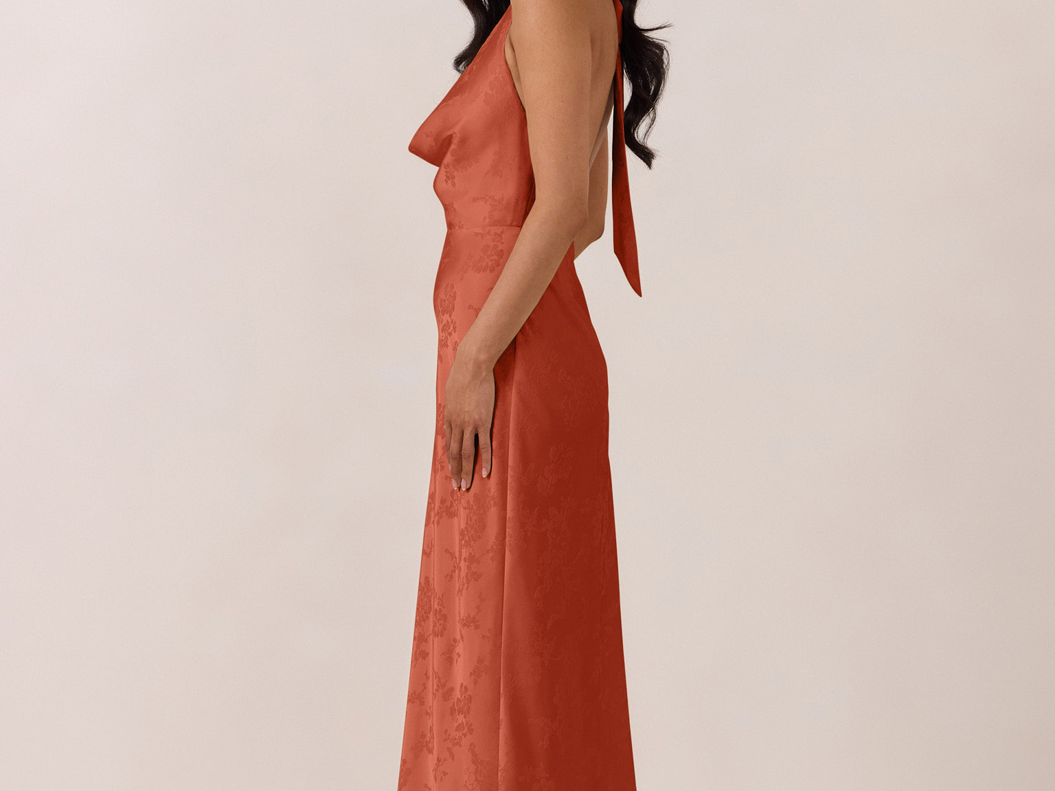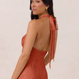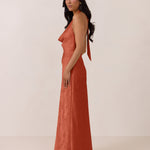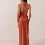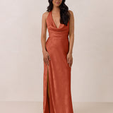 Effortlessly elegant, this bias-cut satin maxi dress features a fluid skirt with a curved thigh-high slit and a draped cowl neckline. A delicate halter back completes the look. Perfect for any occasion, it's glossy and flattering.