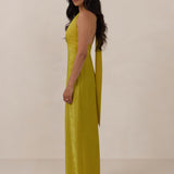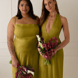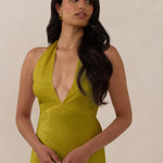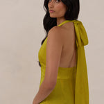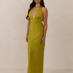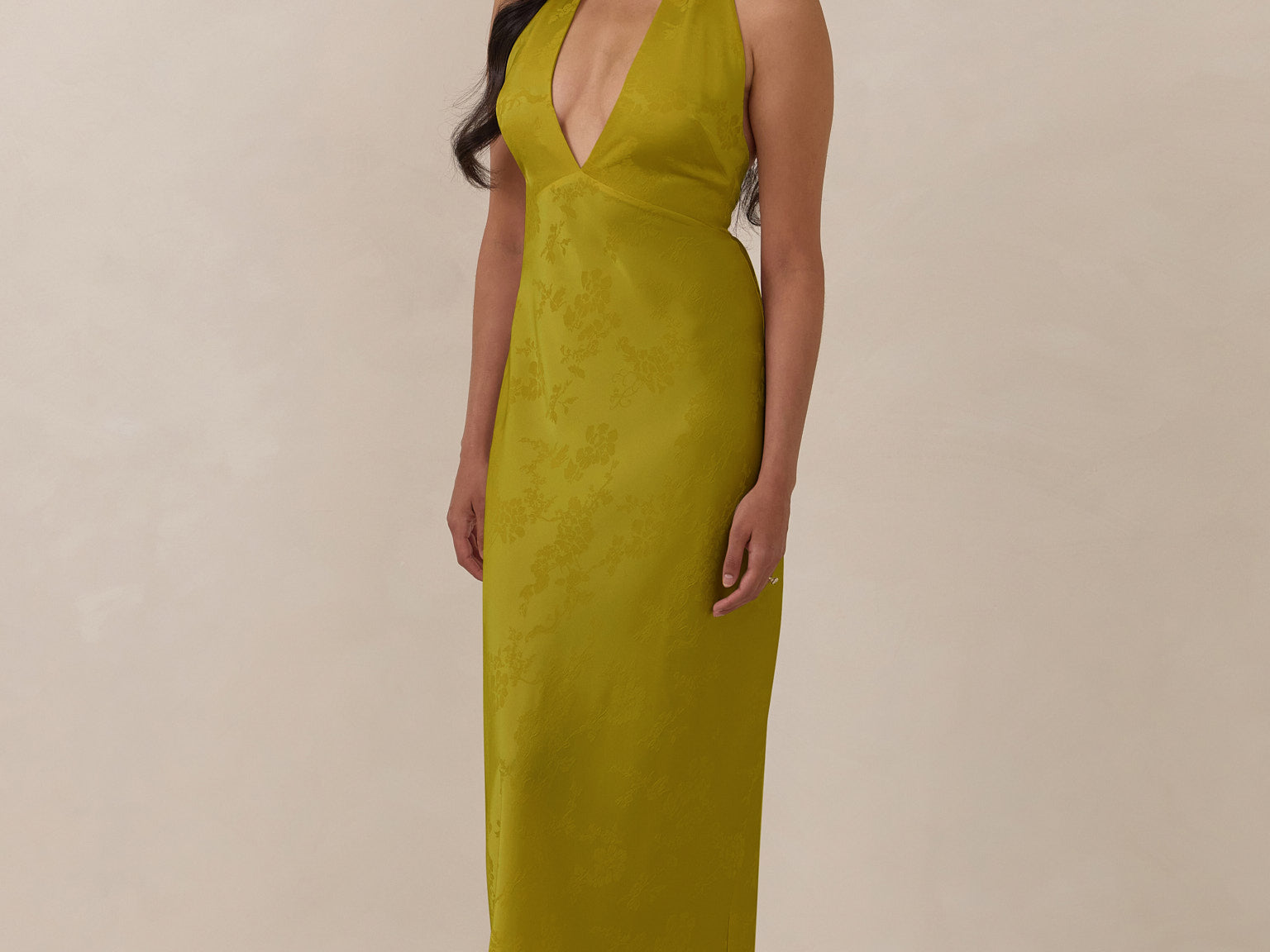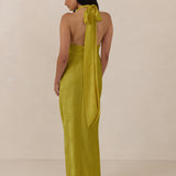 A sleek and versatile silhouette crafted in luxurious Jacquard for a touch of texture and sophistication. Designed for effortless elegance, it features a halter neckline with a dramatic open back and long ties that can be styled as a scarf or knotted for a custom halter look. The bias-cut skirt flows beautifully into a flattering maxi length, creating graceful movement with every step.