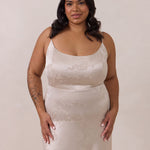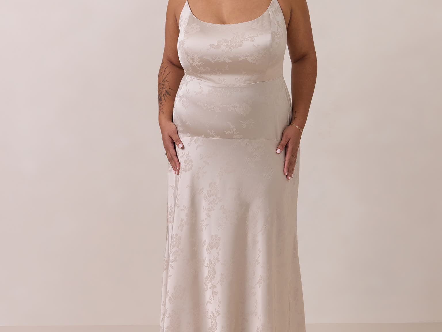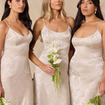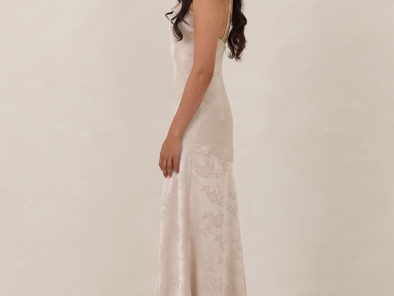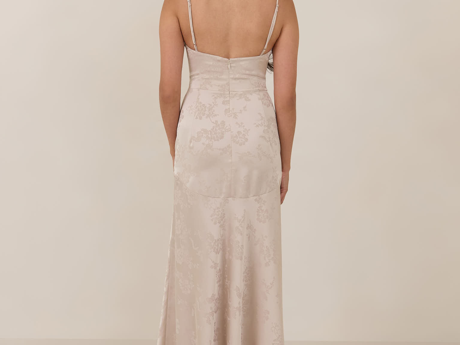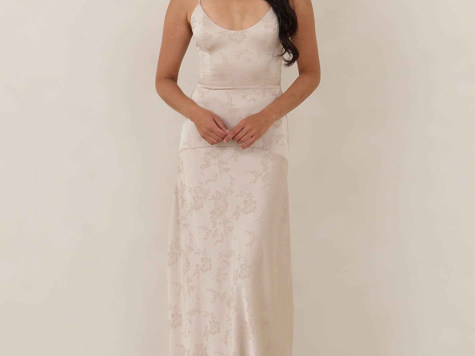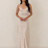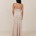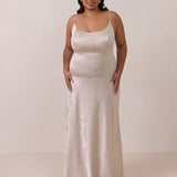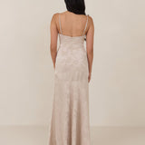Crafted from luxurious Jacquard satin, this full-length dress features adjustable straps and a flattering drop waist, creating an elegant silhouette with timeless appeal. The scoop neckline and back add a delicate, feminine touch, while the bias-cut skirt flows gracefully to the floor, combining sophistication and comfort for a truly captivating look.
