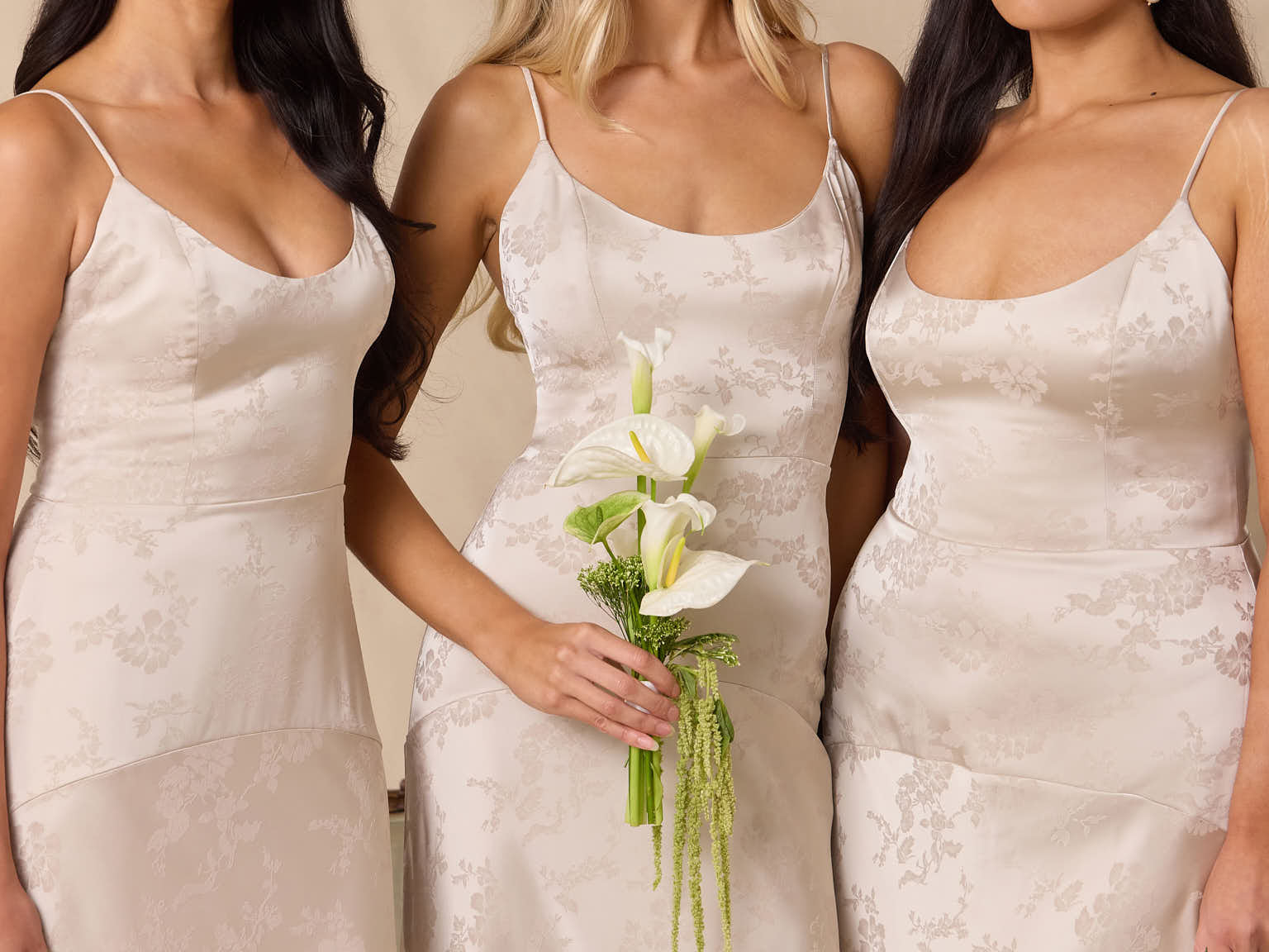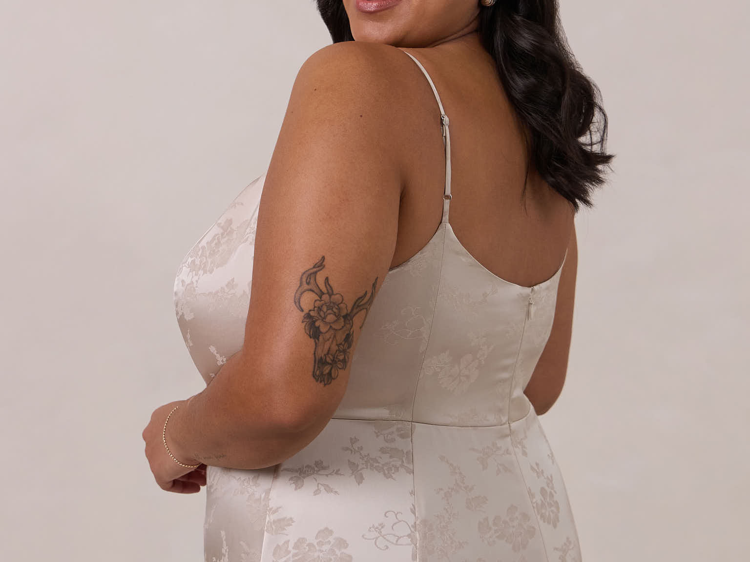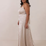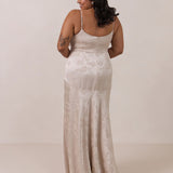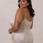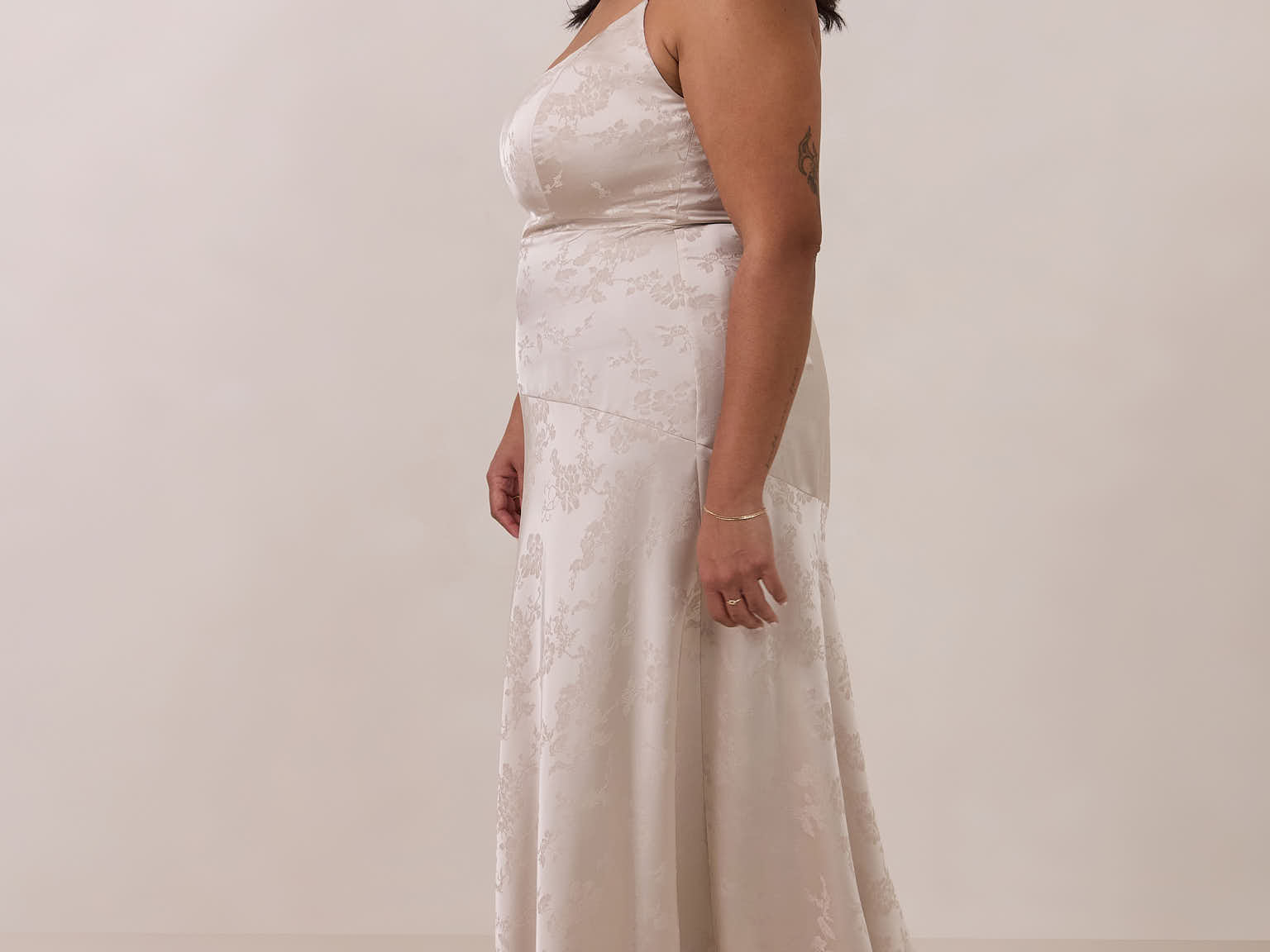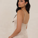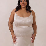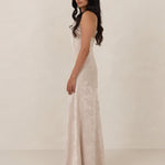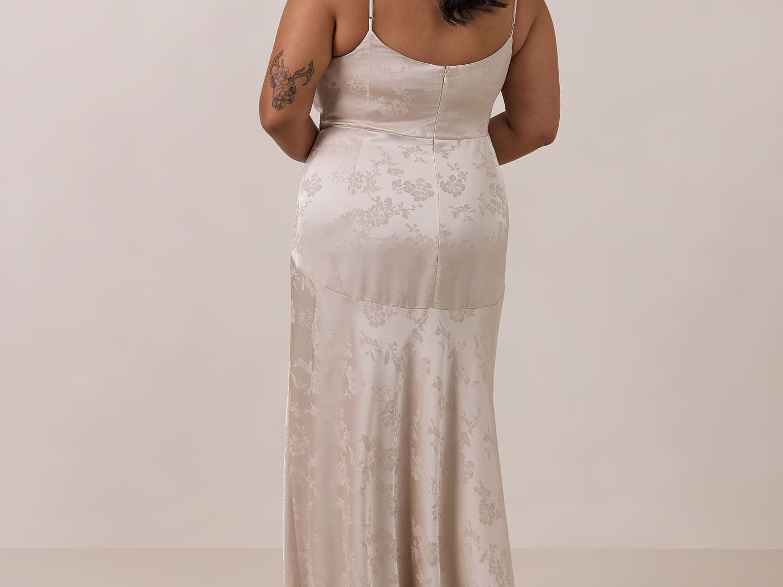 Crafted from luxurious Jacquard satin, this full-length dress features adjustable straps and a flattering drop waist, creating an elegant silhouette with timeless appeal. The scoop neckline and back add a delicate, feminine touch, while the bias-cut skirt flows gracefully to the floor, combining sophistication and comfort for a truly captivating look.