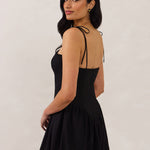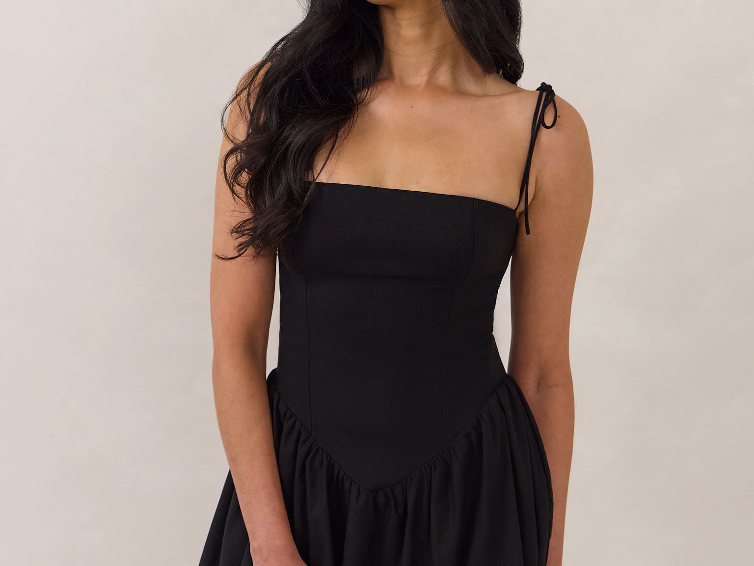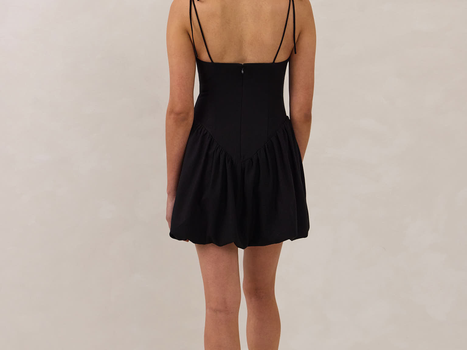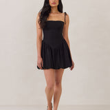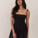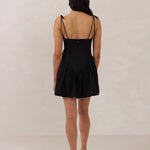 A playful silhouette with just enough edge. The Harlow features a structured bodice with a square neckline, delicate tie straps, and a drop waist that gives way to a voluminous bubble skirt.