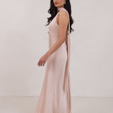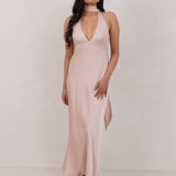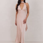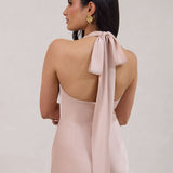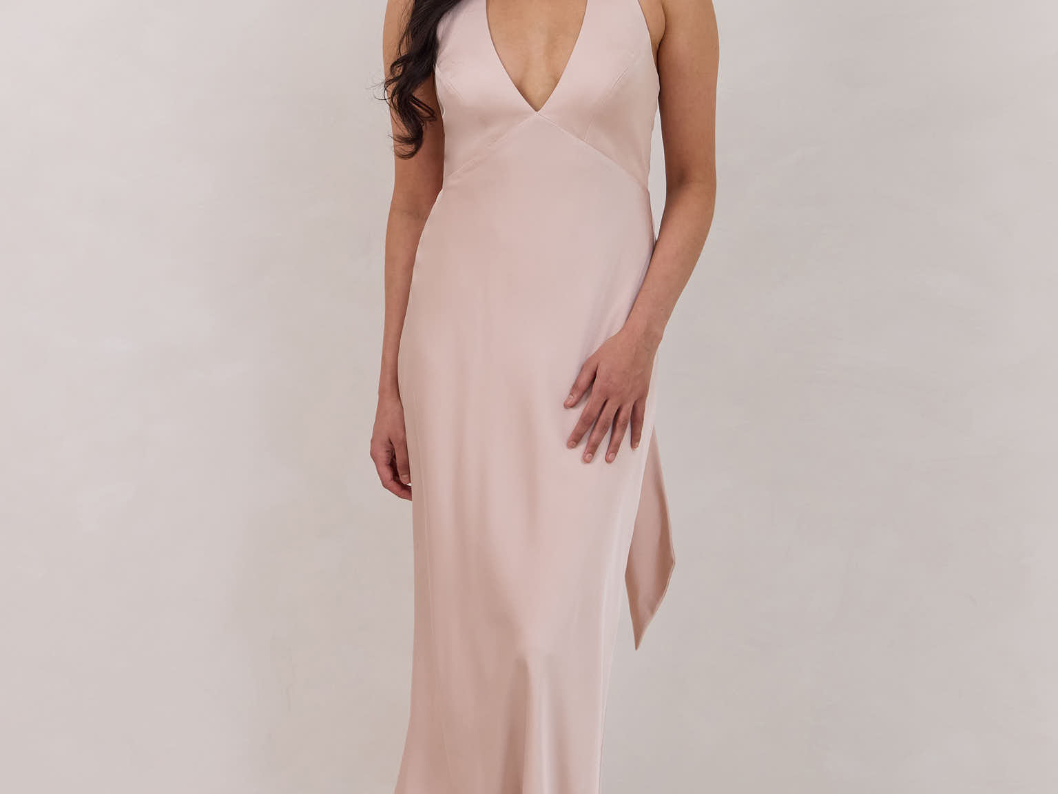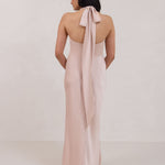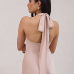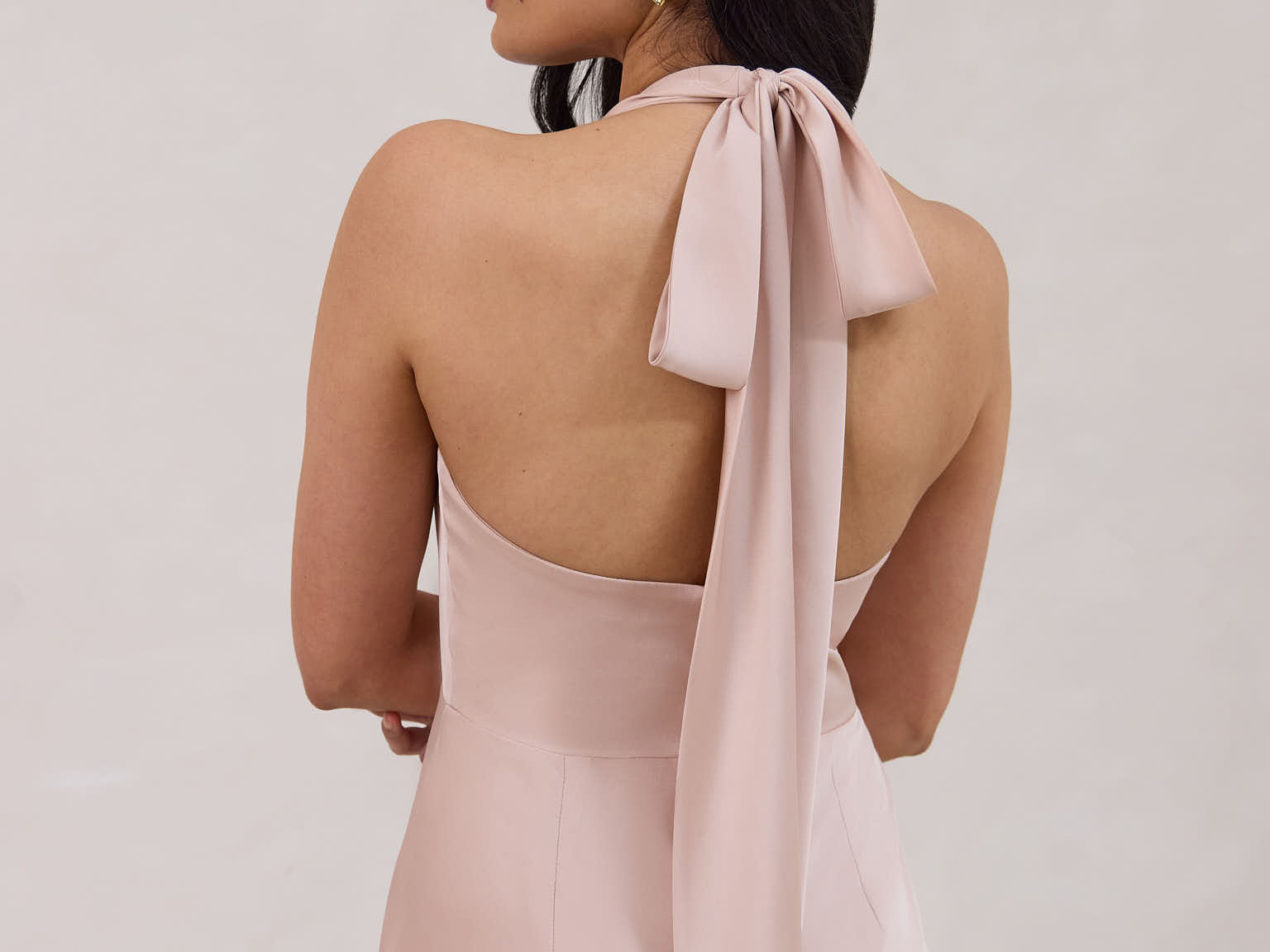 A sleek and versatile silhouette designed for effortless elegance. Featuring a halter neckline with a dramatic open back, it includes long ties that can be styled as a scarf or tied for a custom halter look. The bias-cut skirt flows beautifully for a flattering tea-length fit.
