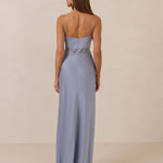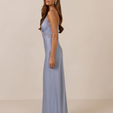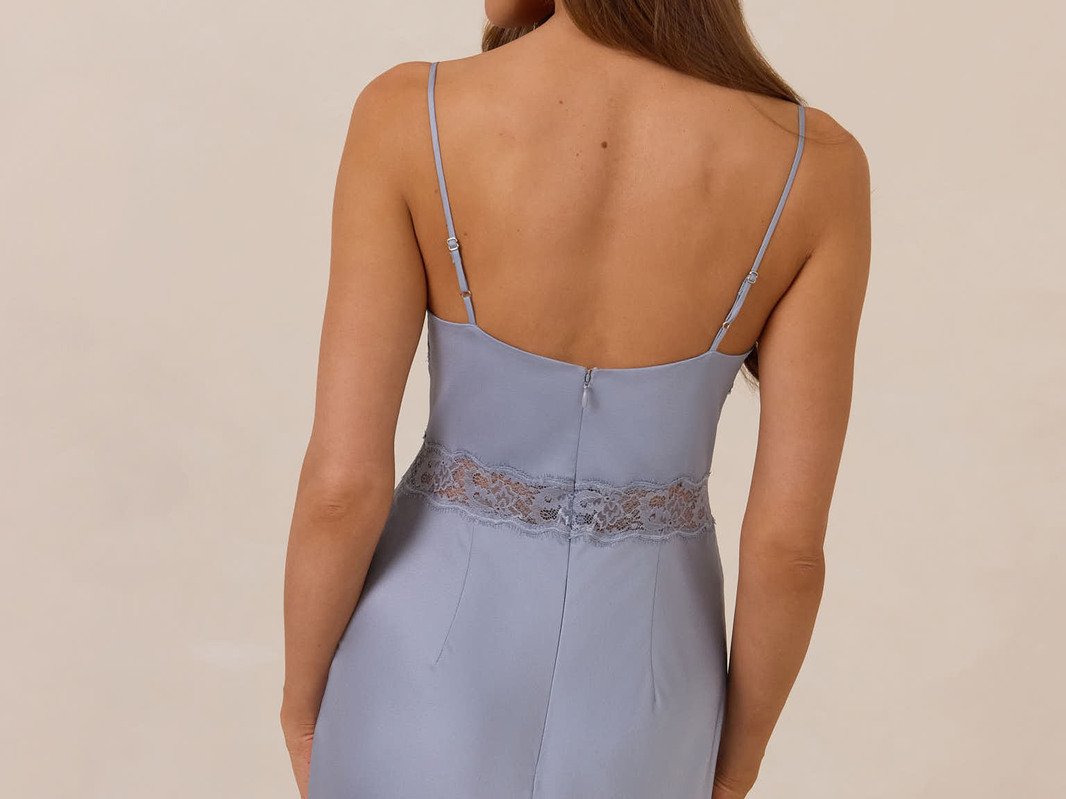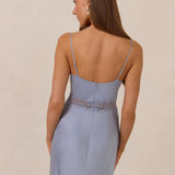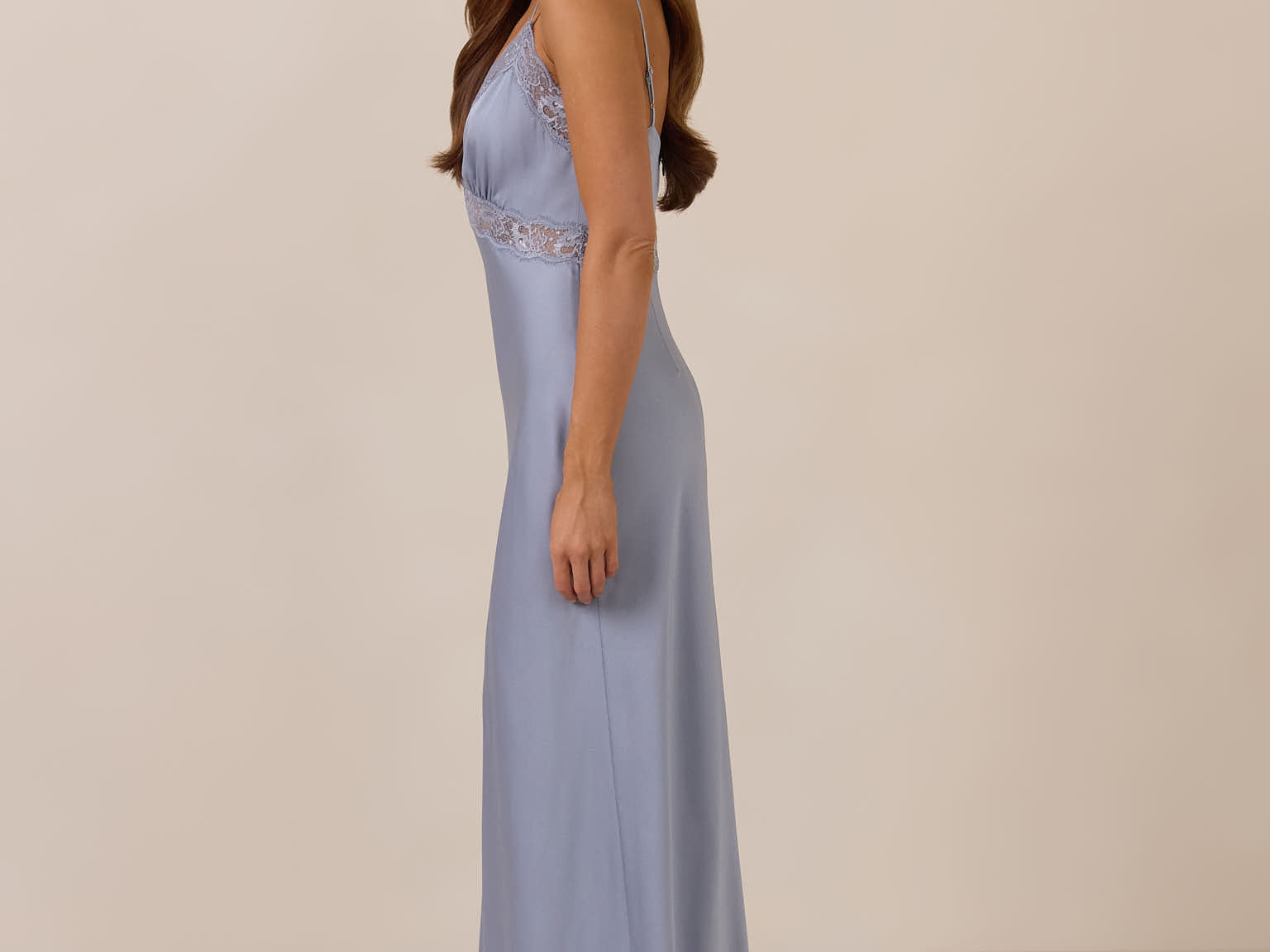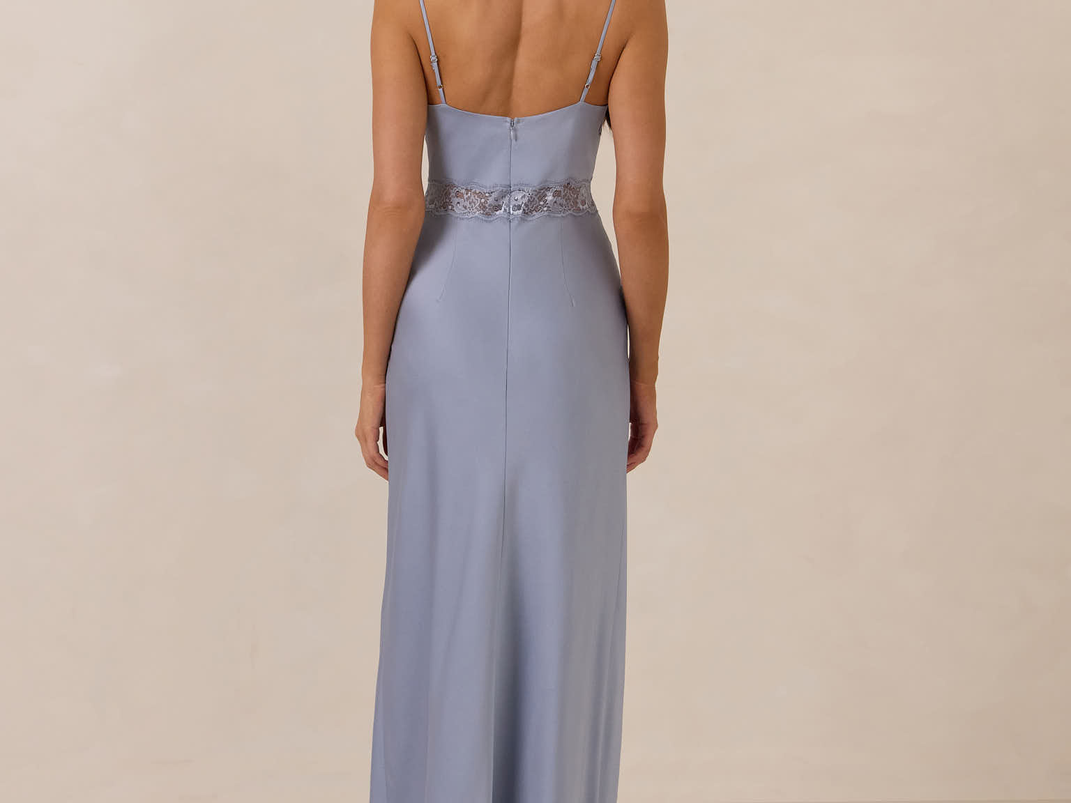 The Theodora is an elevated take on the classic slip dress, made from satin and cut on a bias for an elegant drape. It features a deep lace-trimmed neckline for a romantic touch. This full-length dress offers a fitted silhouette with adjustable straps and a discreet side zip, creating an effortlessly impactful look.