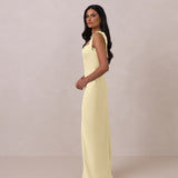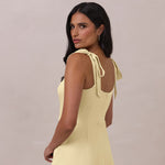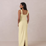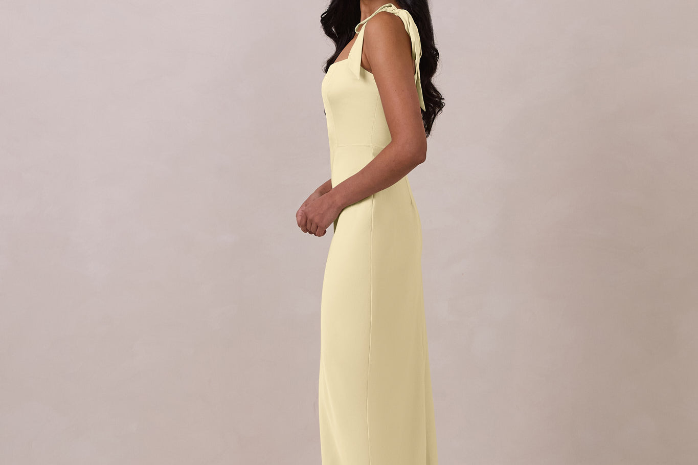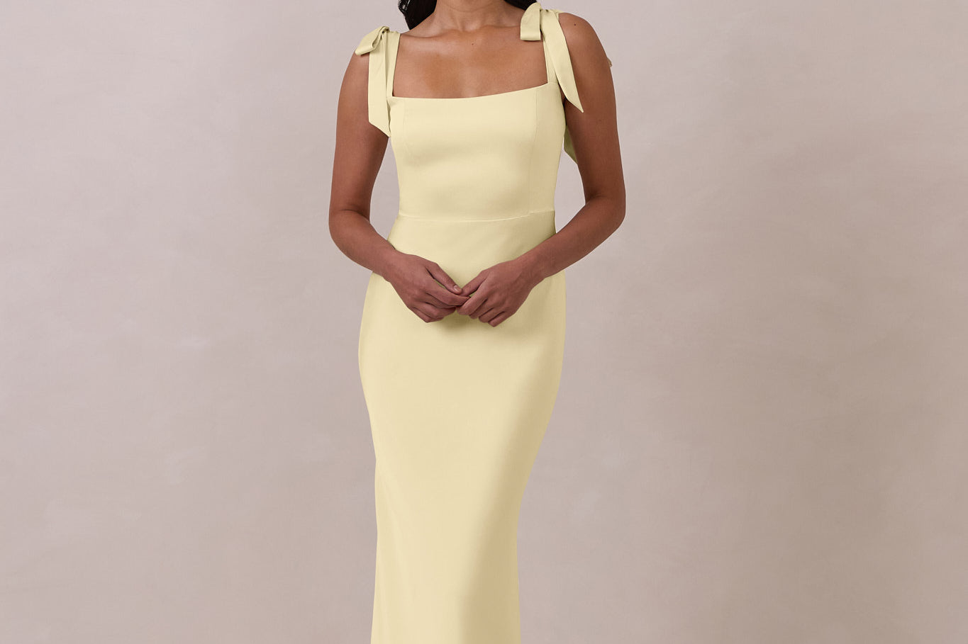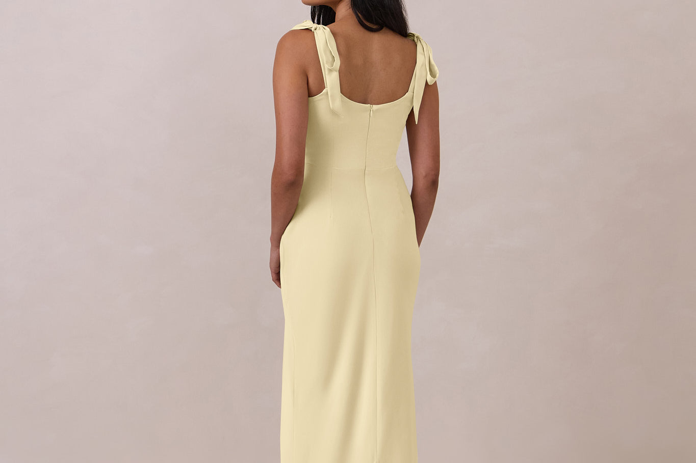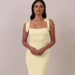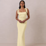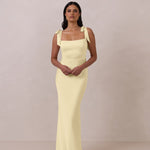This full-length dress, made from luxurious satin, features a sleek square neckline and thick tie straps, offering a structured yet effortless aesthetic. The slim-fit skirt gently embraces the body, creating a smooth and elongated silhouette. An invisible back zipper ensures a seamless finish, making this dress ideal for sophisticated evening events.