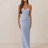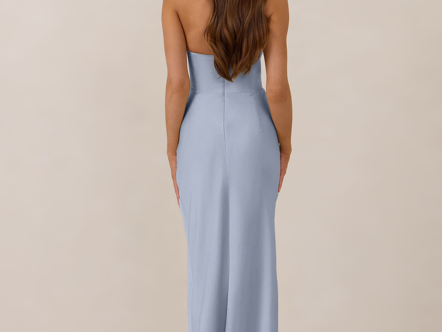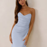 Designed with a scoop sweetheart neckline and soft pleating through the boned bodice and skirt, this dress creates a sleek, feminine silhouette. Elegant and timeless, it’s an ideal choice for weddings, receptions, or any formal occasion.