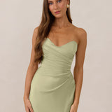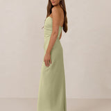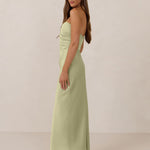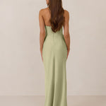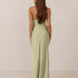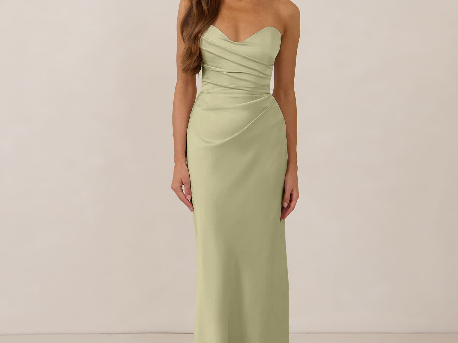 Designed with a scoop sweetheart neckline and soft pleating through the boned bodice and skirt, this dress creates a sleek, feminine silhouette. Elegant and timeless, it’s an ideal choice for weddings, receptions, or any formal occasion.